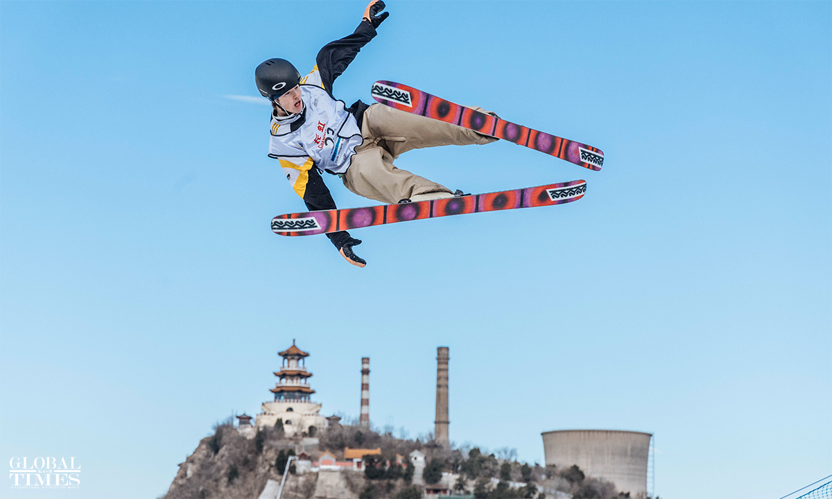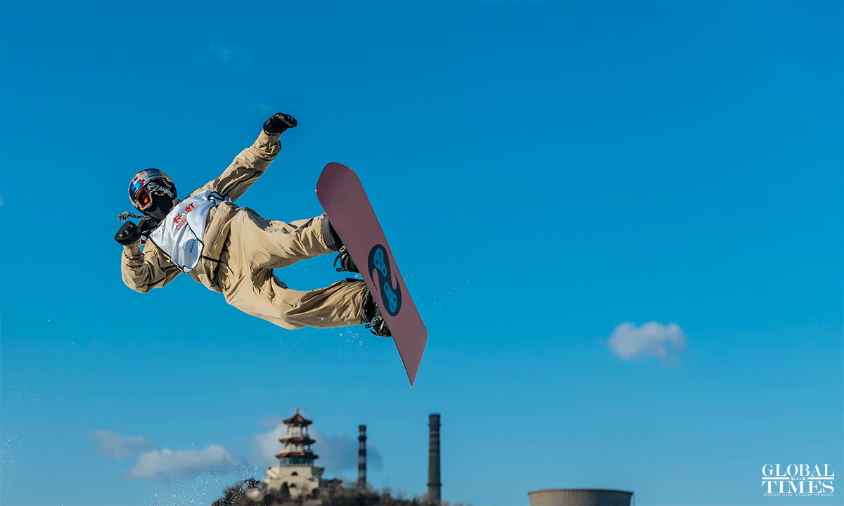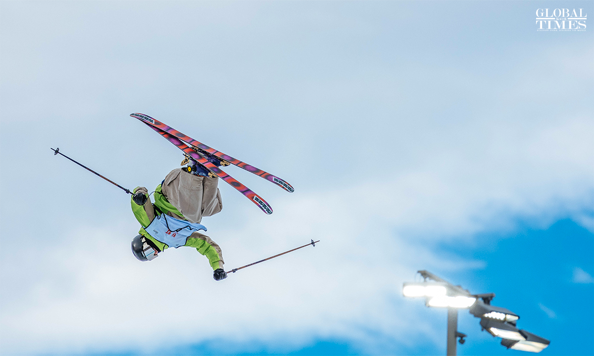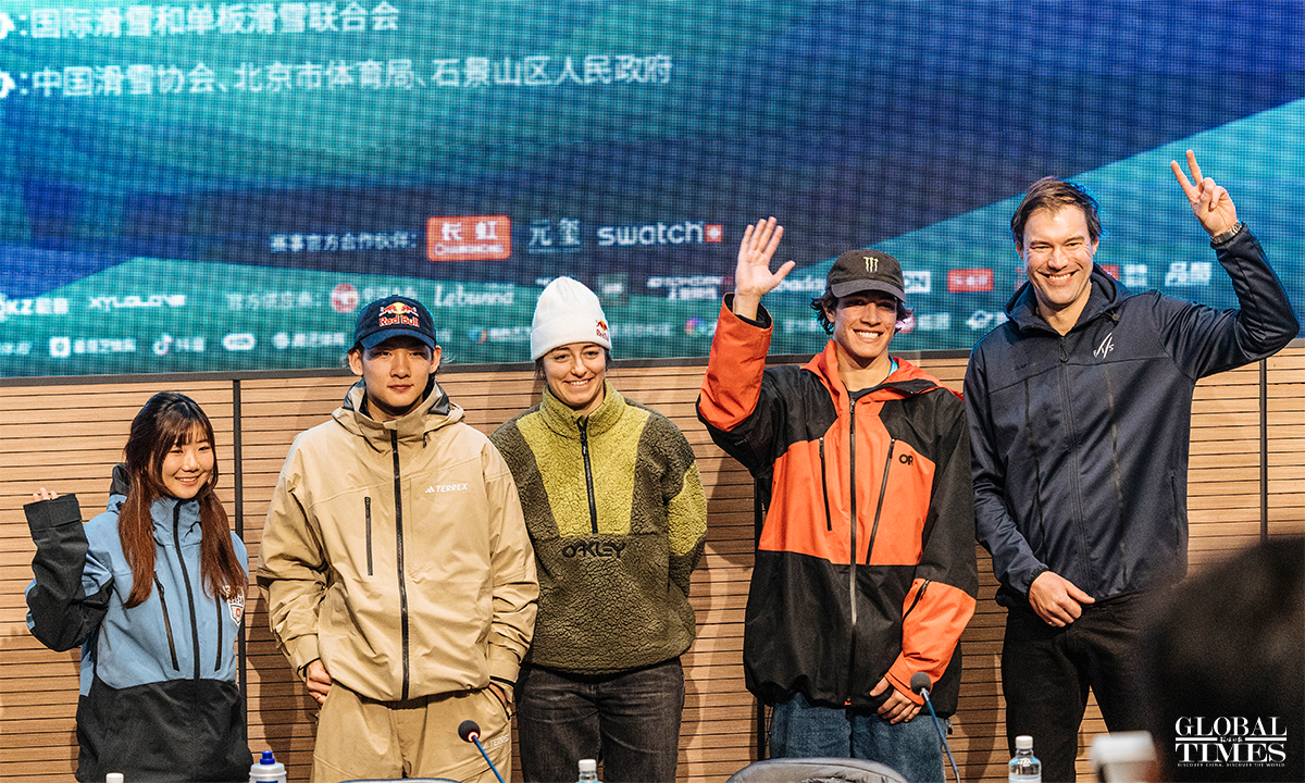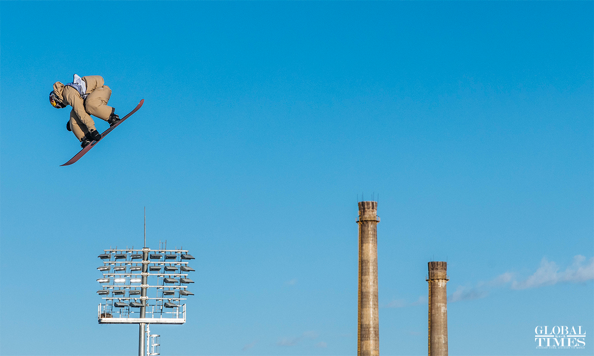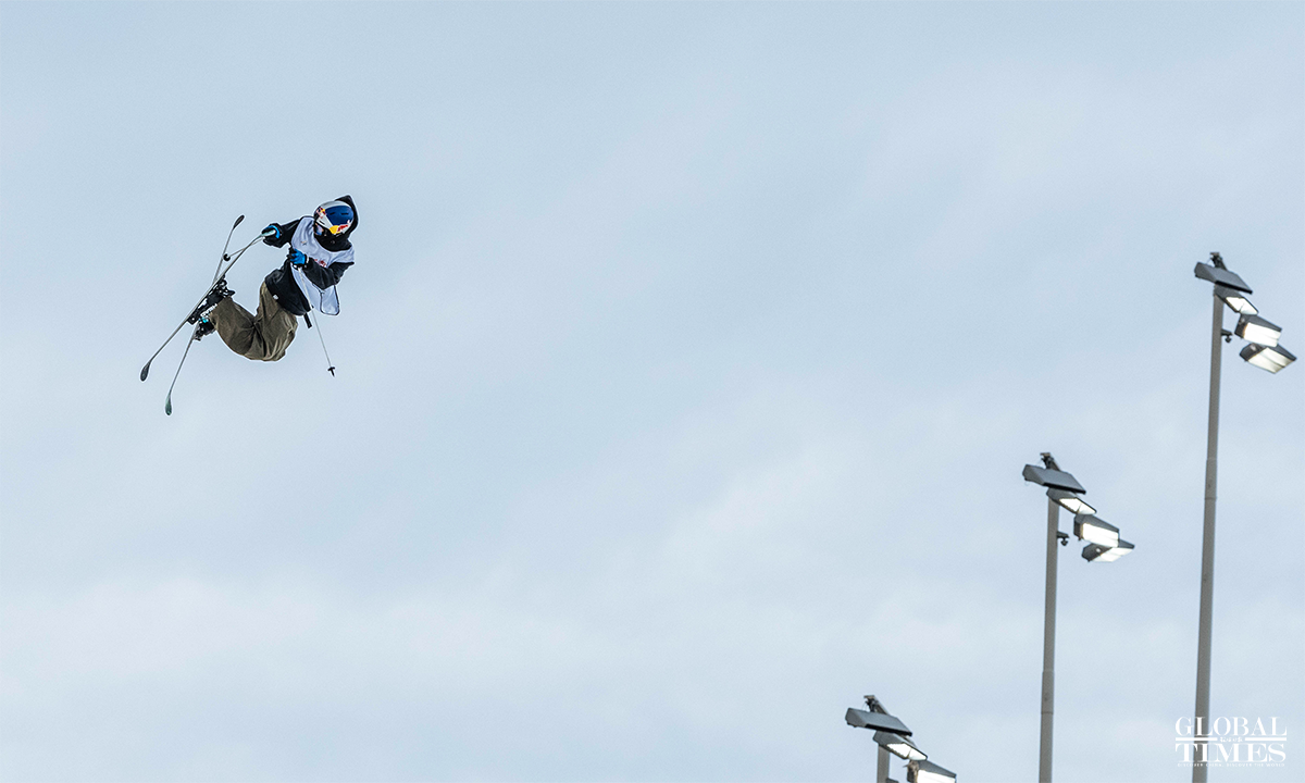 Athletes prepare for the Freeski big air World Cup at Shougang Park in Beijing on Thursday. China's Olympic champion Su Yiming (in beige), the event's marquee player, will join the competition which runs from Friday to Sunday and features 75 freestyle and 81 snowboard athletes. Photos: Li Hao/GT