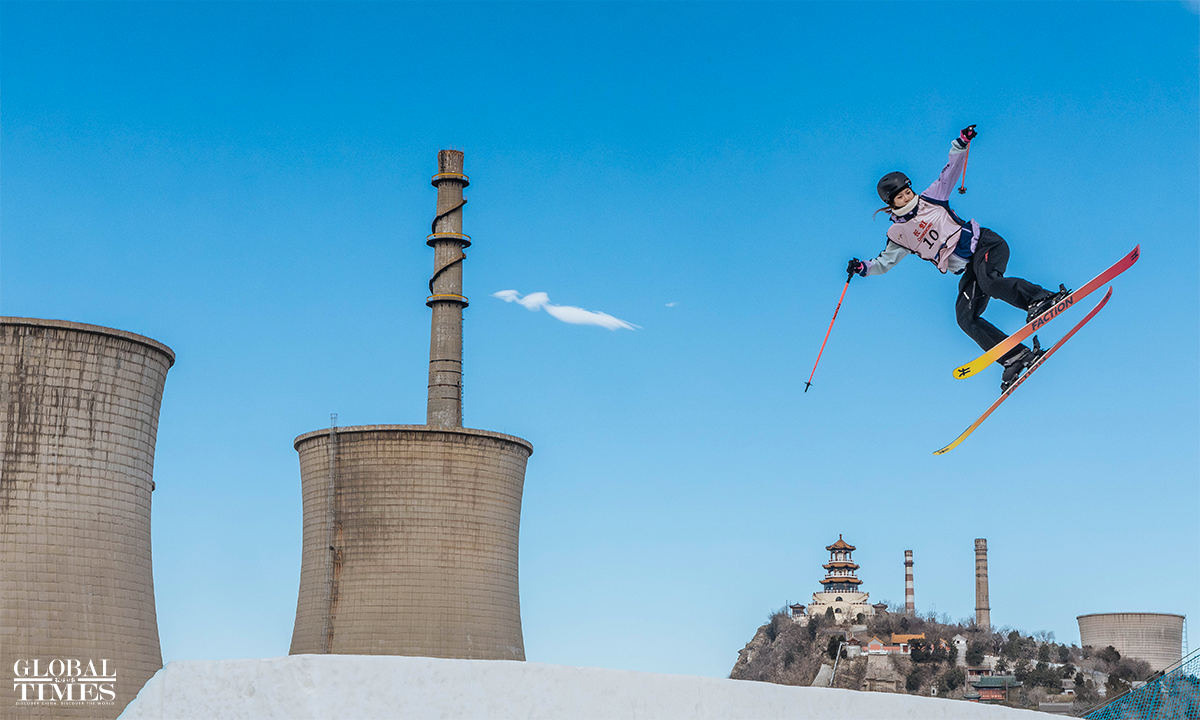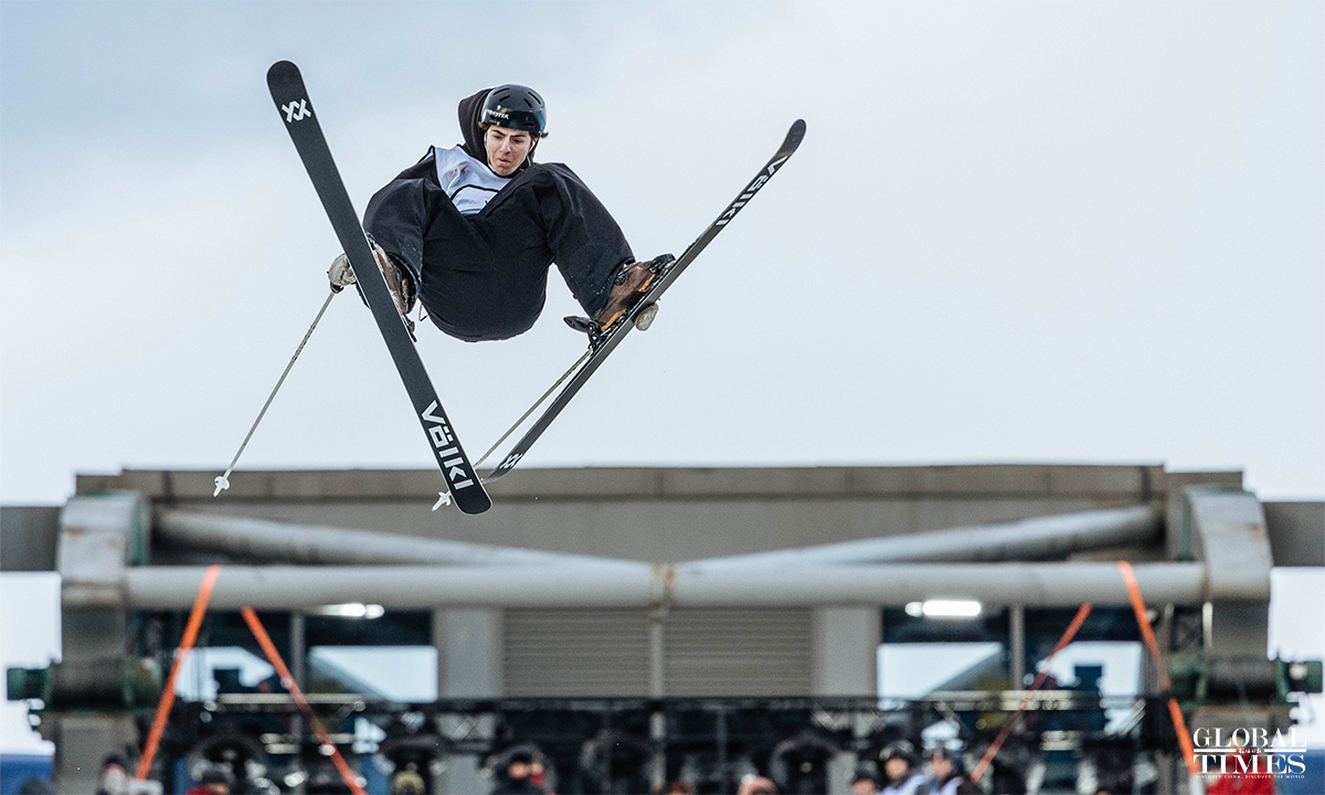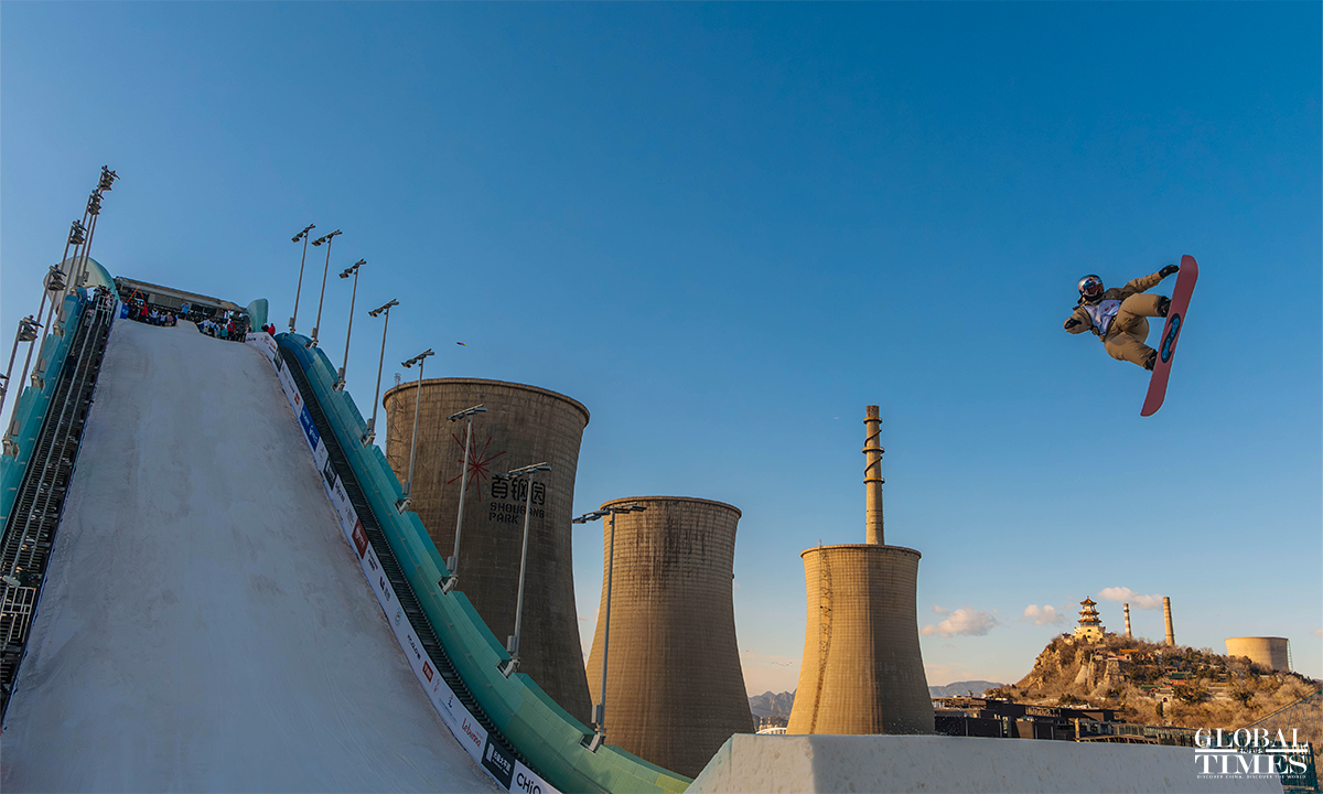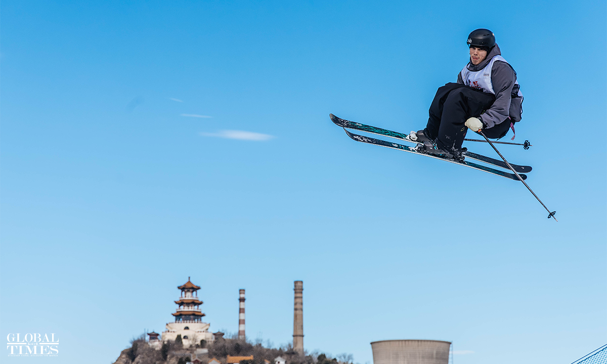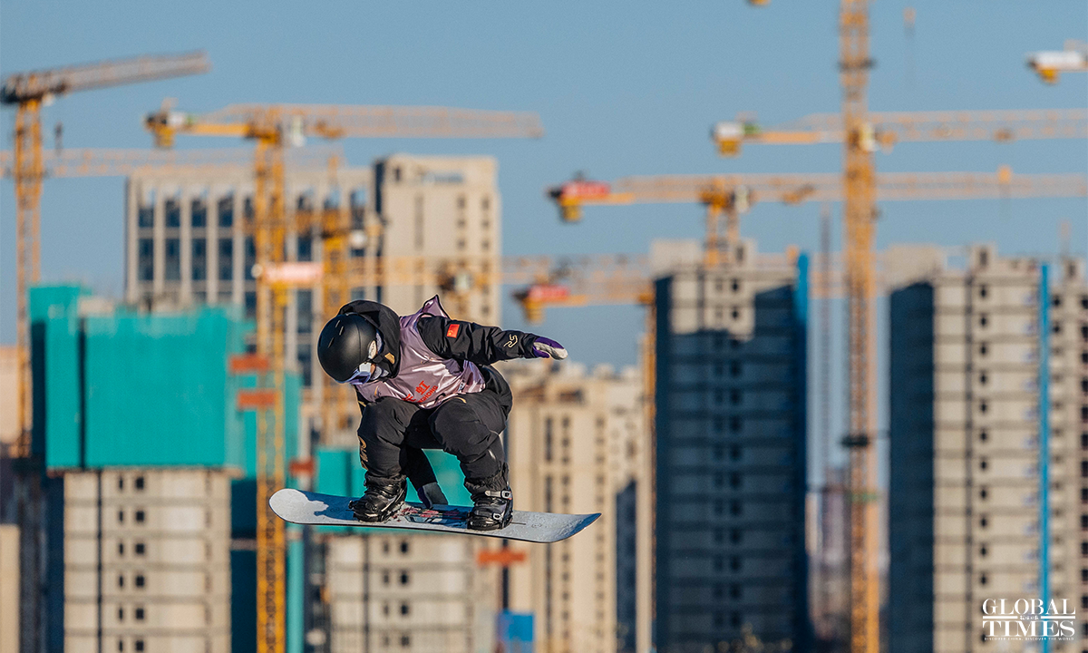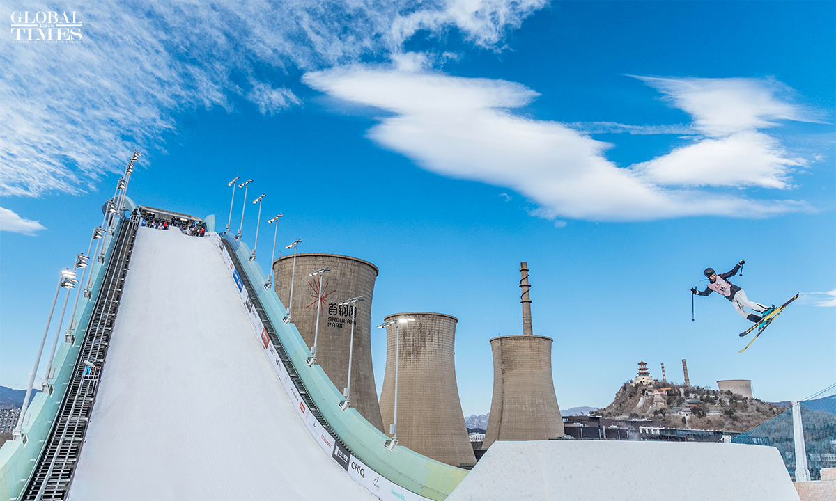 Athletes prepare for the Freeski big air World Cup at Shougang Park in Beijing on Thursday. China's Olympic champion Su Yiming (in beige), the event's marquee player, will join the competition which runs from Friday to Sunday and features 75 freestyle and 81 snowboard athletes. Photos: Li Hao/GT