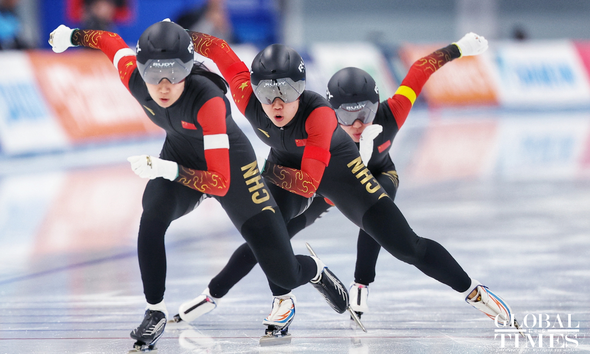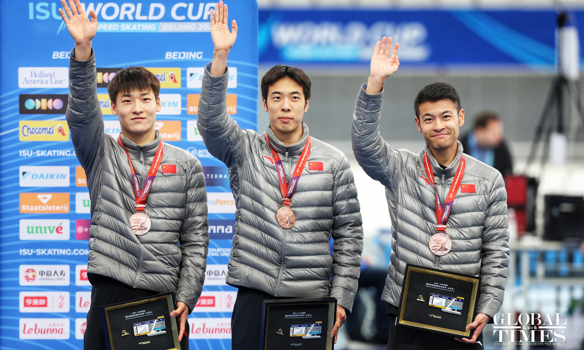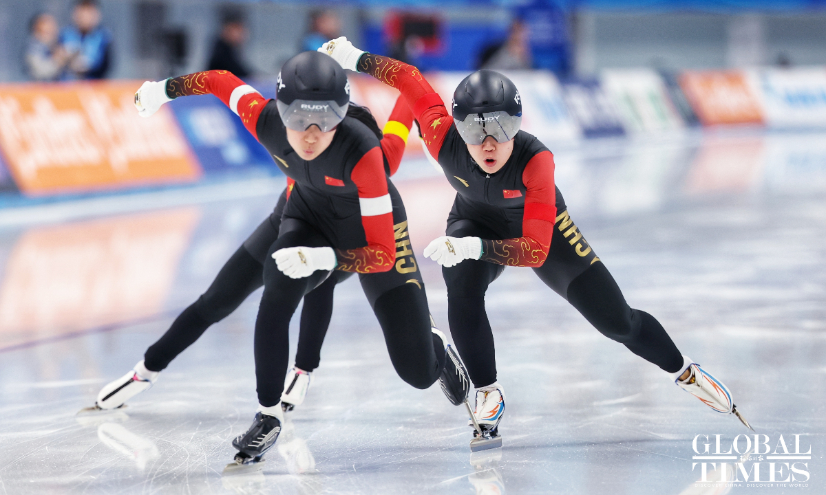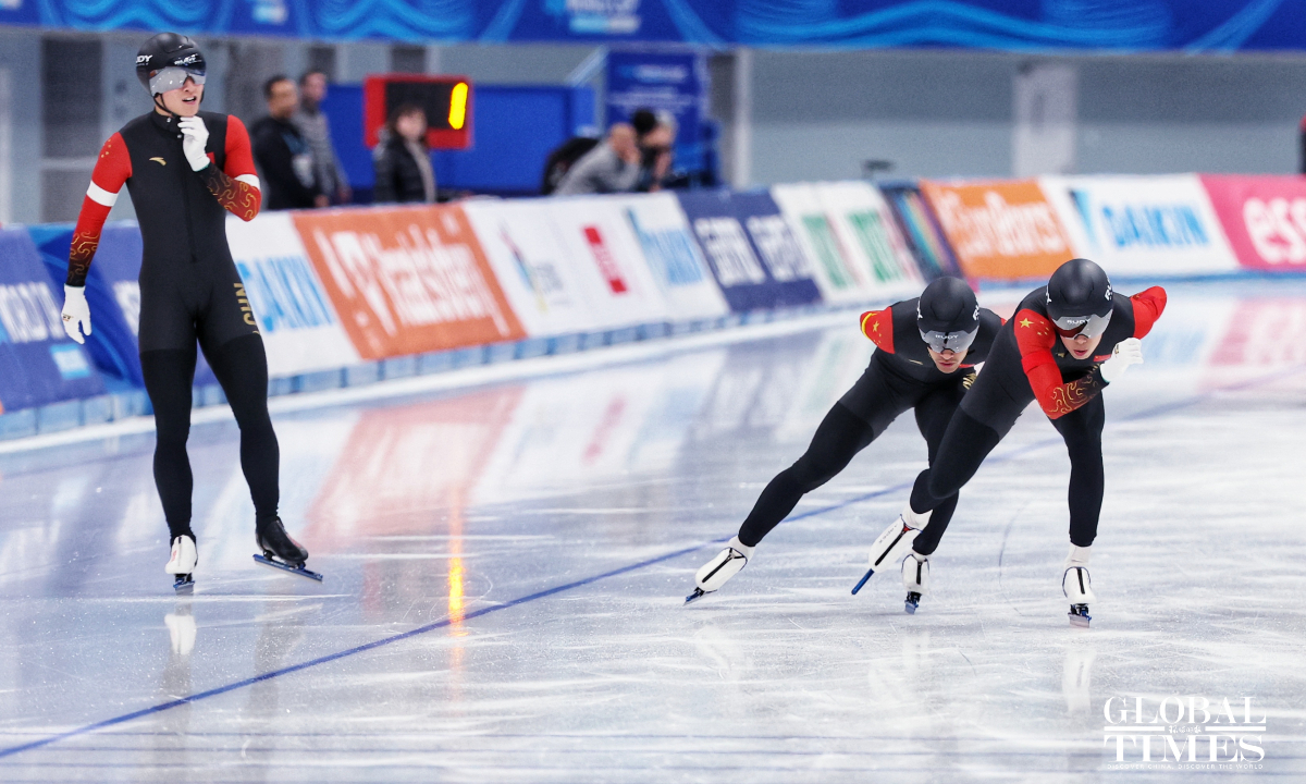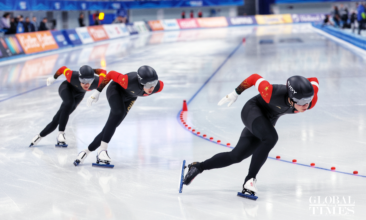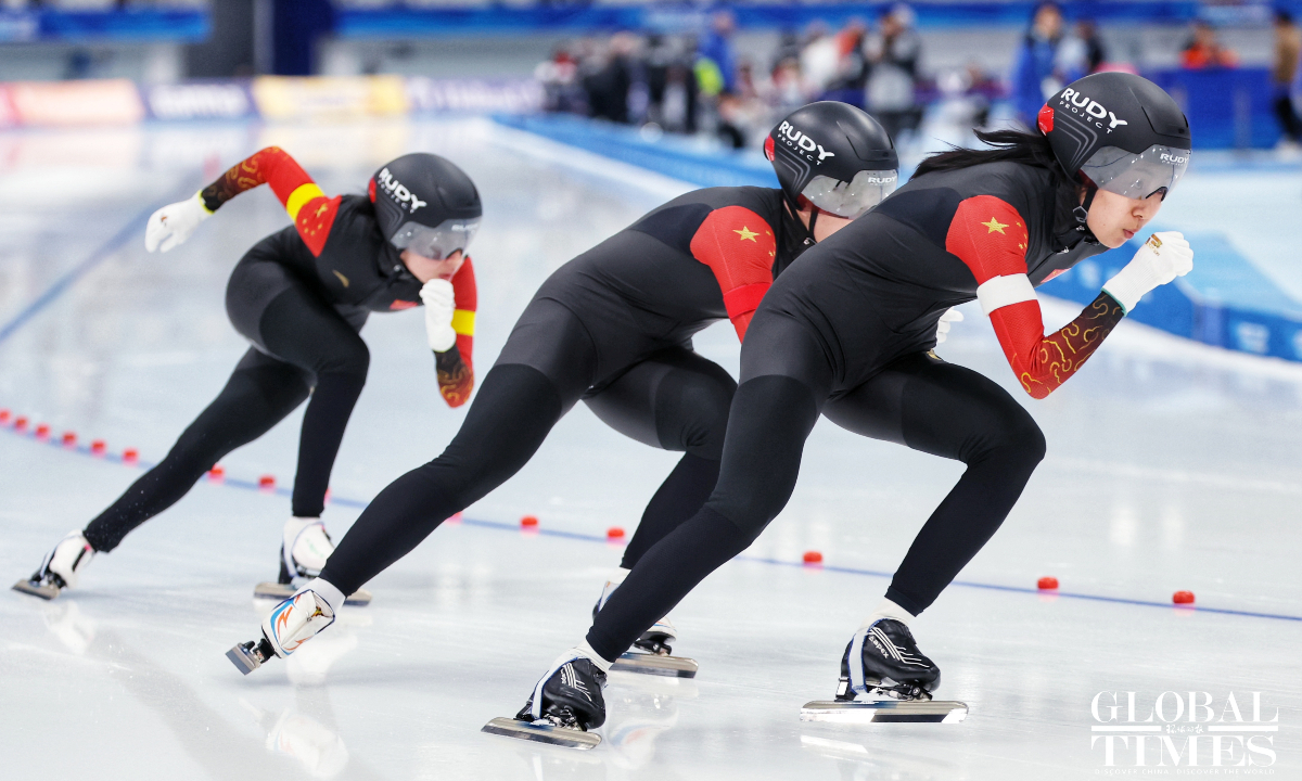 China's Liu Bin, Lian Ziwen and Ning Zhongyan won the bronze medal in the Men's Team Sprint Pursuit with a time of 1:18.61 at the 2024-2025 ISU World Cup Speed Skating event in Beijing on December 1. The Chinese team of Han Mei, Tian Ruining, and Pei Chong finished fifth in the Women's Team Sprint Pursuit with a time of 1:27.79. The Netherlands won the championship. The ISU World Cup Speed Skating in Beijing began on November 29 and concluded on December 1. (Photos: Cui Meng/GT)