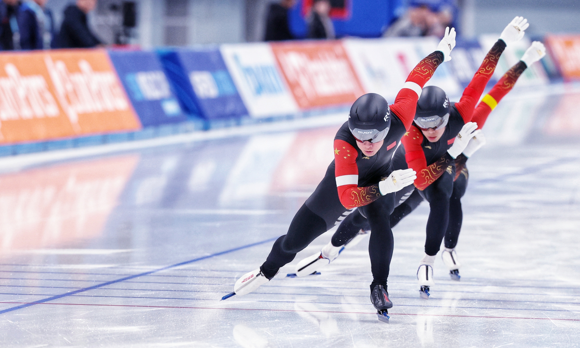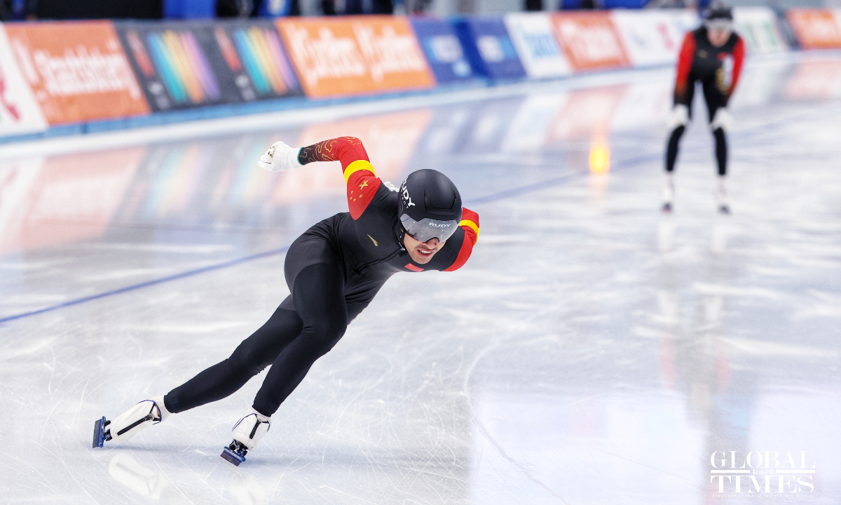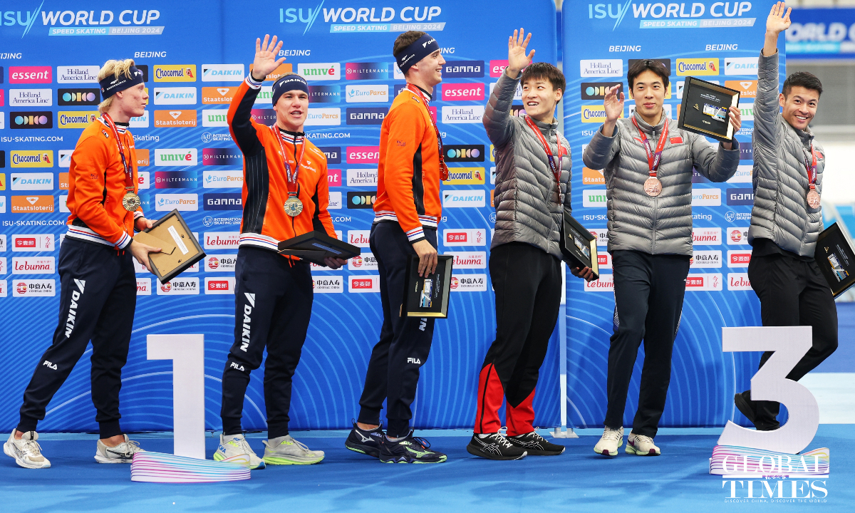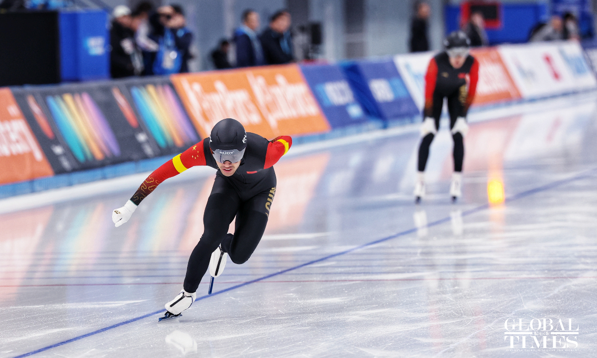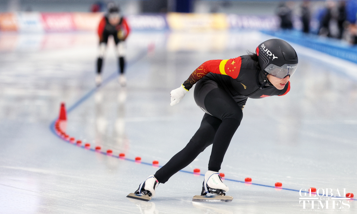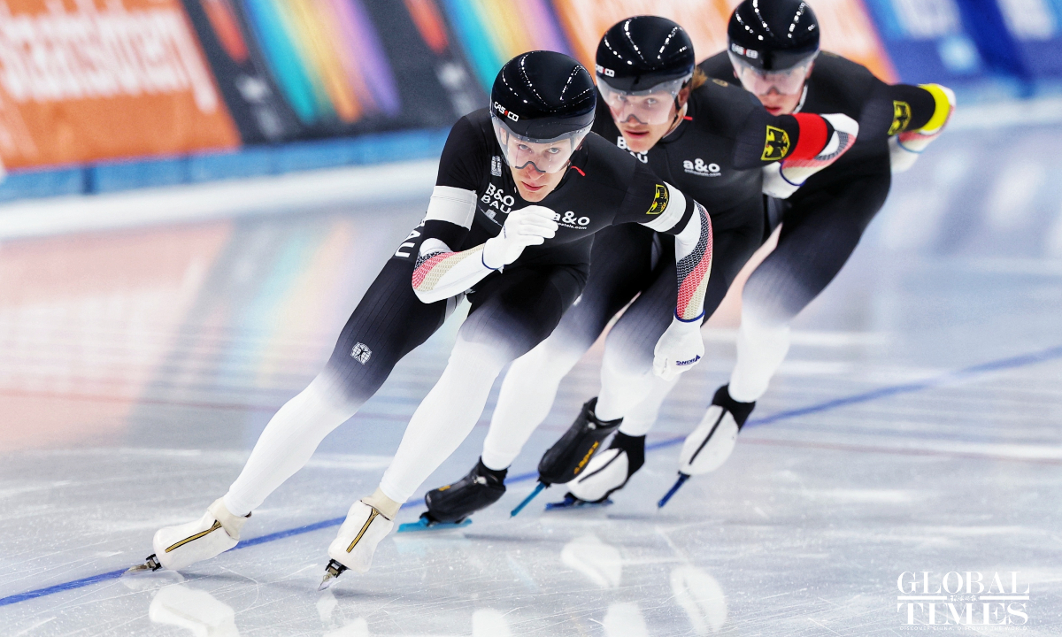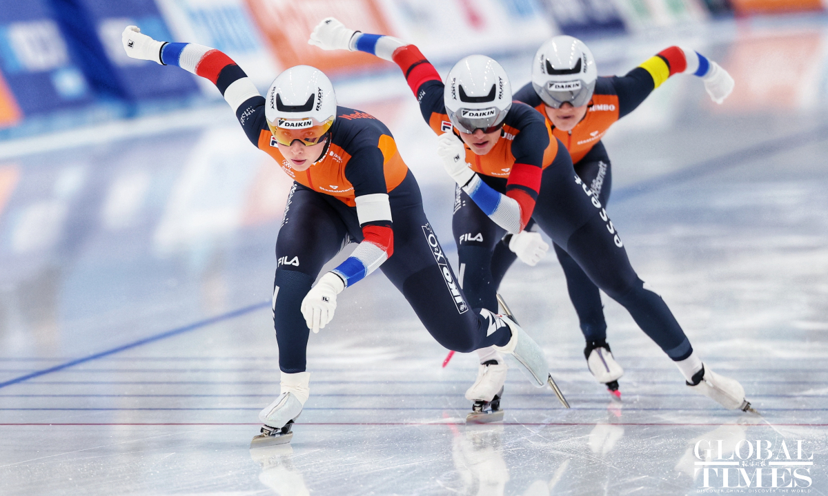 China's Liu Bin, Lian Ziwen and Ning Zhongyan won the bronze medal in the Men's Team Sprint Pursuit with a time of 1:18.61 at the 2024-2025 ISU World Cup Speed Skating event in Beijing on December 1. The Chinese team of Han Mei, Tian Ruining, and Pei Chong finished fifth in the Women's Team Sprint Pursuit with a time of 1:27.79. The Netherlands won the championship. The ISU World Cup Speed Skating in Beijing began on November 29 and concluded on December 1. (Photos: Cui Meng/GT)
