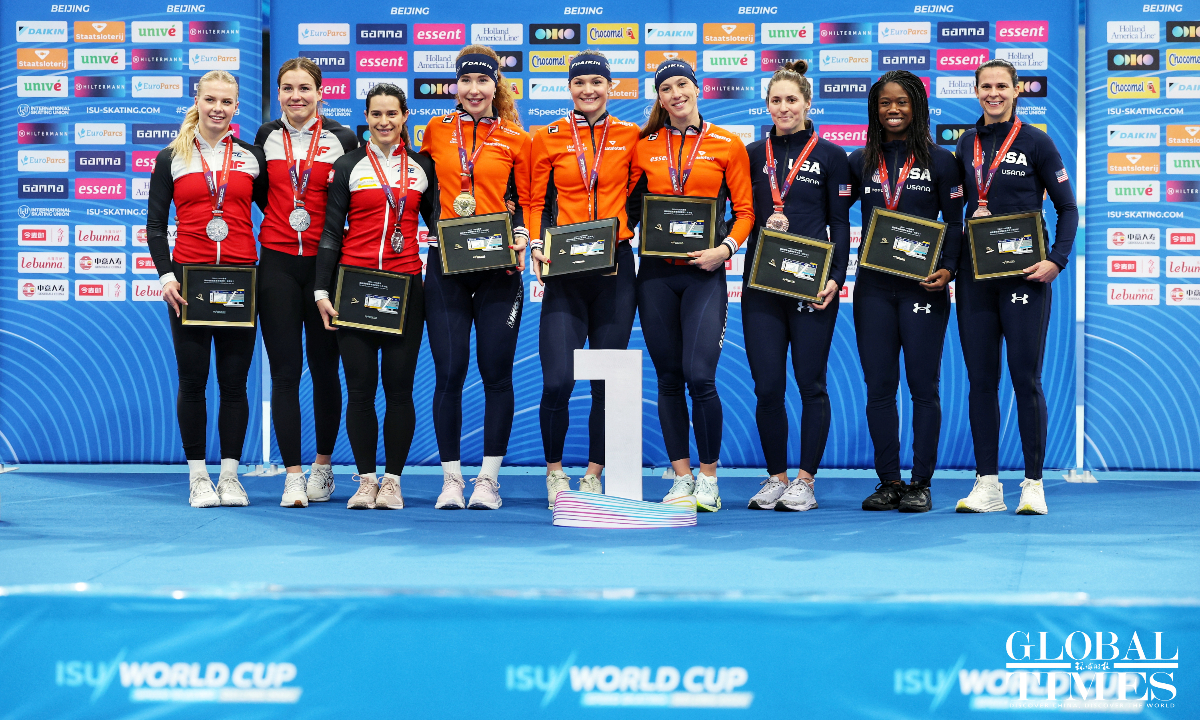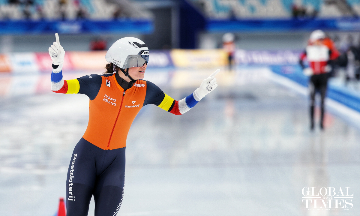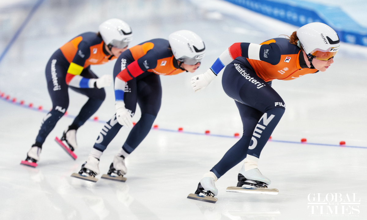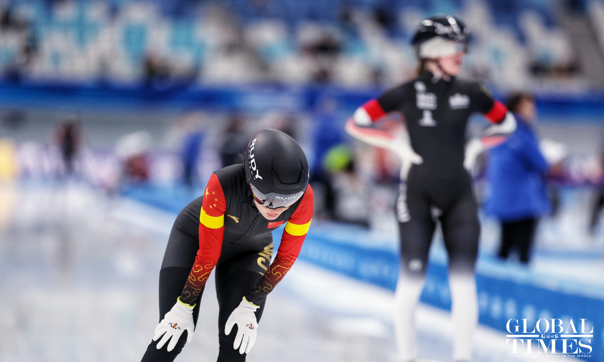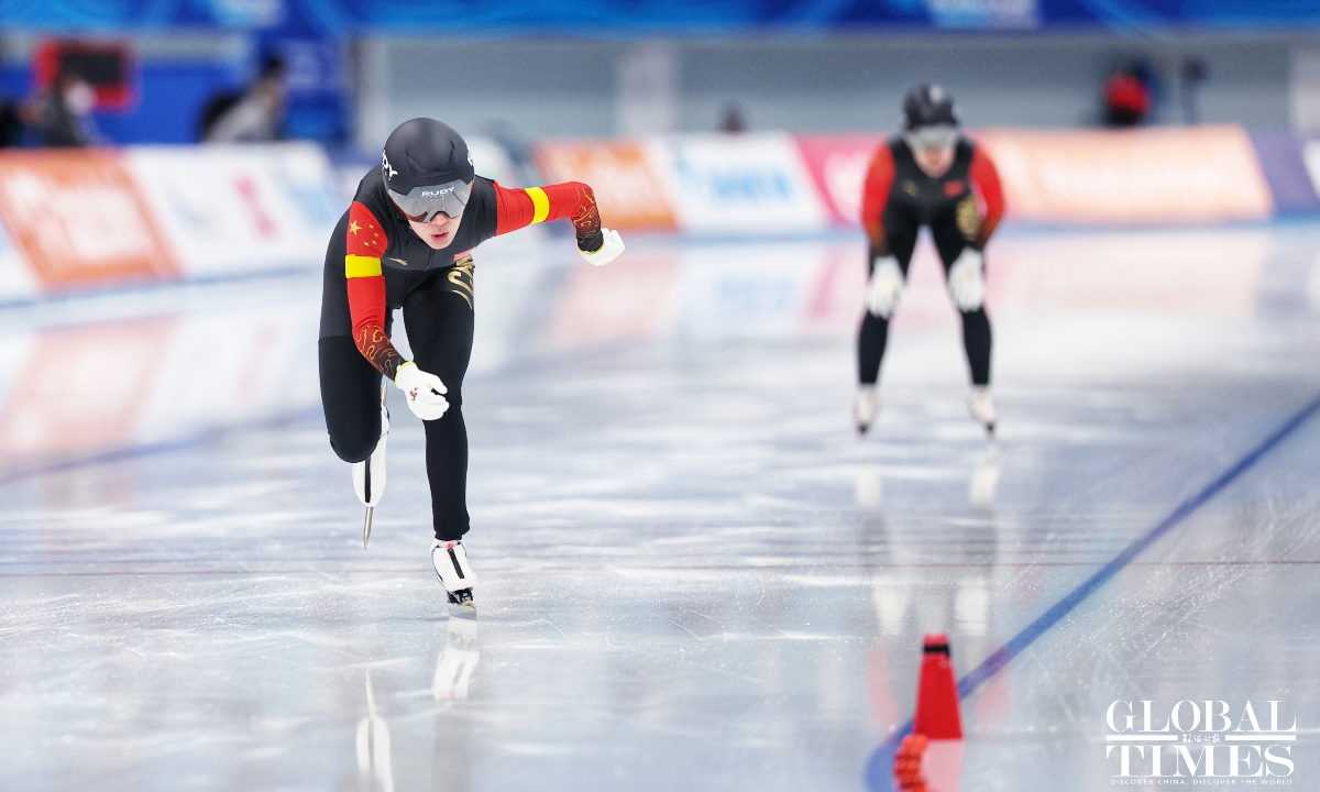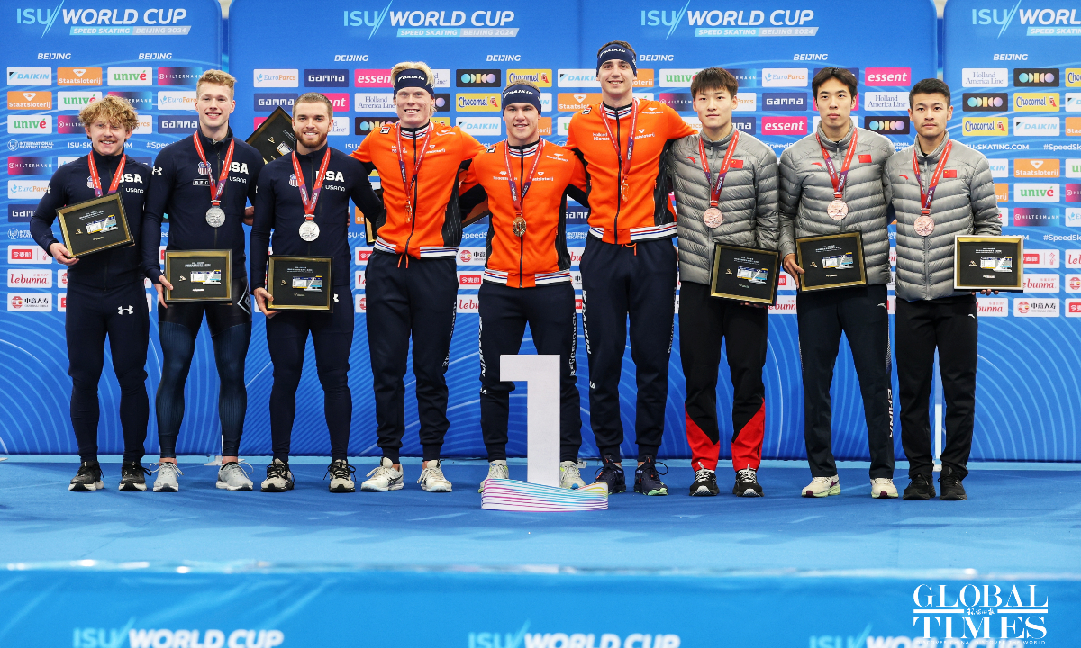 China's Liu Bin, Lian Ziwen and Ning Zhongyan won the bronze medal in the Men's Team Sprint Pursuit with a time of 1:18.61 at the 2024-2025 ISU World Cup Speed Skating event in Beijing on December 1. The Chinese team of Han Mei, Tian Ruining, and Pei Chong finished fifth in the Women's Team Sprint Pursuit with a time of 1:27.79. The Netherlands won the championship. The ISU World Cup Speed Skating in Beijing began on November 29 and concluded on December 1. (Photos: Cui Meng/GT)