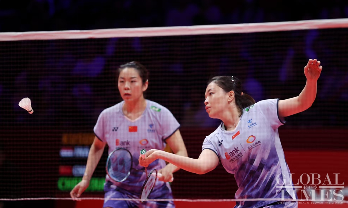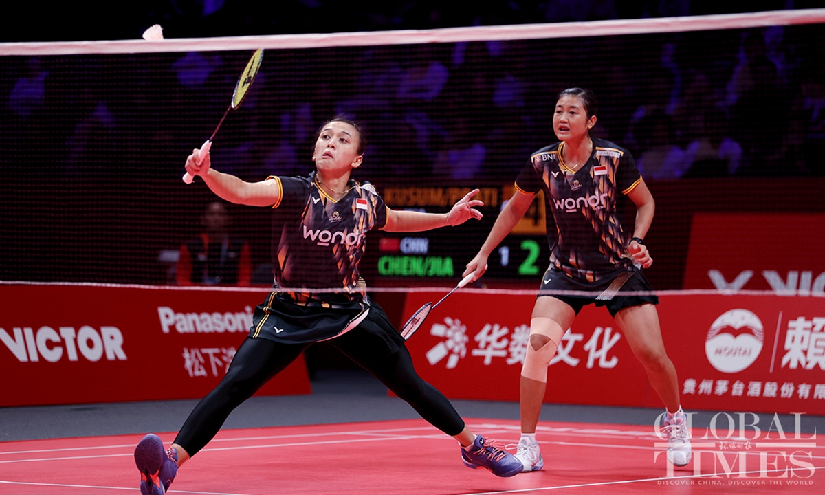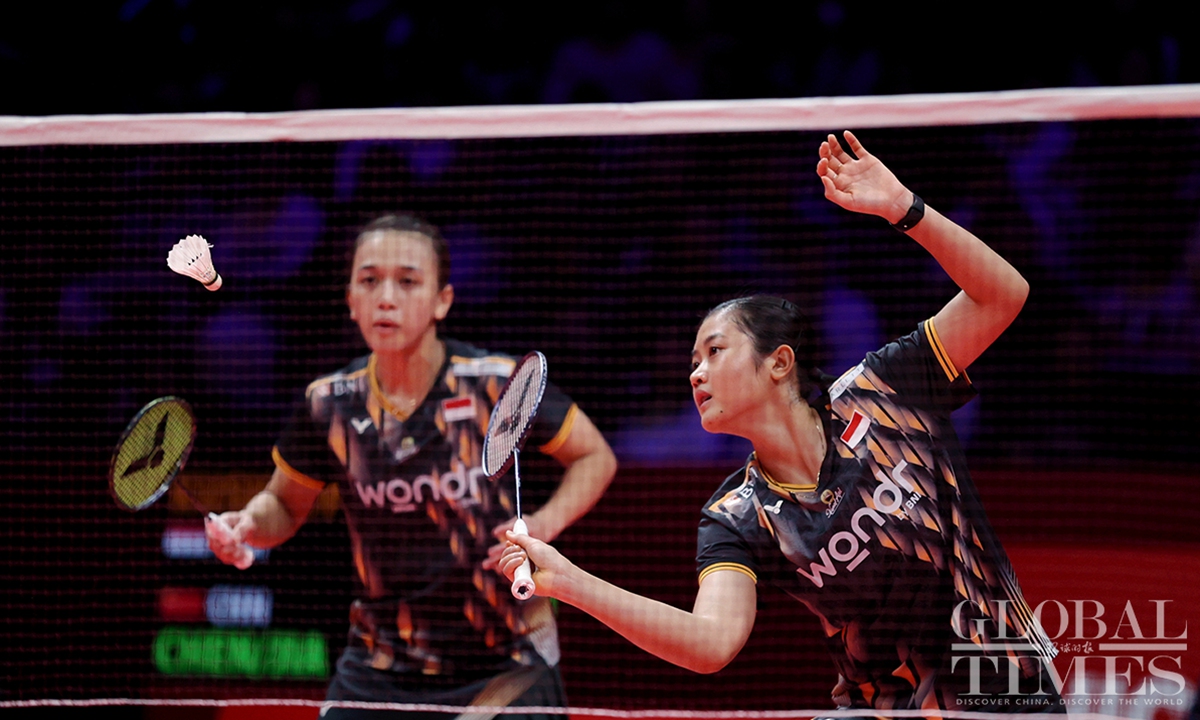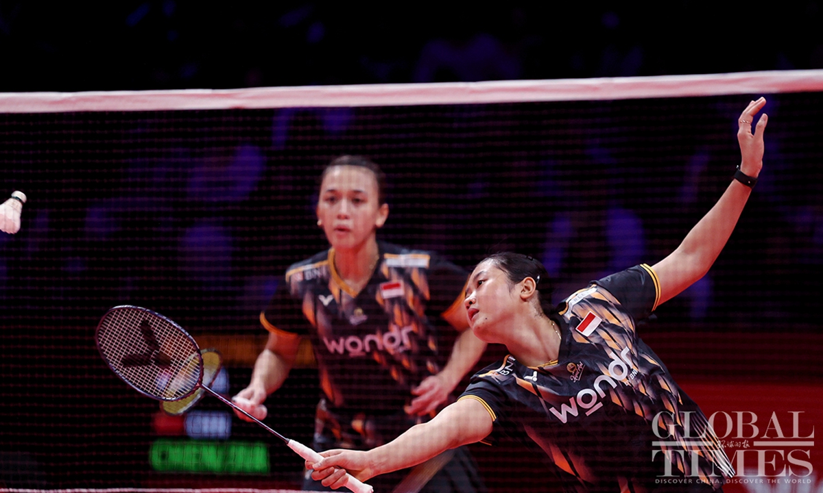 Chinese Olympic champions Chen Qingchen and Jia Yifan cruised to a 2-0 victory (21-12, 21-10) over Indonesia’s Kusuma/Amalia in the women’s doubles Group B match of the BWF World Tour Finals in Hangzhou, East China’s Zhejiang Province on December 13, 2024. The dominant performance sealed their third consecutive win in the group stage, earning them the top spot and a place in the semifinals. (Photo: Cui Meng/GT)