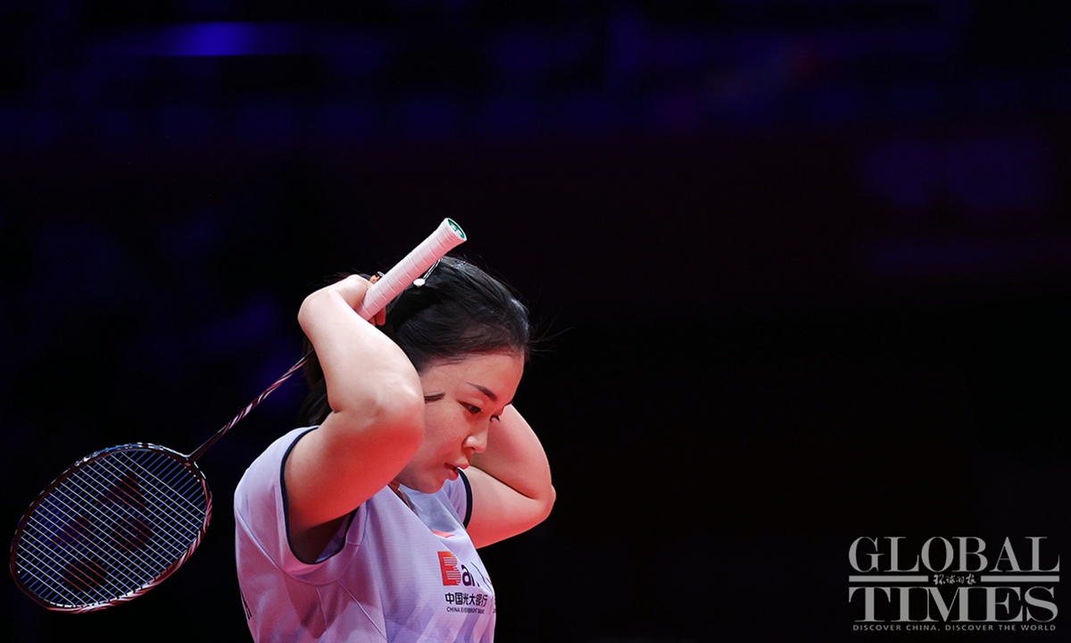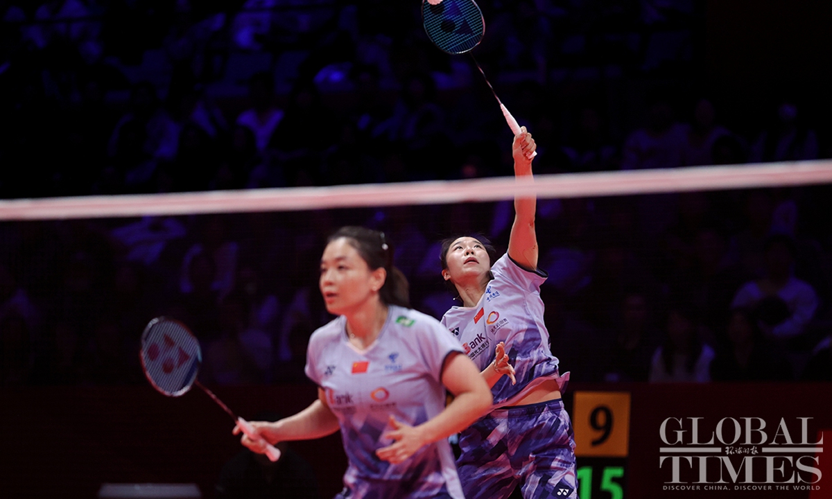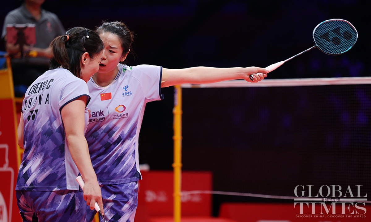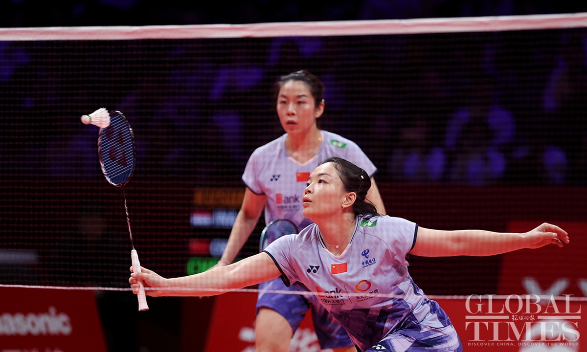 Chinese Olympic champions Chen Qingchen and Jia Yifan cruised to a 2-0 victory (21-12, 21-10) over Indonesia’s Kusuma/Amalia in the women’s doubles Group B match of the BWF World Tour Finals in Hangzhou, East China’s Zhejiang Province on December 13, 2024. The dominant performance sealed their third consecutive win in the group stage, earning them the top spot and a place in the semifinals. (Photo: Cui Meng/GT)