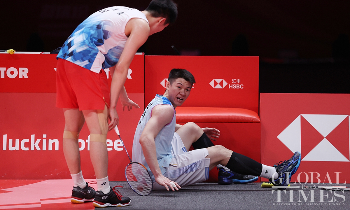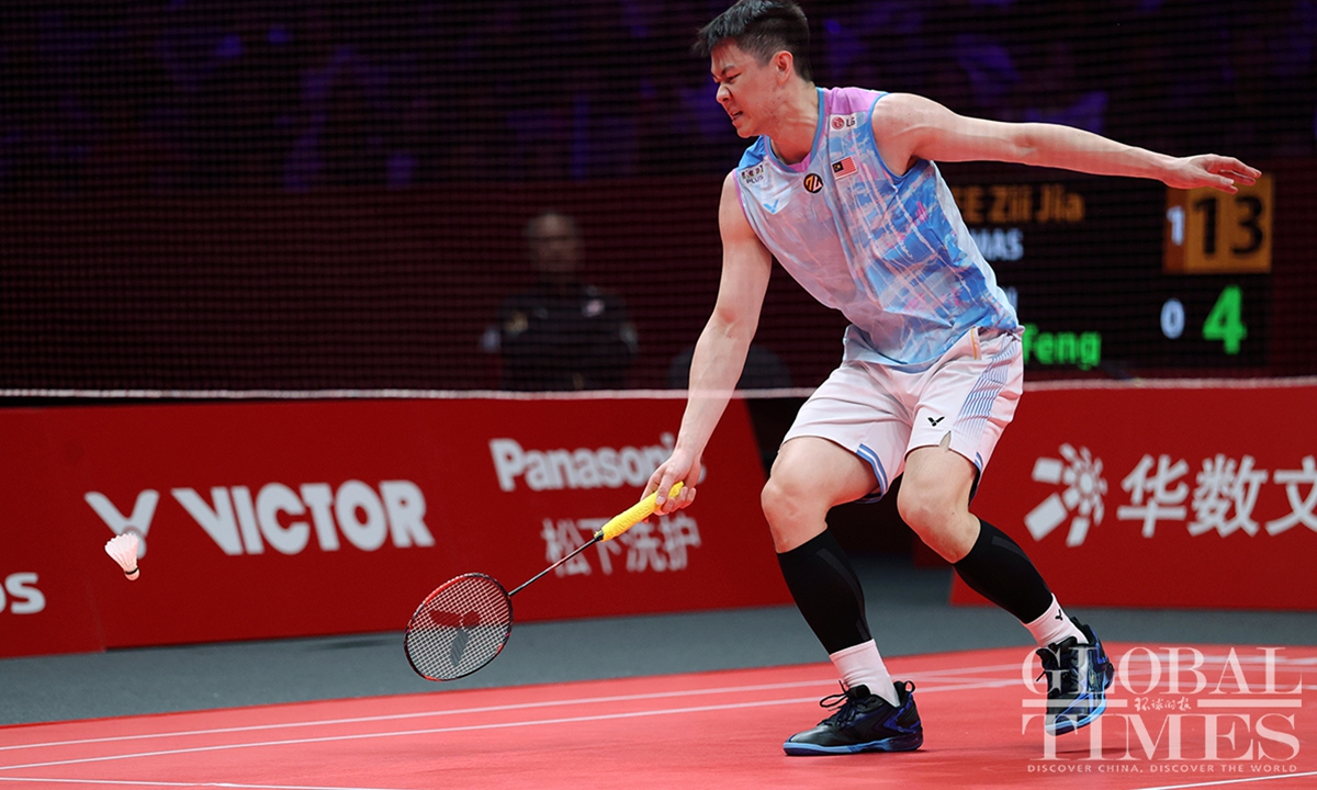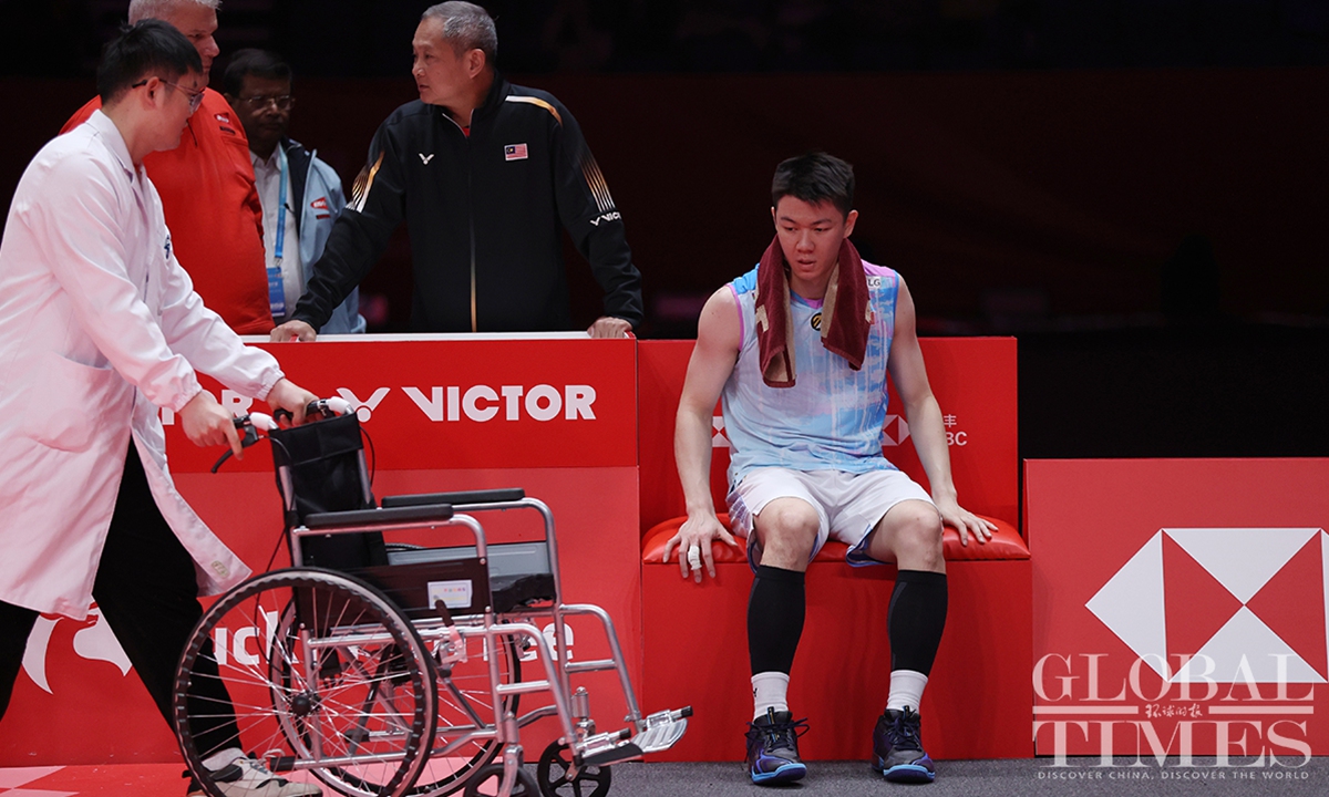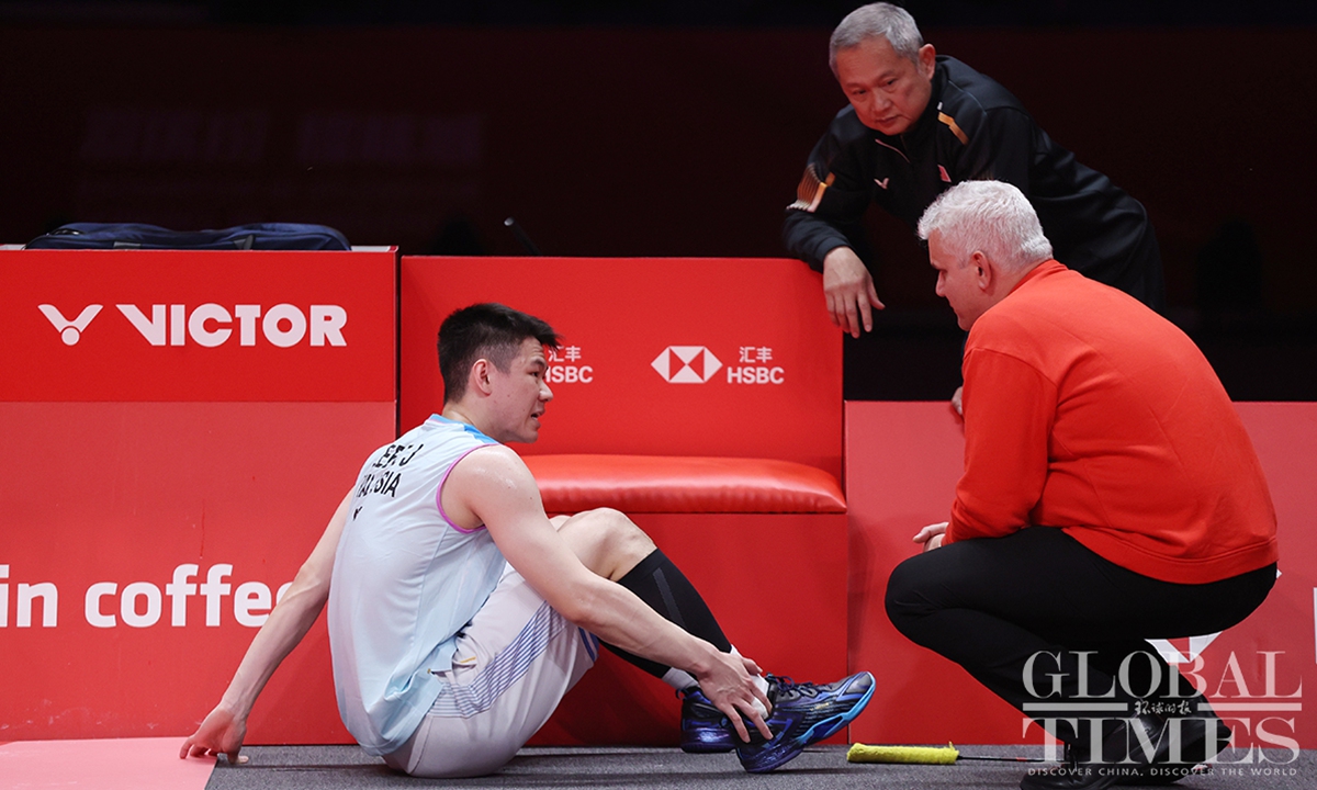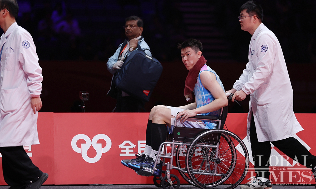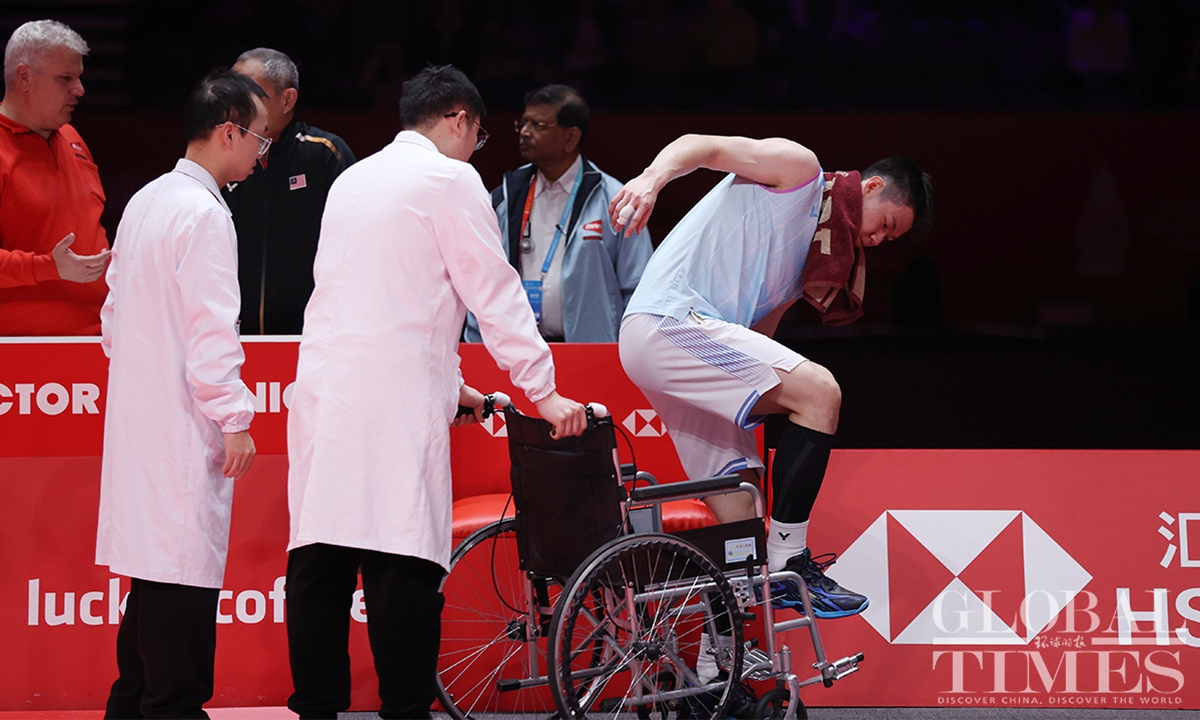 In the third round of the men’s singles group stage at the BWF World Tour Finals on December 13, 2024, Malaysia’s Lee Zii Jia was forced to quit due to an ankle injury. China’s Li Shifeng had dropped the first game 20-22 but gained the upper hand in the second game as Lee suffered the injury. Despite attempting to continue, Lee had to withdraw after a few more points, resulting in Li’s automatic advancement. (Photo: Cui Meng/GT)
