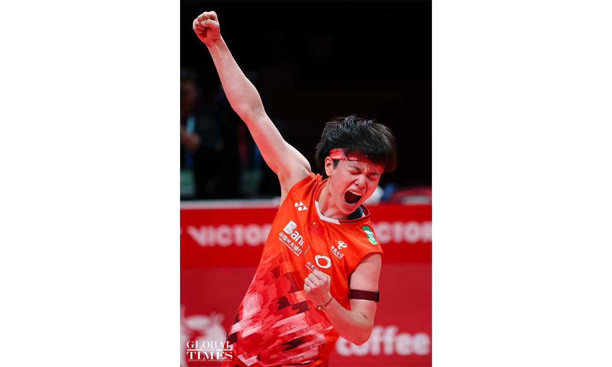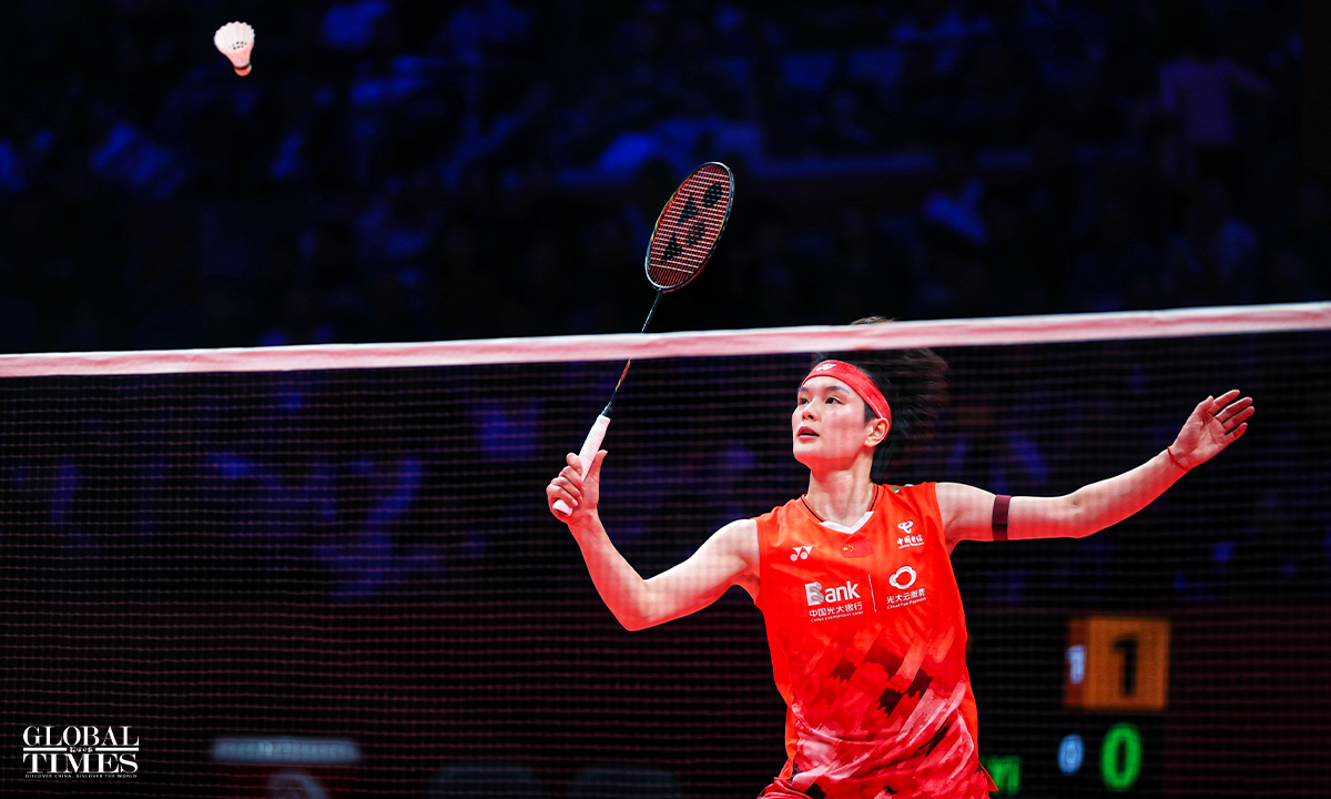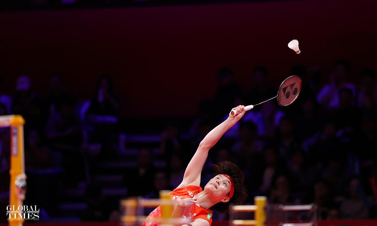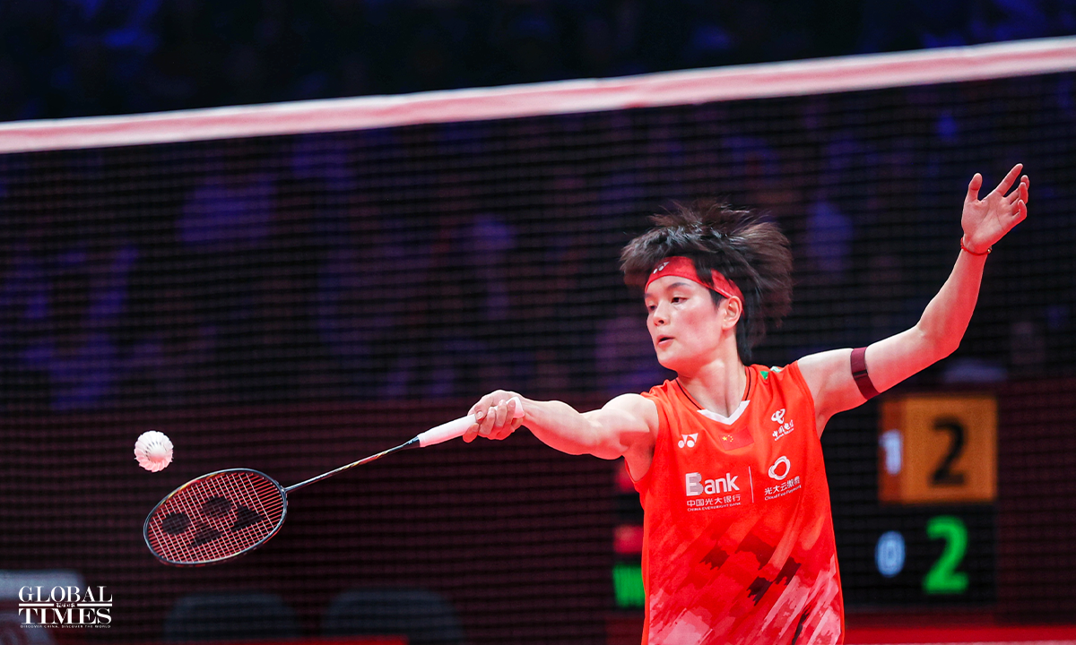 Chinese badminton women's singles player Wang Zhiyi defeated her teammate Han Yue 19-21, 21-19, 21-11 to win the BWF World Tour Finals on Sunday in Hangzhou, East China's Zhejiang Province. Photos: Cui Meng/GT