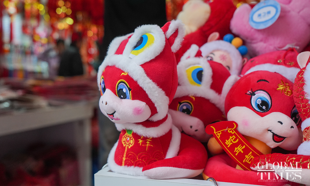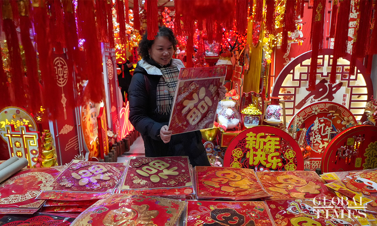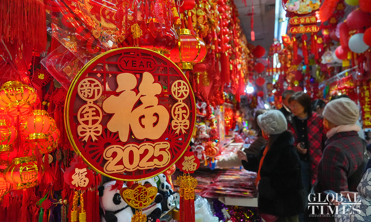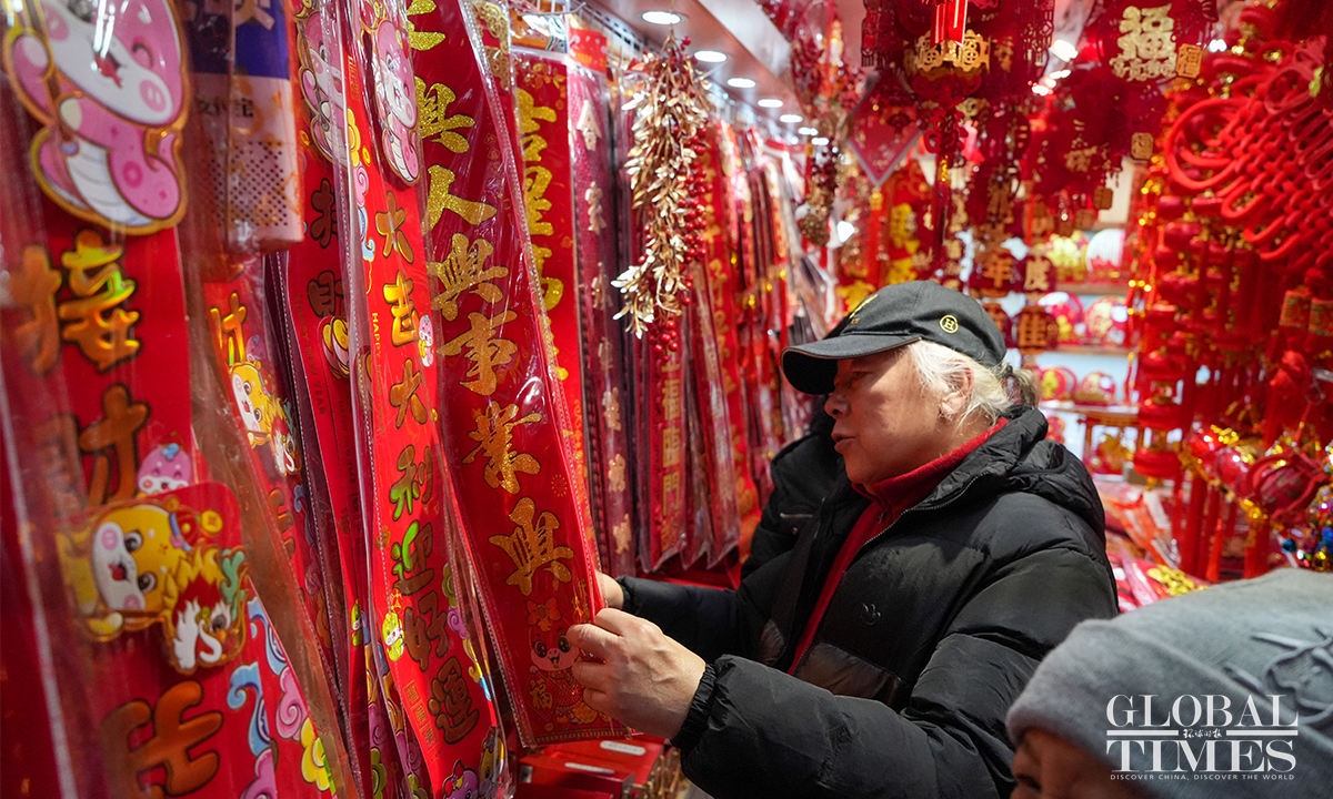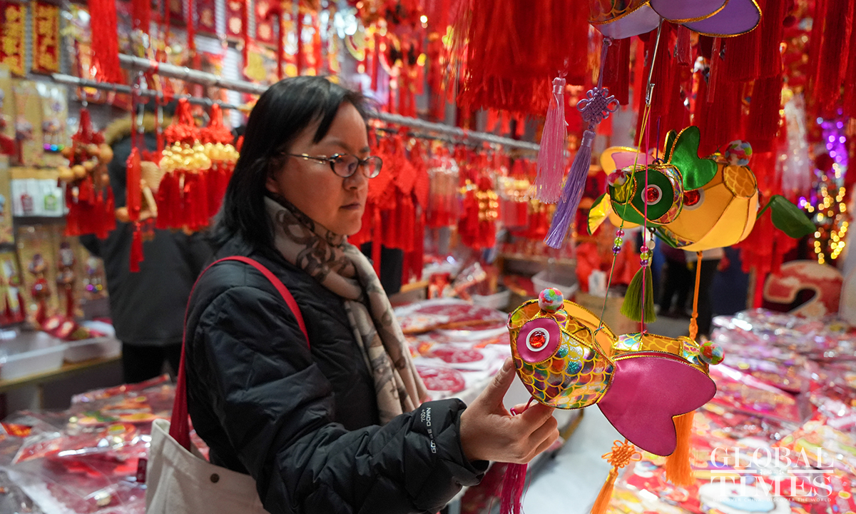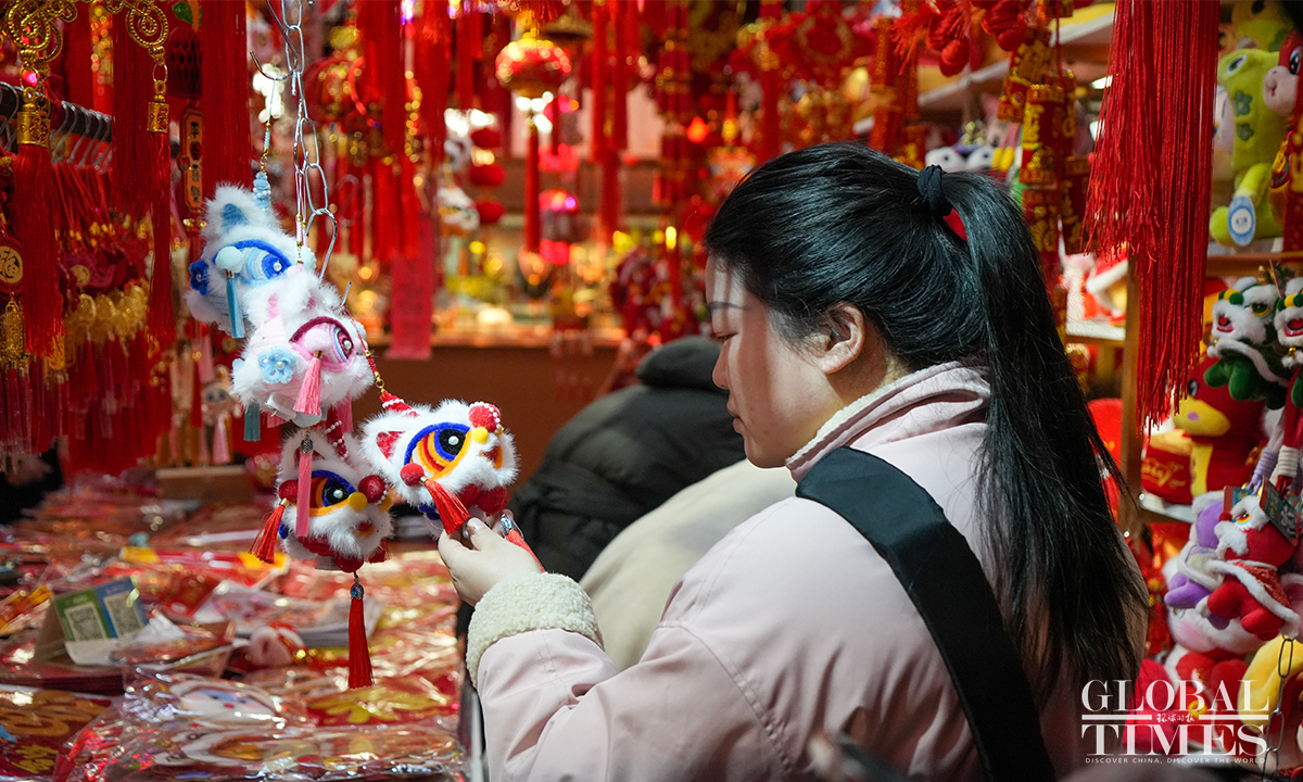 As the Spring Festival approaches, residents in Shanghai are shopping for festive decorations such as red lanterns, couplets and zodiac-themed ornaments at the Yuyuan Bazaar on December 30, 2024, contributing to a pre-holiday consumption boom. (Photos: Lu Ting/GT)