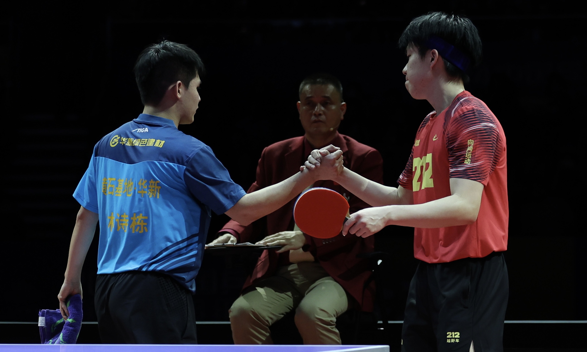 The Shandong Weiqiao Xiangshang team, featuring Wang Chuqin and Liang Jingkun, secured the championship title of the 2024 Chinese Table Tennis Super League by triumphing over the Huangshi Base·Huaxin team, represented by Lin Shidong and Xiang Peng, at the Shanghai Stadium on January 1. Photos: Chen Xia/GT