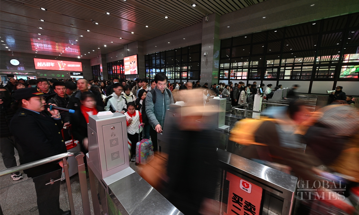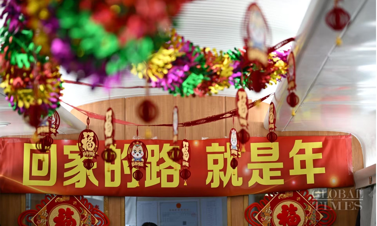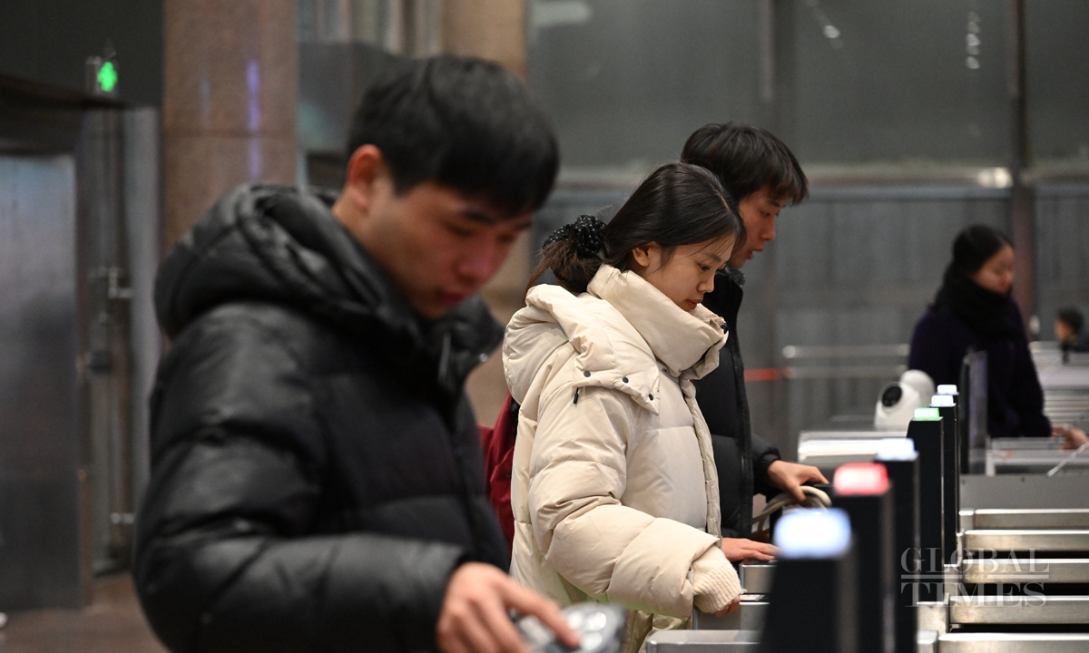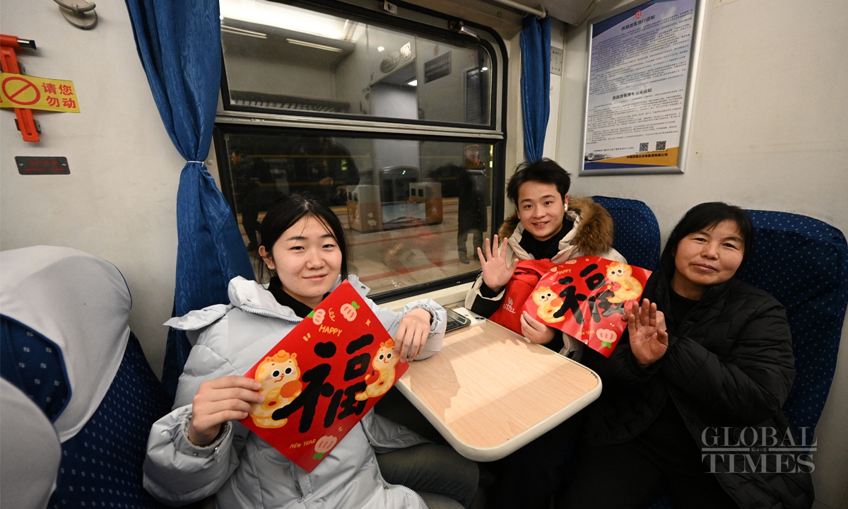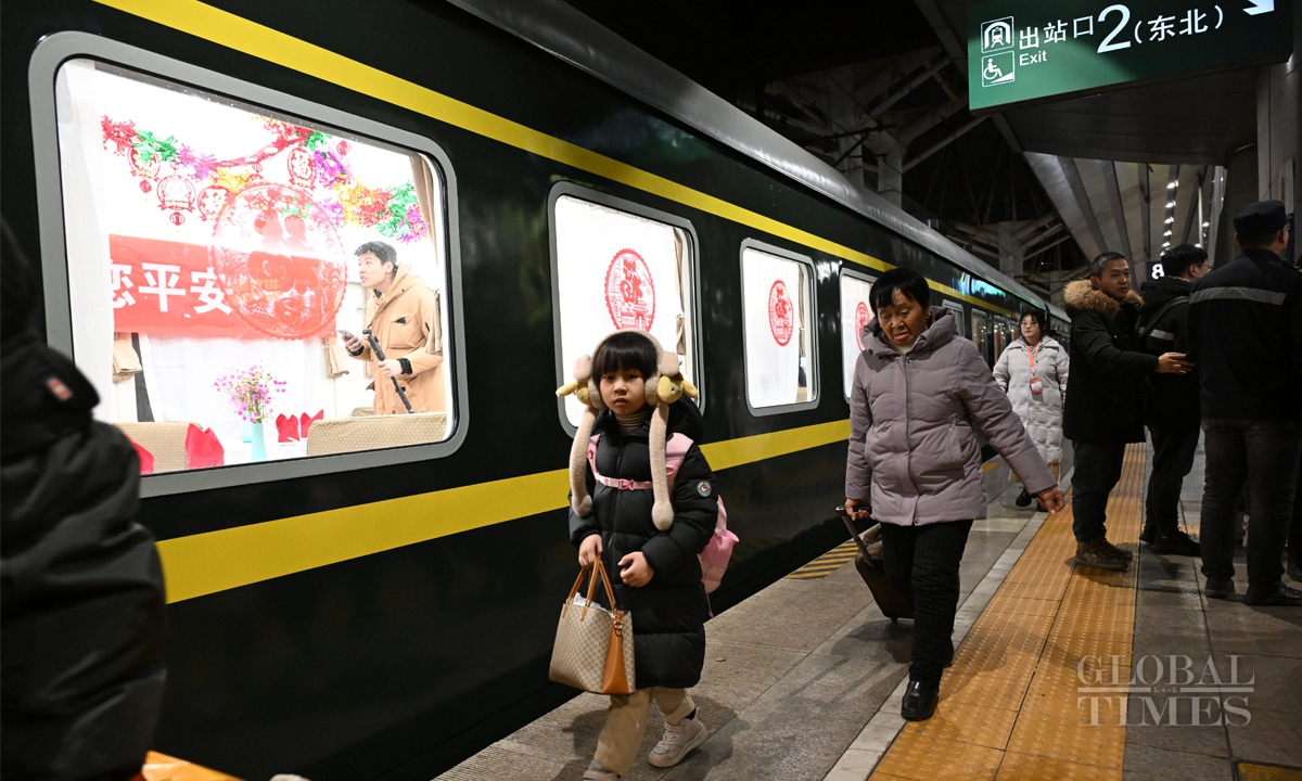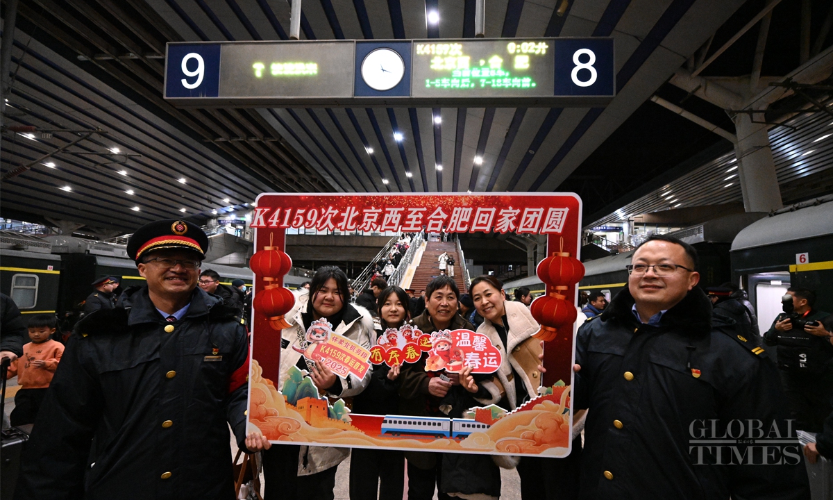 China's 40-day Spring Festival travel rush starts with K4159 leaving Beijing West Railway Station to Hefei, East China's Anhui Province at 12:02 am on January 14. The Spring Festival travel rush spans from January 14 to February 22. It is expected that during this year's Spring Festival travel period, the railway passenger volume will exceed 510 million, with an average of 12.75 million people per day, representing a 5.5% increase compared to the Spring Festival travel period in 2024. Photos: Chen Tao/GT