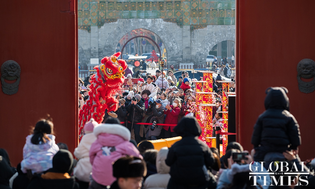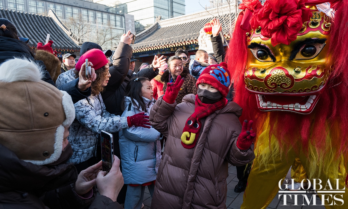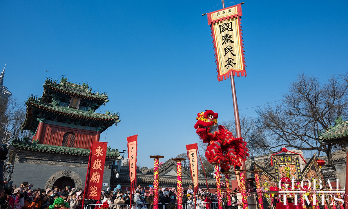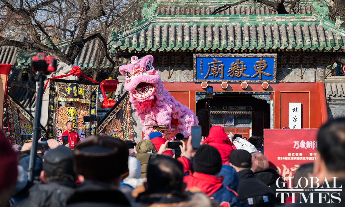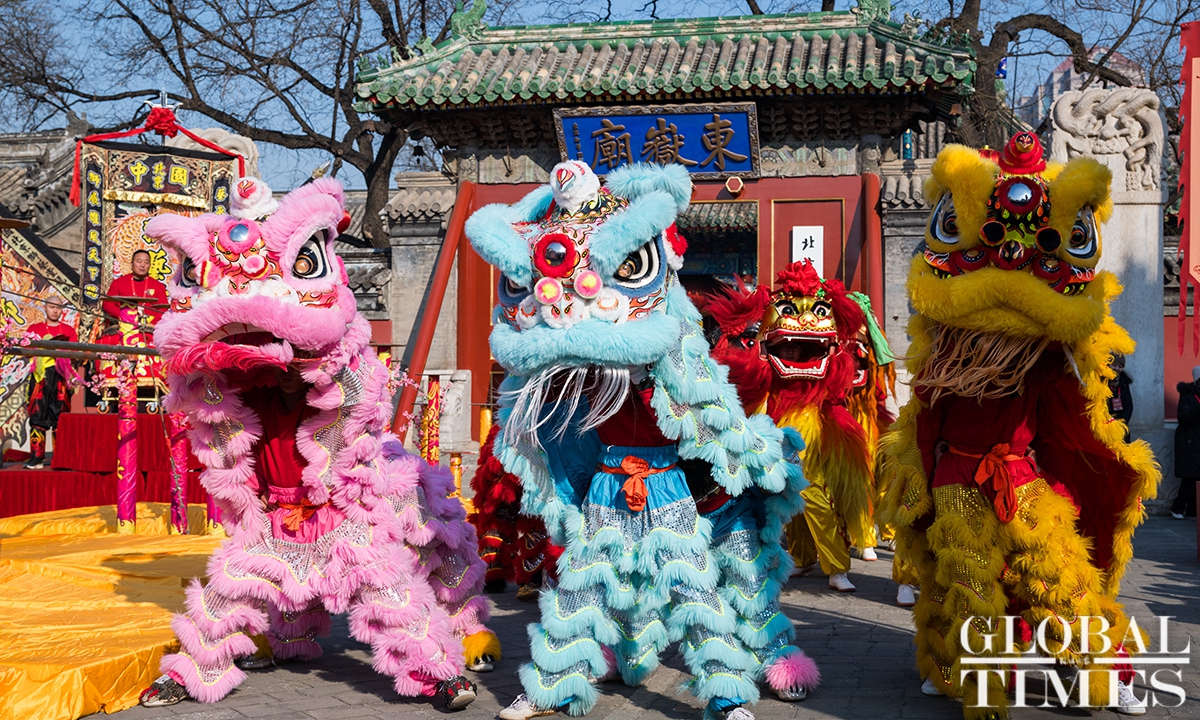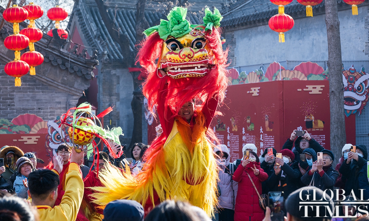 The 27th Beijing Dongyue Temple Fair opened on January 29, the first day of the Chinese New Year. At the temple fair, seven intangible cultural heritage lion dance teams from both the south and the north gathered to perform, showcasing the "majestic style" of Chinese lion dancing. They presented the skills and unique performances to the audience. Photos: Chen Tao/GT