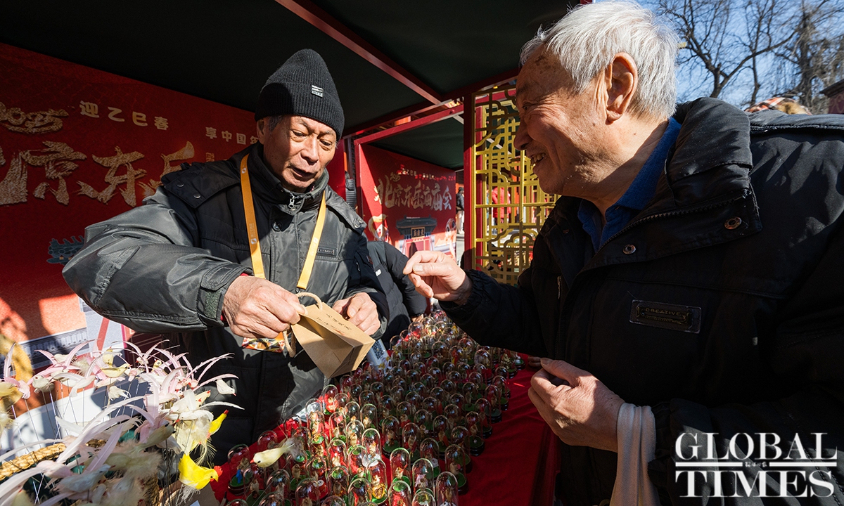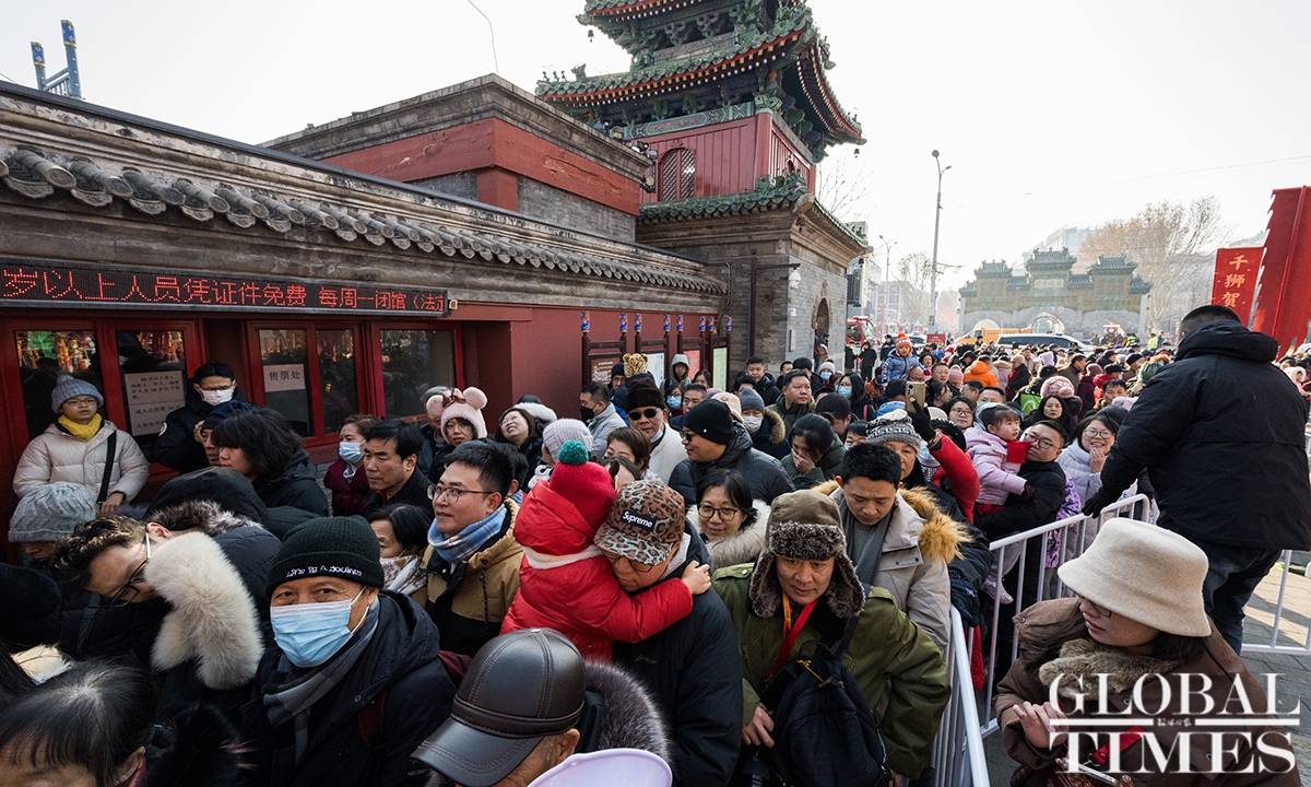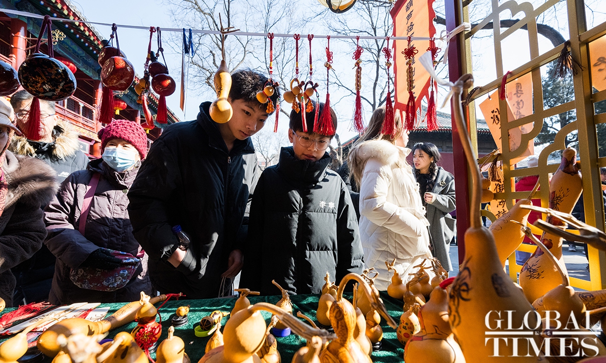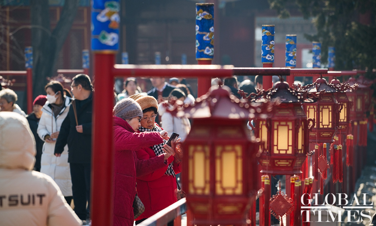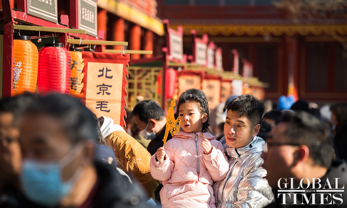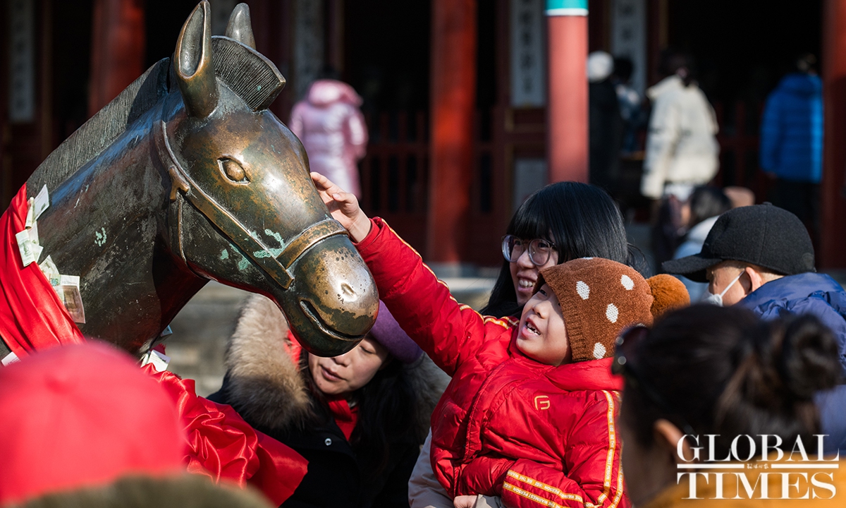 The 27th Beijing Dongyue Temple Fair opened on January 29, the first day of the Chinese New Year. At the temple fair, seven intangible cultural heritage lion dance teams from both the south and the north gathered to perform, showcasing the "majestic style" of Chinese lion dancing. They presented the skills and unique performances to the audience. Photos: Chen Tao/GT