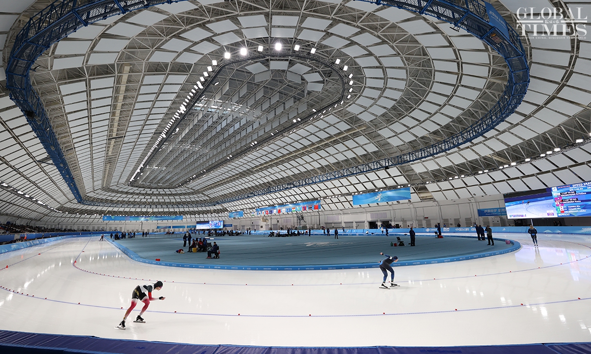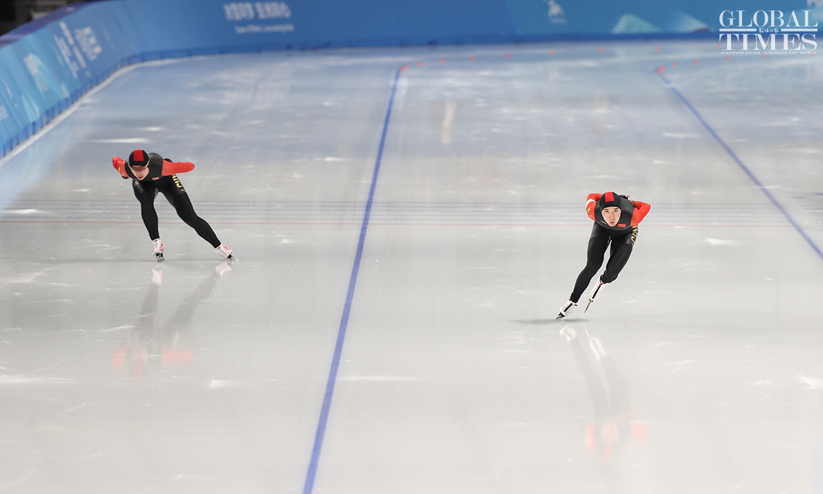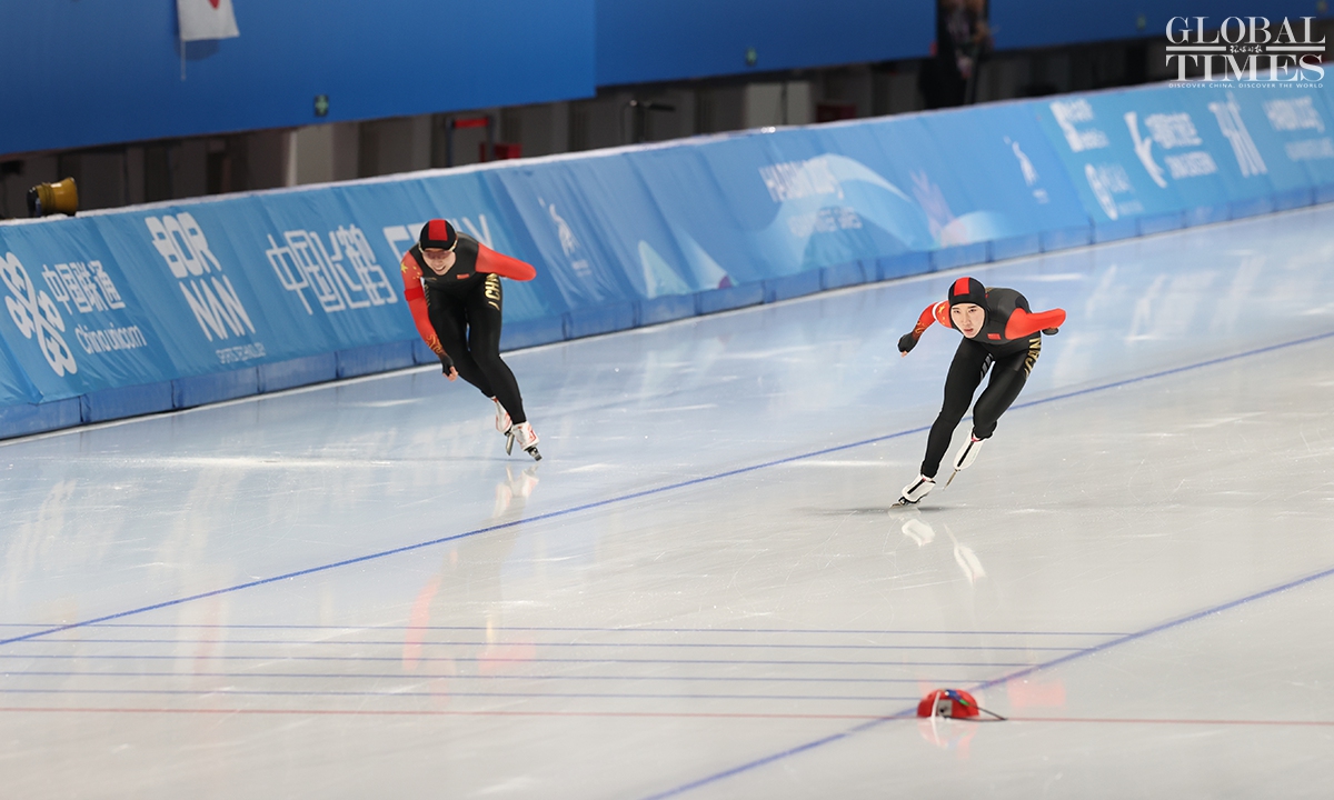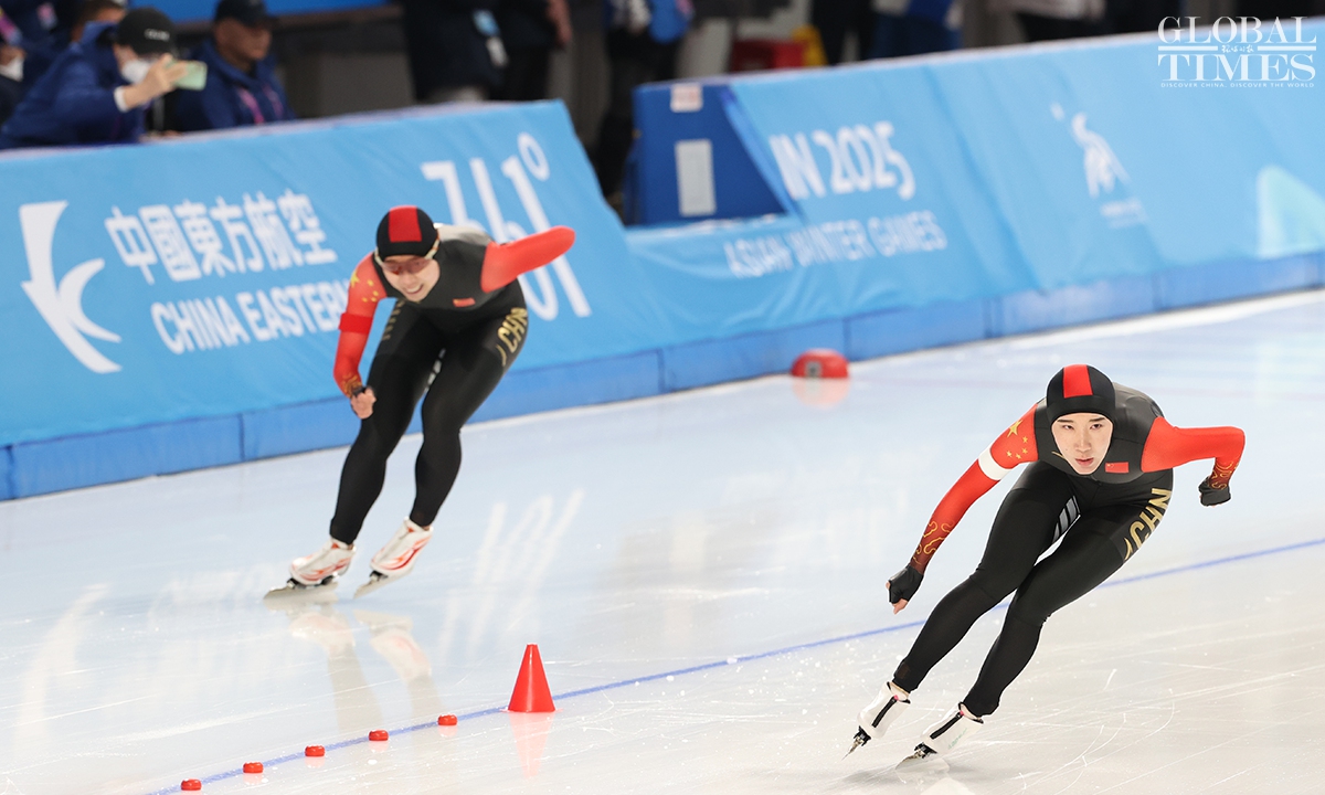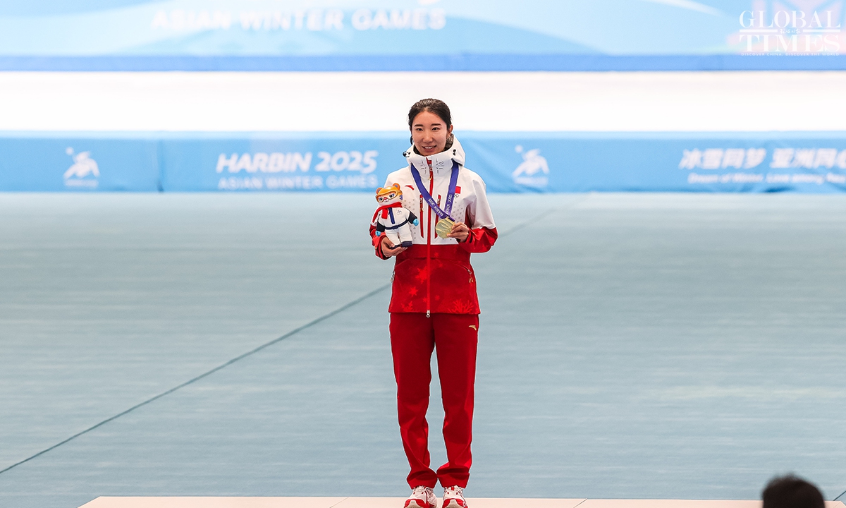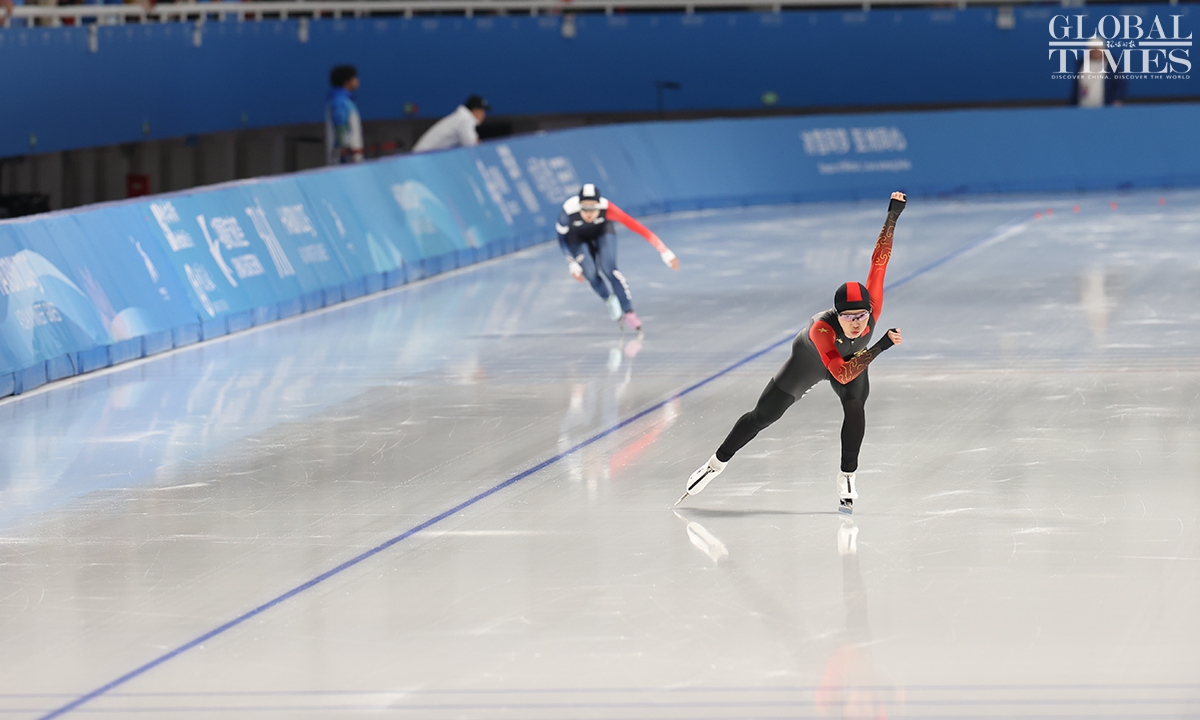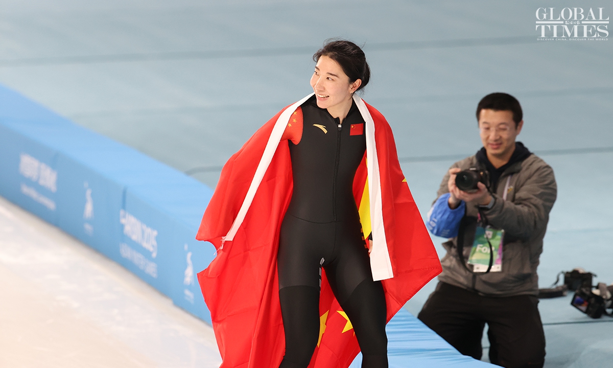 Chinese speed skater Han Mei clinched gold in the women’s 1,500m speed skating event at the Harbin Asian Winter Games on Saturday with a time of 1:57.58. Teammates Yang Binyu and Yin Qi secured silver and bronze, completing a podium sweep for China. (Photos: Chen Tao/GT)