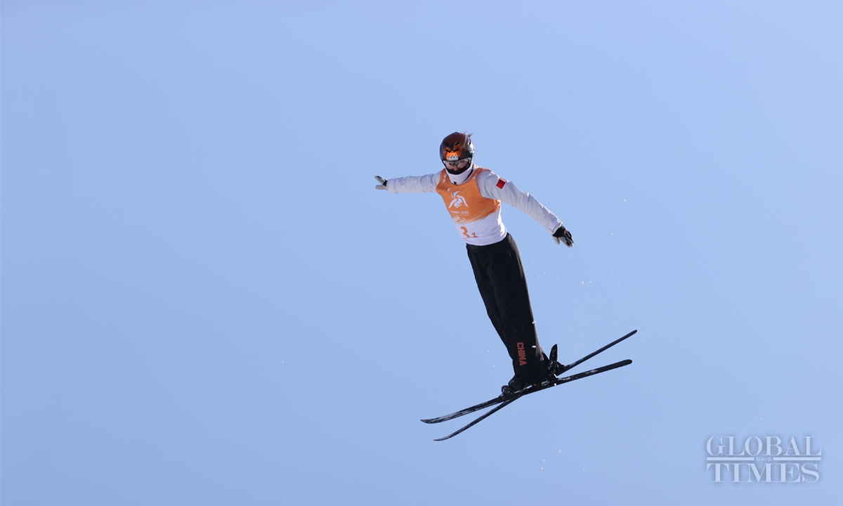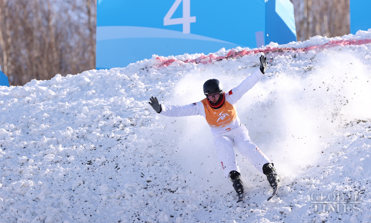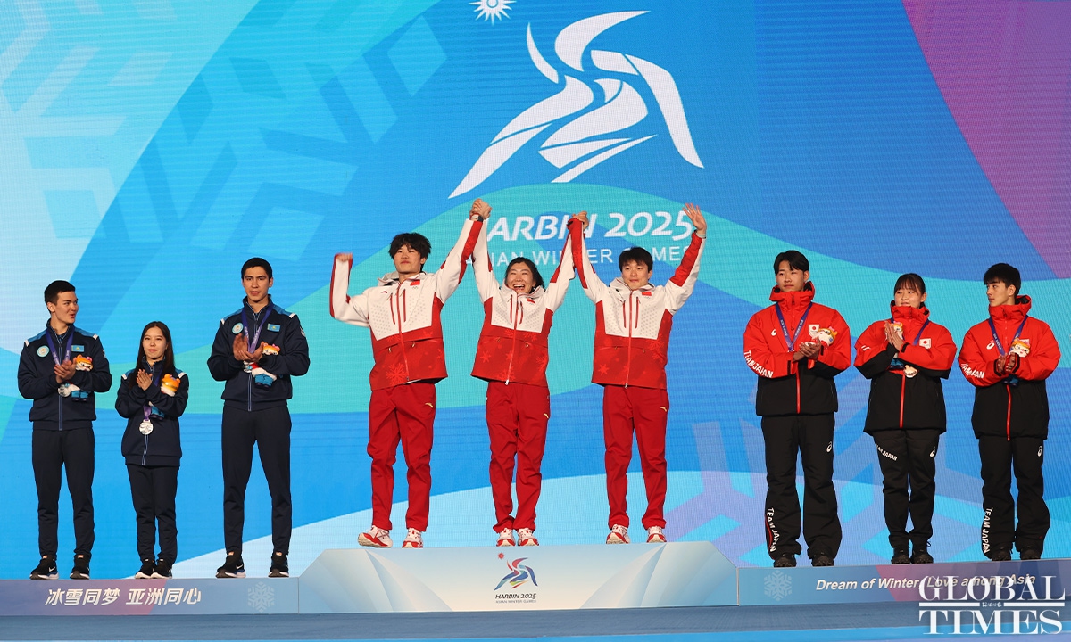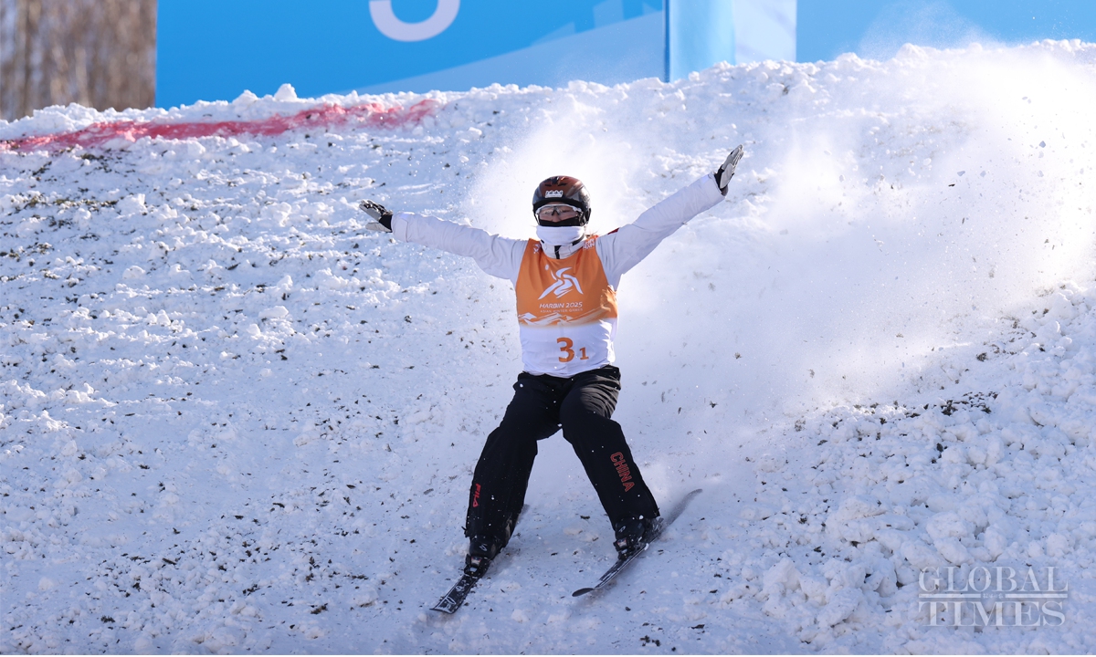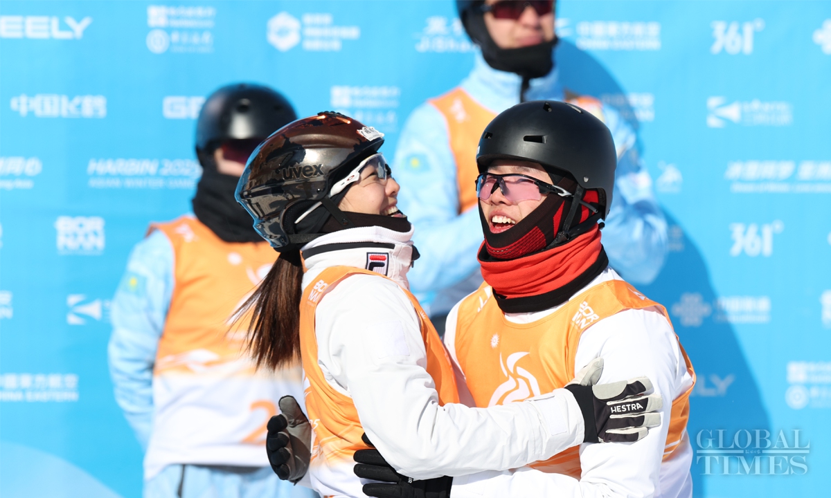 Chinese athlets Xu Mengtao, Qi Guangpu, Li Xinpeng, Chen Meiting and Yang Longxiao won gold in the mixed team final of freestyle skiing aerials on February 10 at the Harbin Winter Asian Games. Photos: Chen Tao/GT