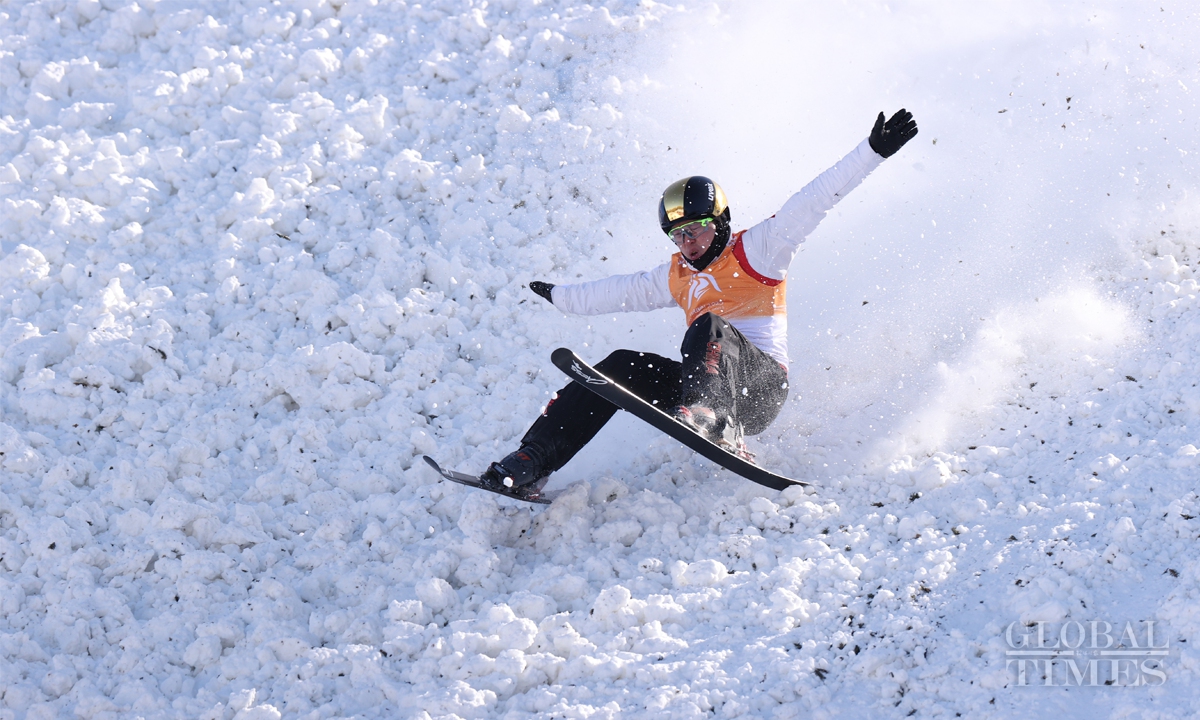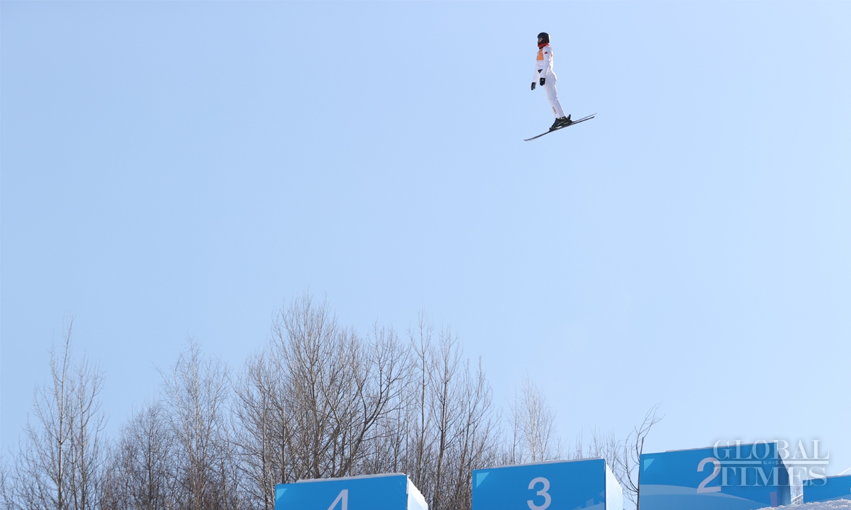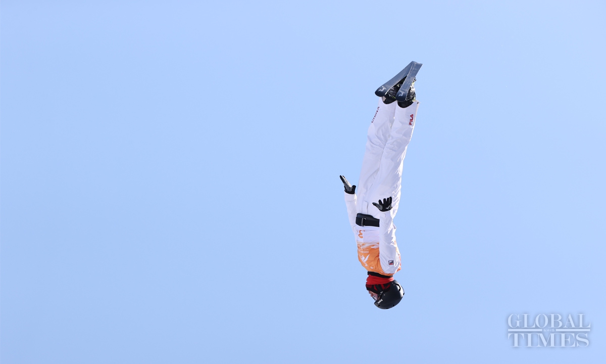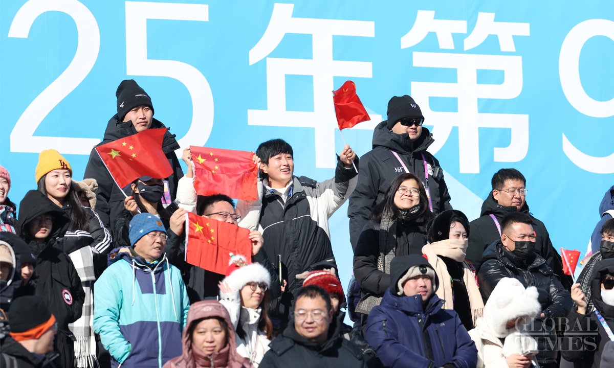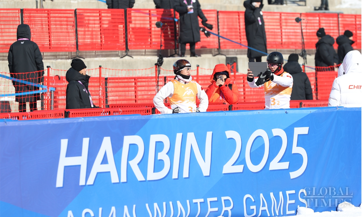 Chinese athlets Xu Mengtao, Qi Guangpu, Li Xinpeng, Chen Meiting and Yang Longxiao won gold in the mixed team final of freestyle skiing aerials on February 10 at the Harbin Winter Asian Games. Photos: Chen Tao/GT
