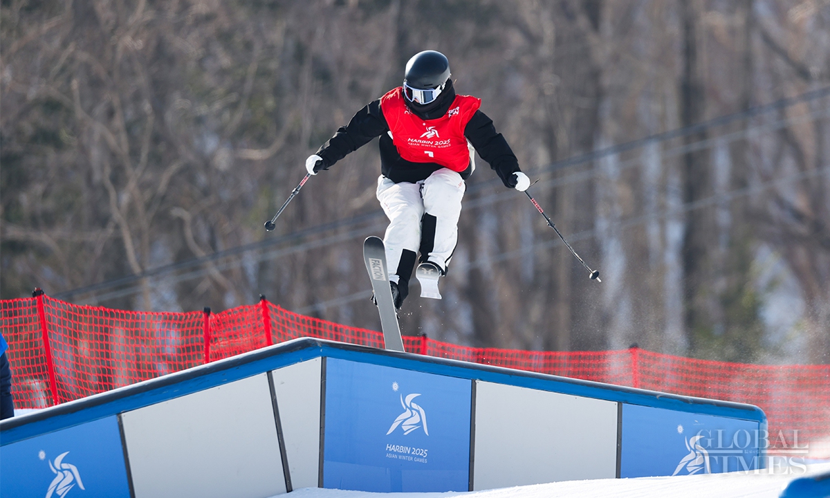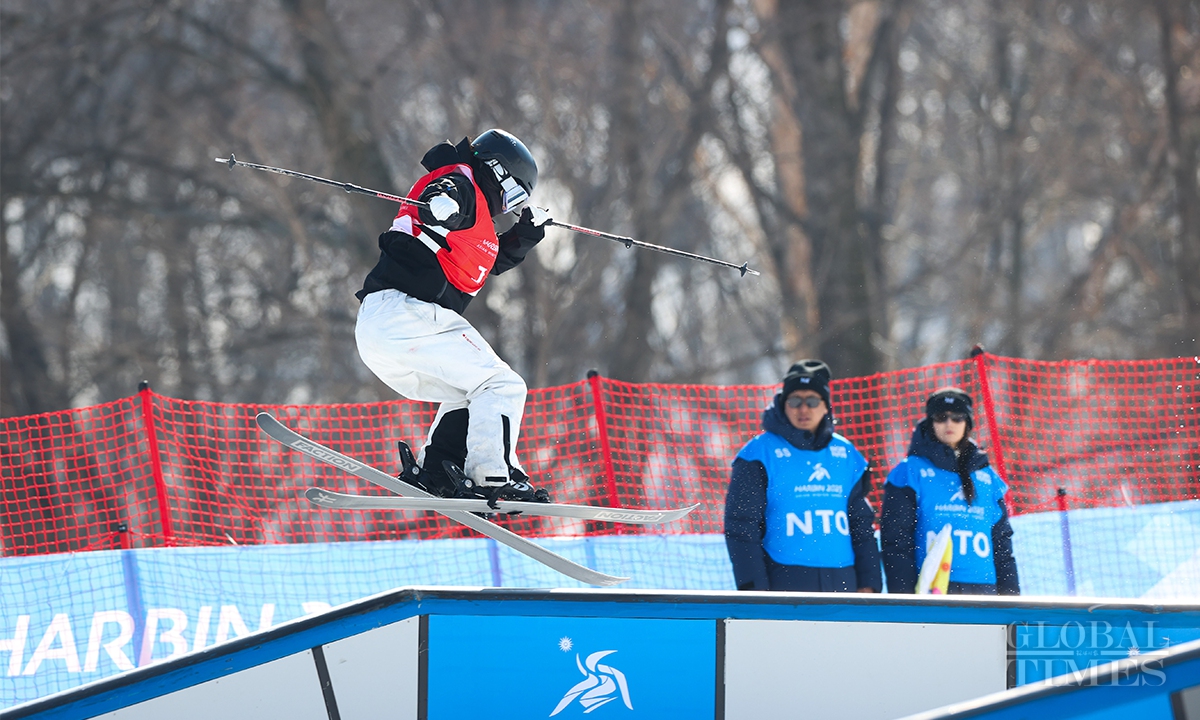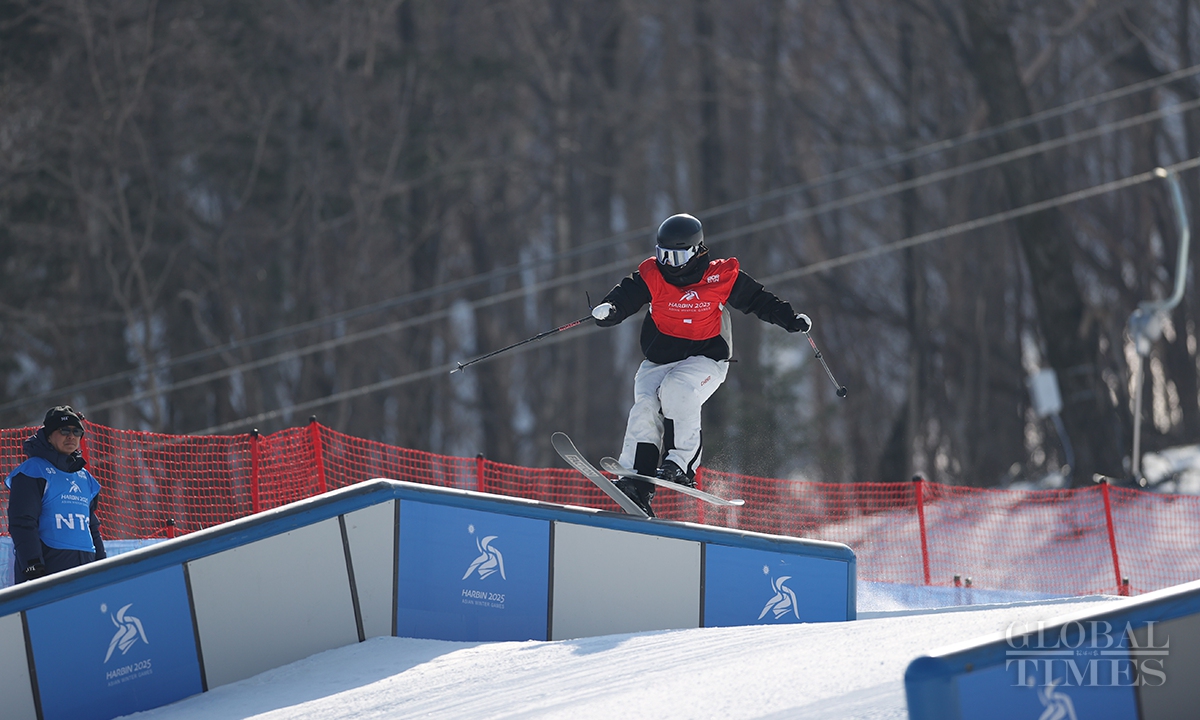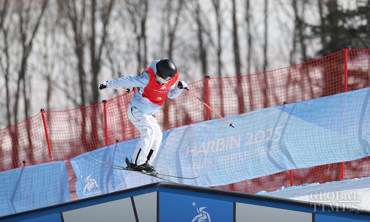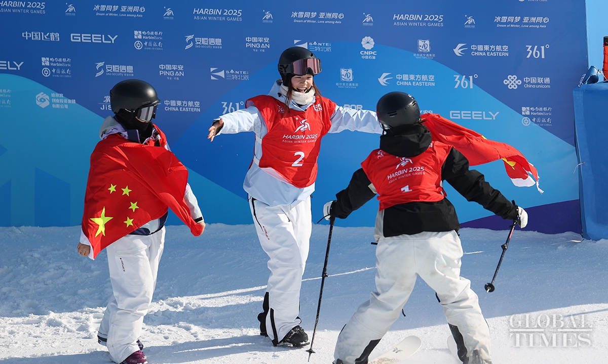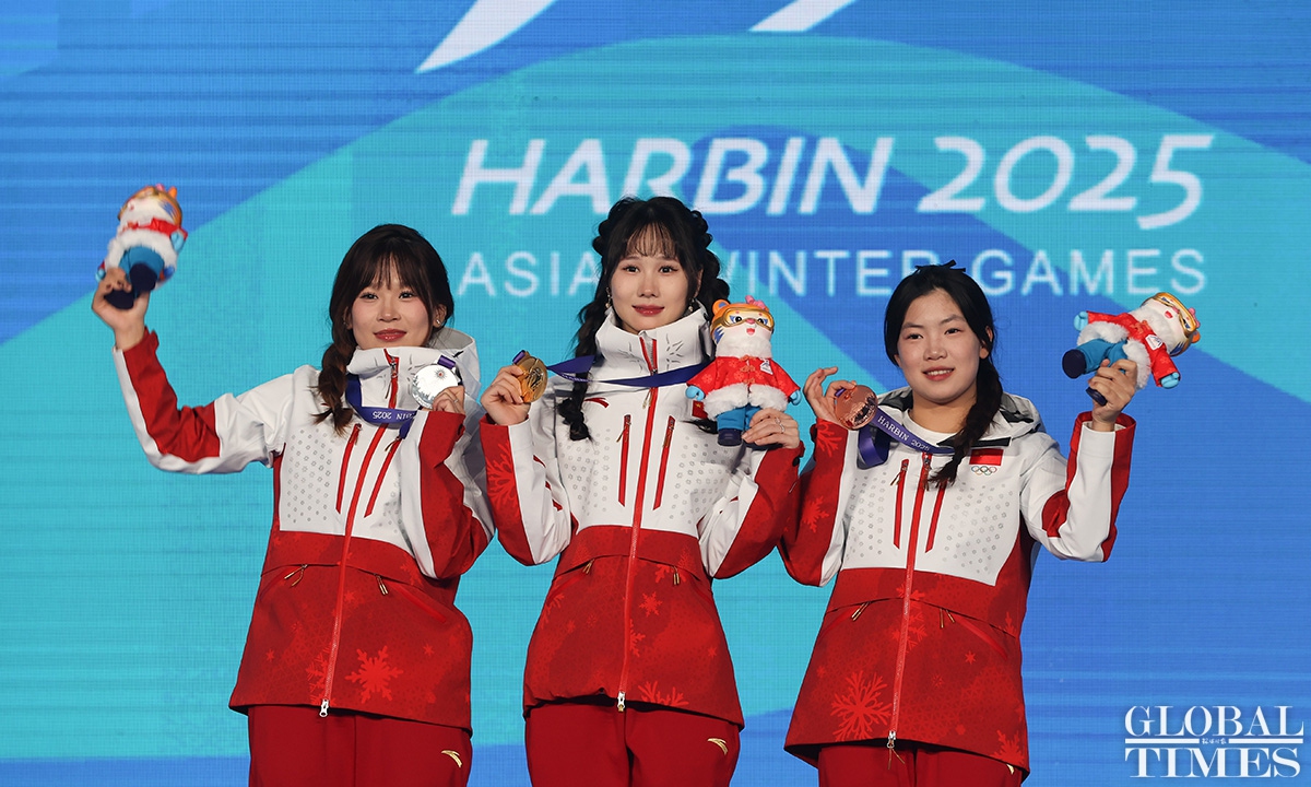 On February 11, Chinese athlete Liu Mengting claimed gold in the finals of the women's freestyle skiing slopestyle event at the Harbin Asian Winter Games, Yang Ruyi secured the silver medal, and Han Linshan took home the bronze. Photos: Chen Tao/GT