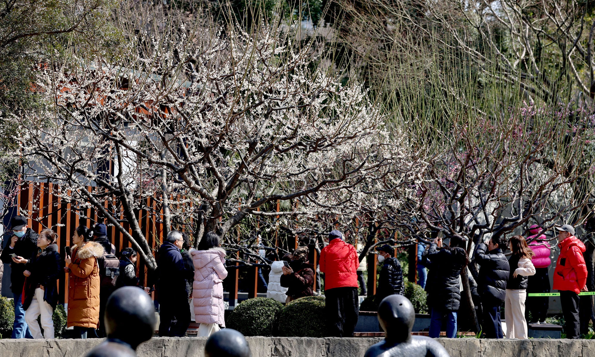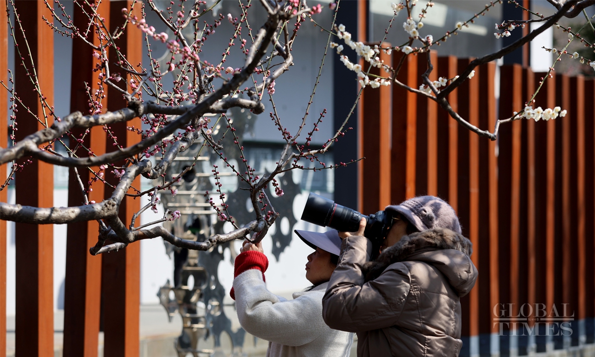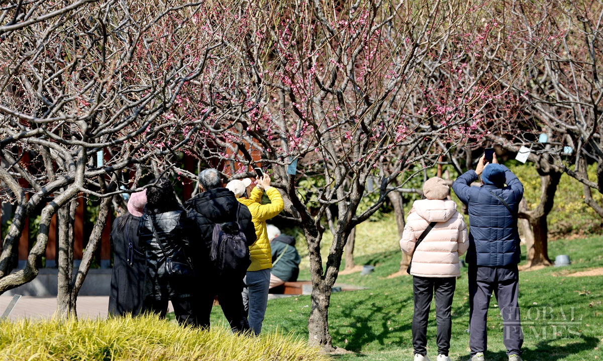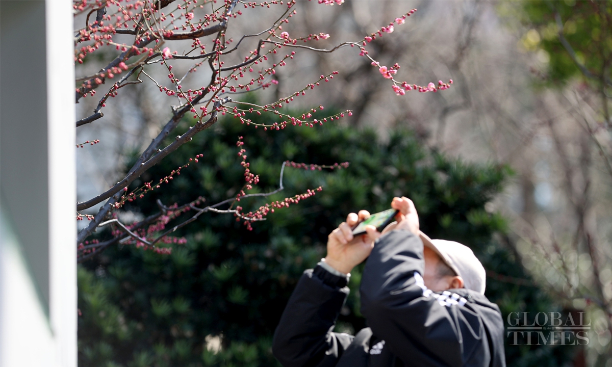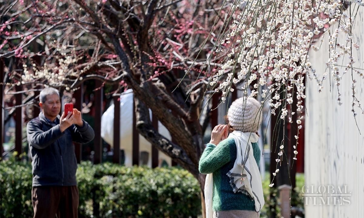 On February 18th, plum blossoms in Shanghai's Jing'an Sculpture Park erupted into a breathtaking bloom. Their delicate, fragrant petals unfurled, casting a spell of springtime allure over the park. The spectacle was nothing short of enchanting, drawing in hordes of citizens. Eager visitors were bustling about, cameras in hand, determined to freeze the transient beauty of the plum blossoms. Photos: Chen Xia/GT