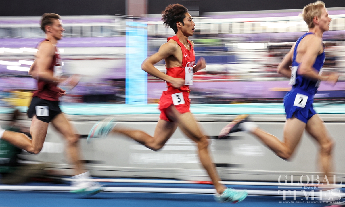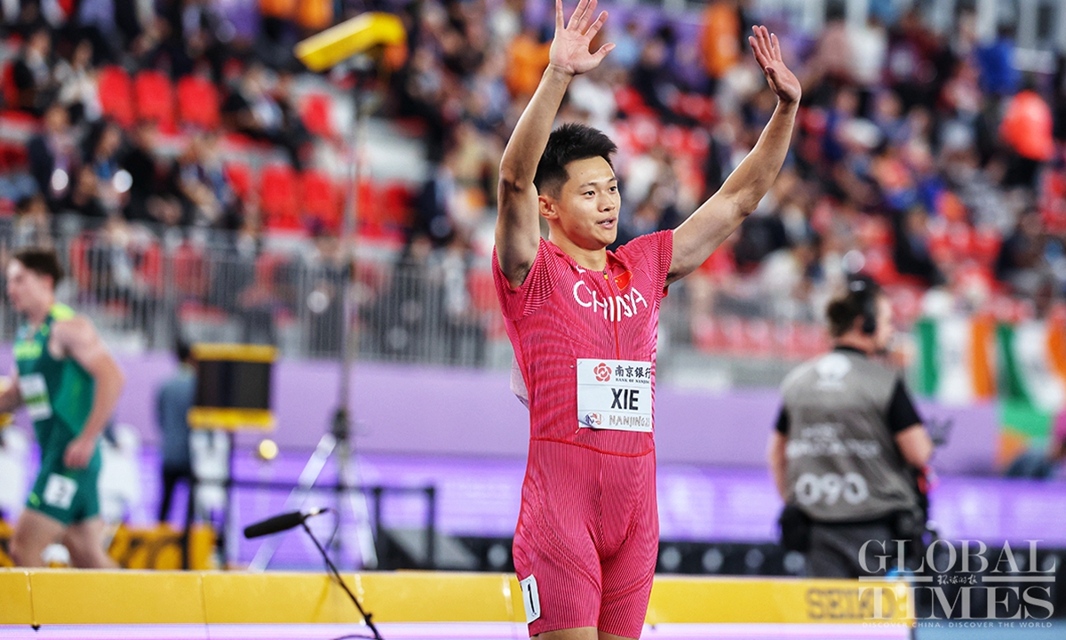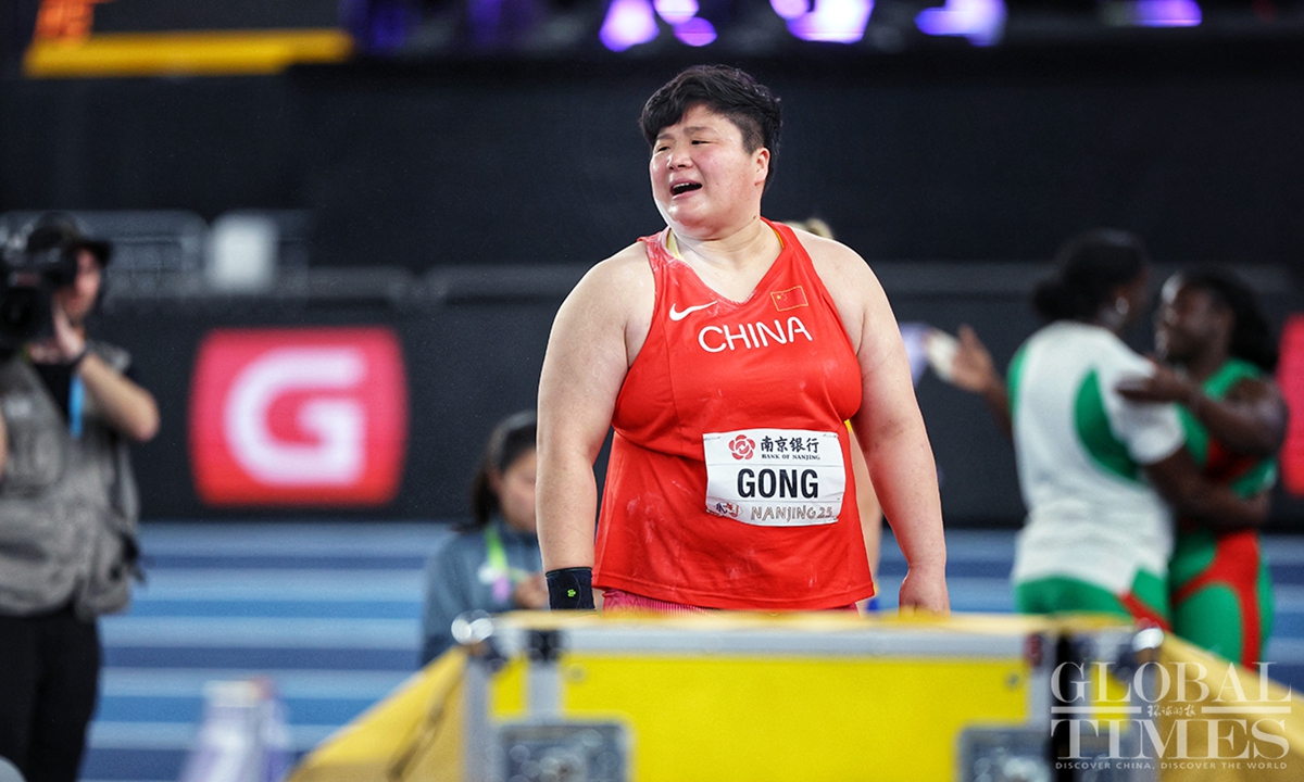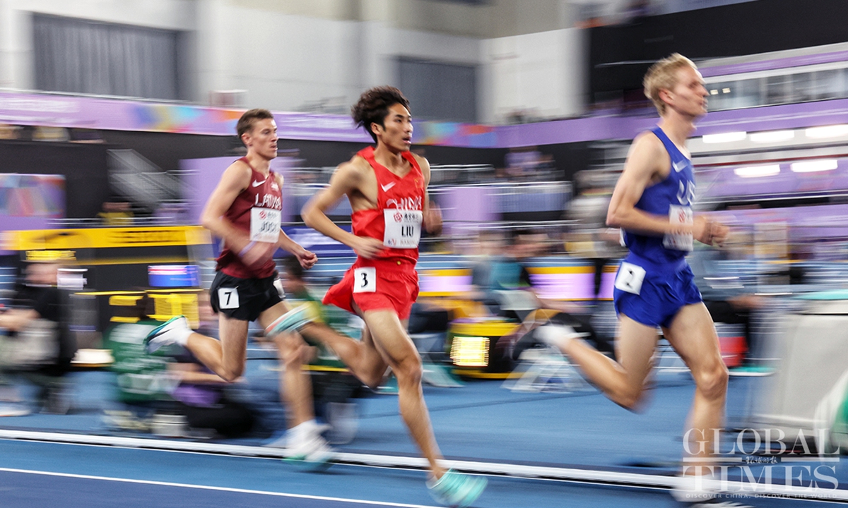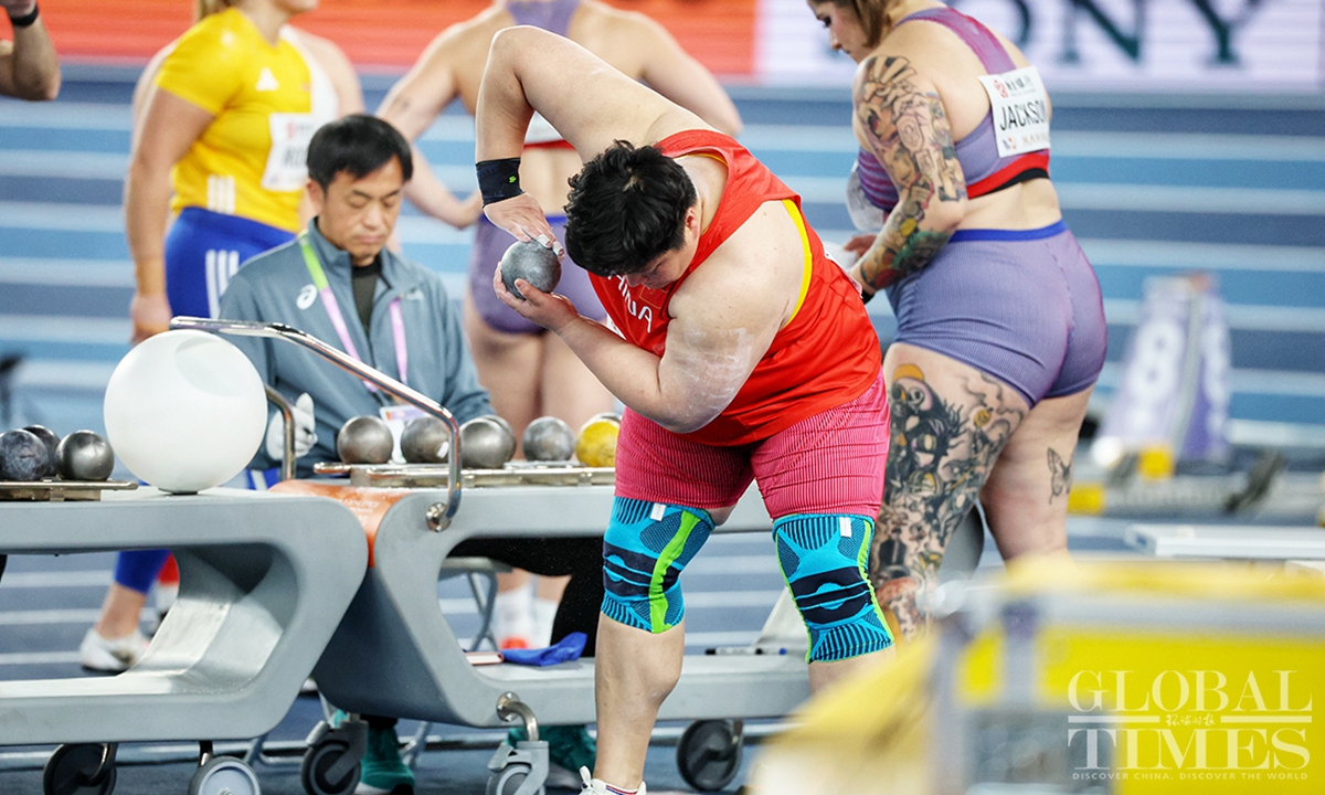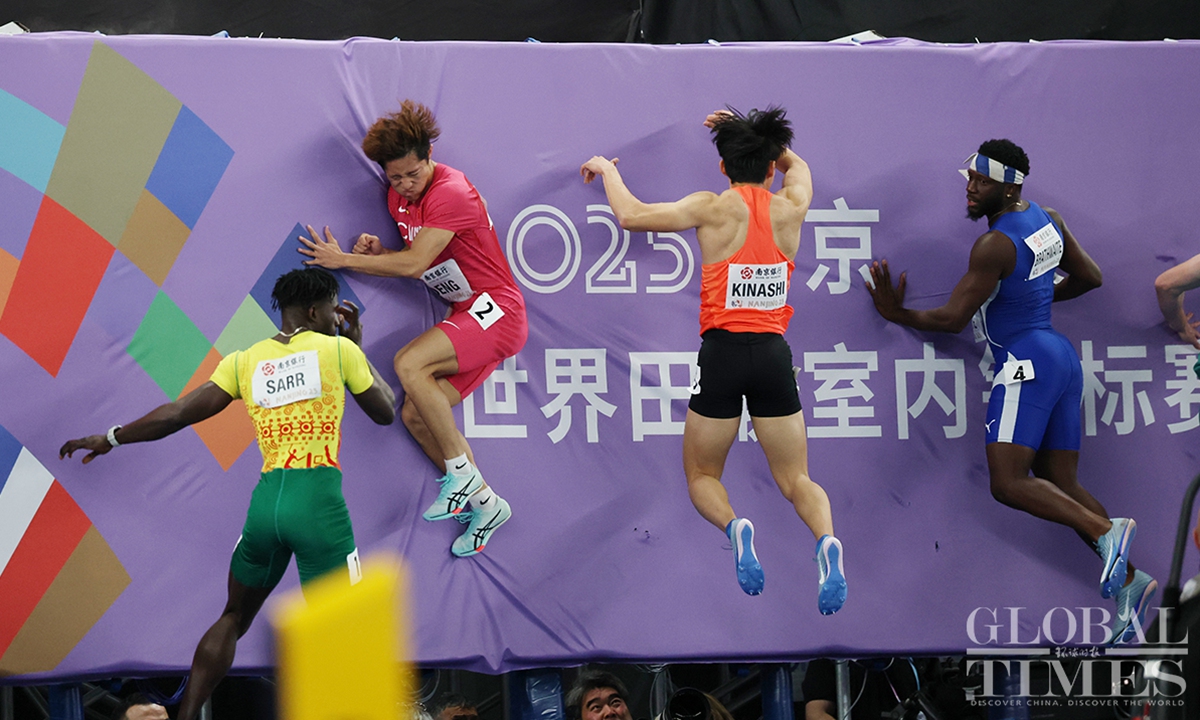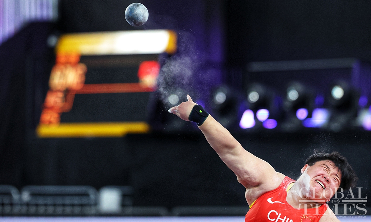 Chinese track and field stars including male sprinter Xie Zhenye and female shot put athlete Gong Lijiao play the home crowd at the World Athletics Indoor Championships in Nanjing, East China’s Jiangsu Province on Friday night. Young sprinter Deng Xinrui also made his mark in the men’s 60m sprint while distance runner Liu Dezhu finished a season best in the 1,500 meters heat.(Photo: Cui Meng/GT)