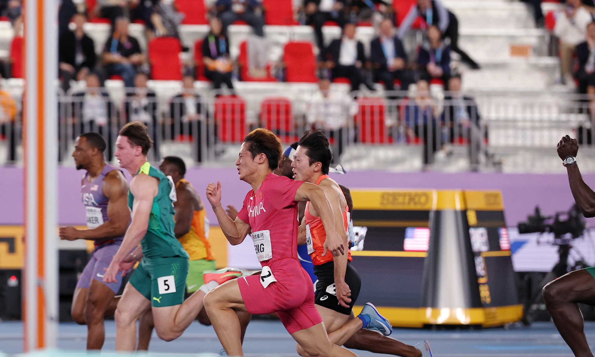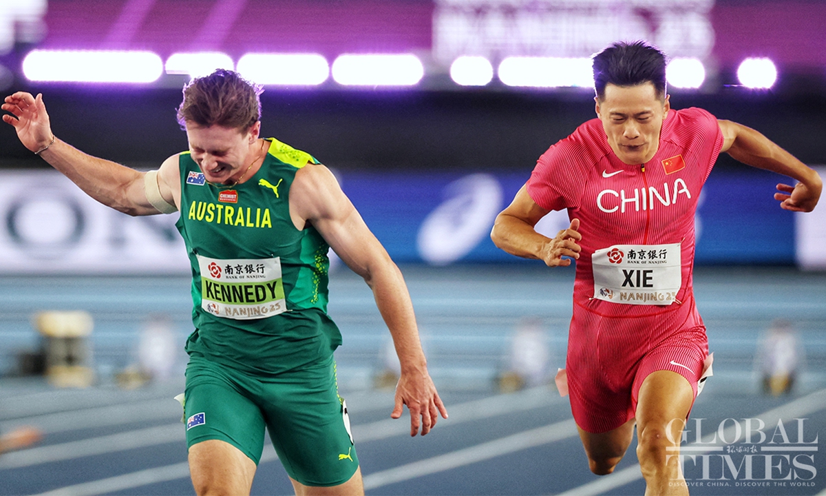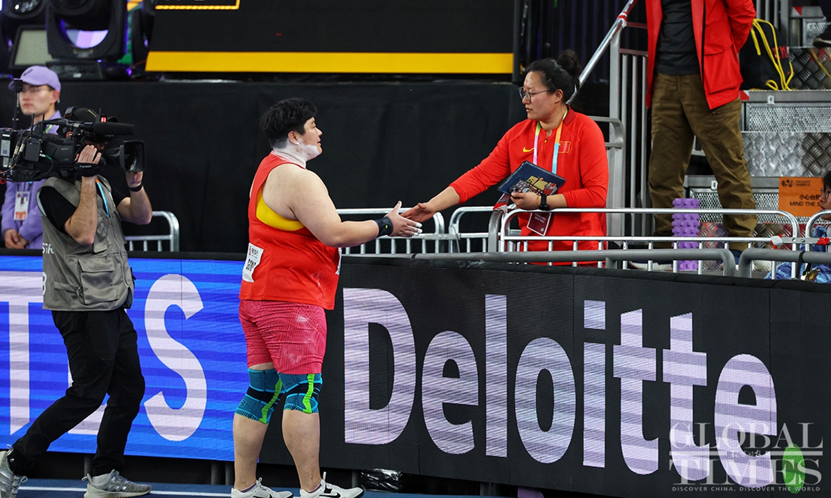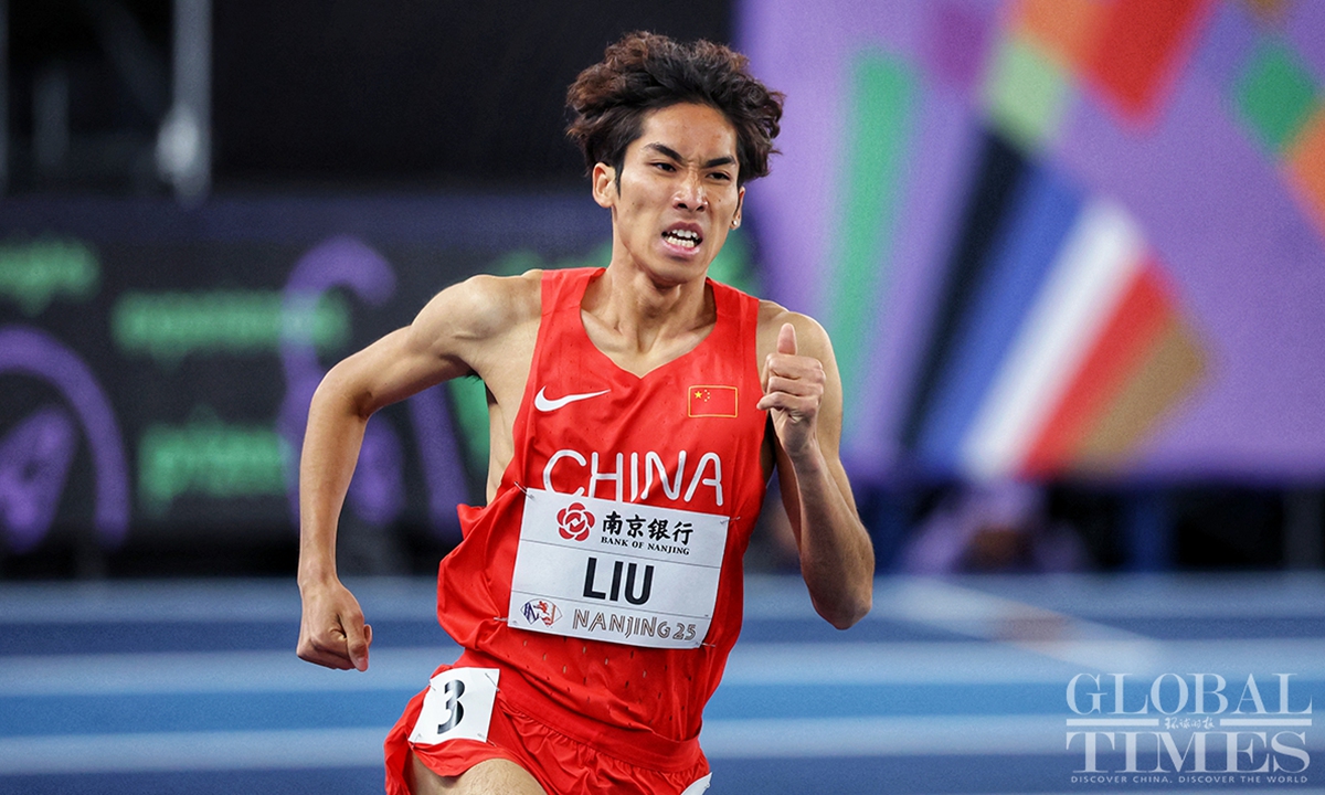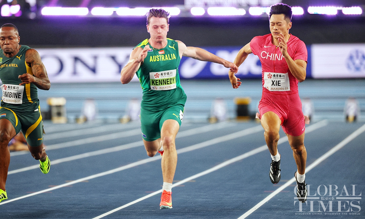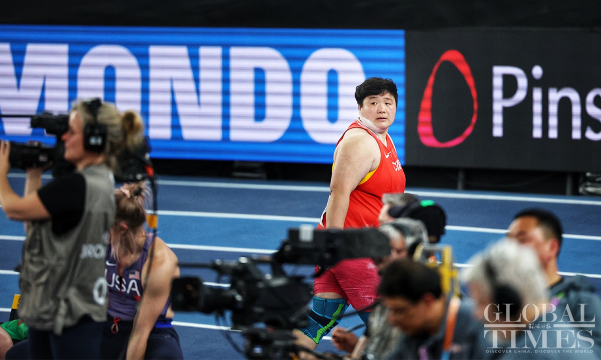 Chinese track and field stars including male sprinter Xie Zhenye and female shot put athlete Gong Lijiao play the home crowd at the World Athletics Indoor Championships in Nanjing, East China’s Jiangsu Province on Friday night. Young sprinter Deng Xinrui also made his mark in the men’s 60m sprint while distance runner Liu Dezhu finished a season best in the 1,500 meters heat.(Photo: Cui Meng/GT)