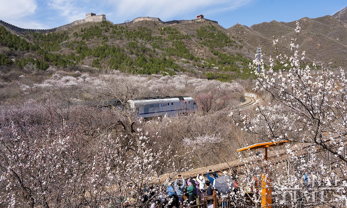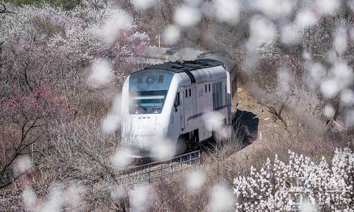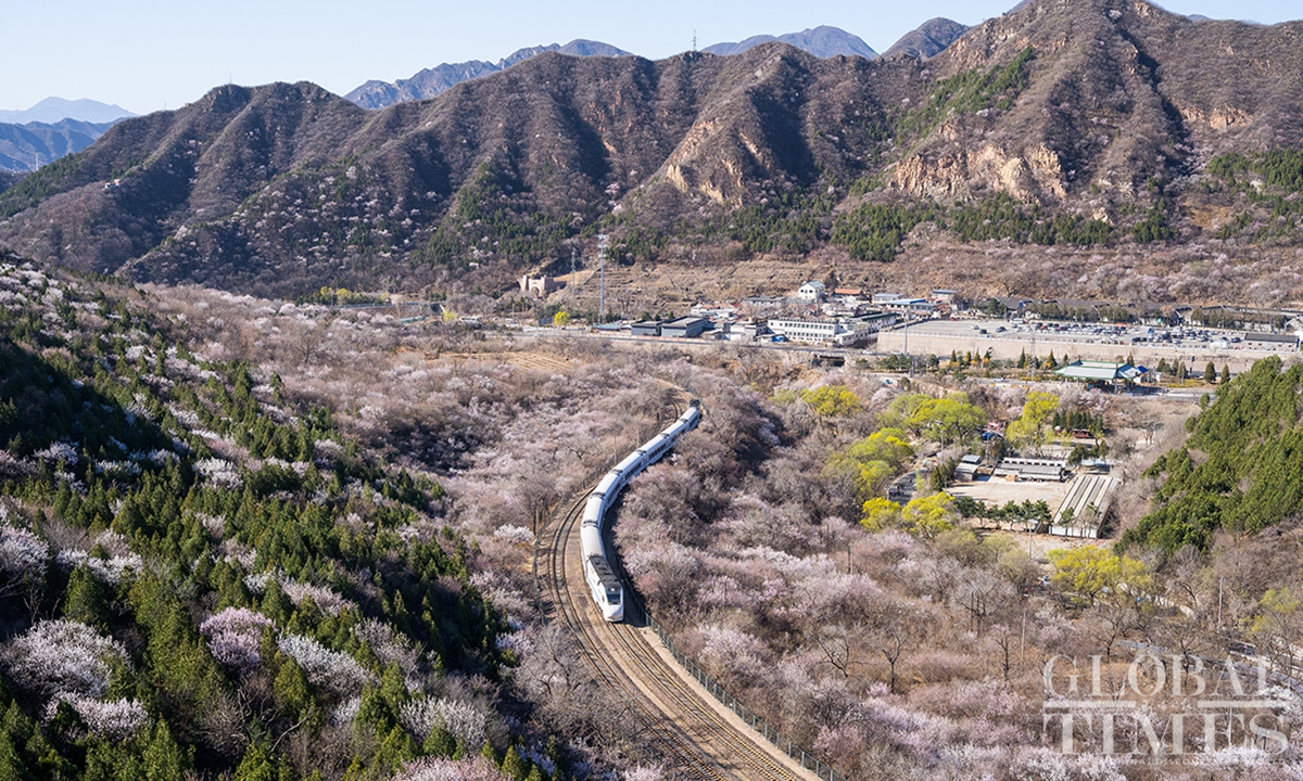 The Beijing Suburban Railway Line S2 is currently enveloped in a breathtaking array of mountain peach blossoms nestled at the foot of the Juyongguan Great Wall.