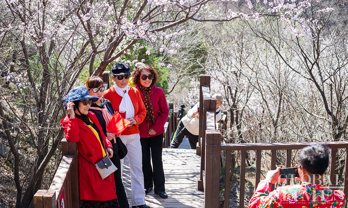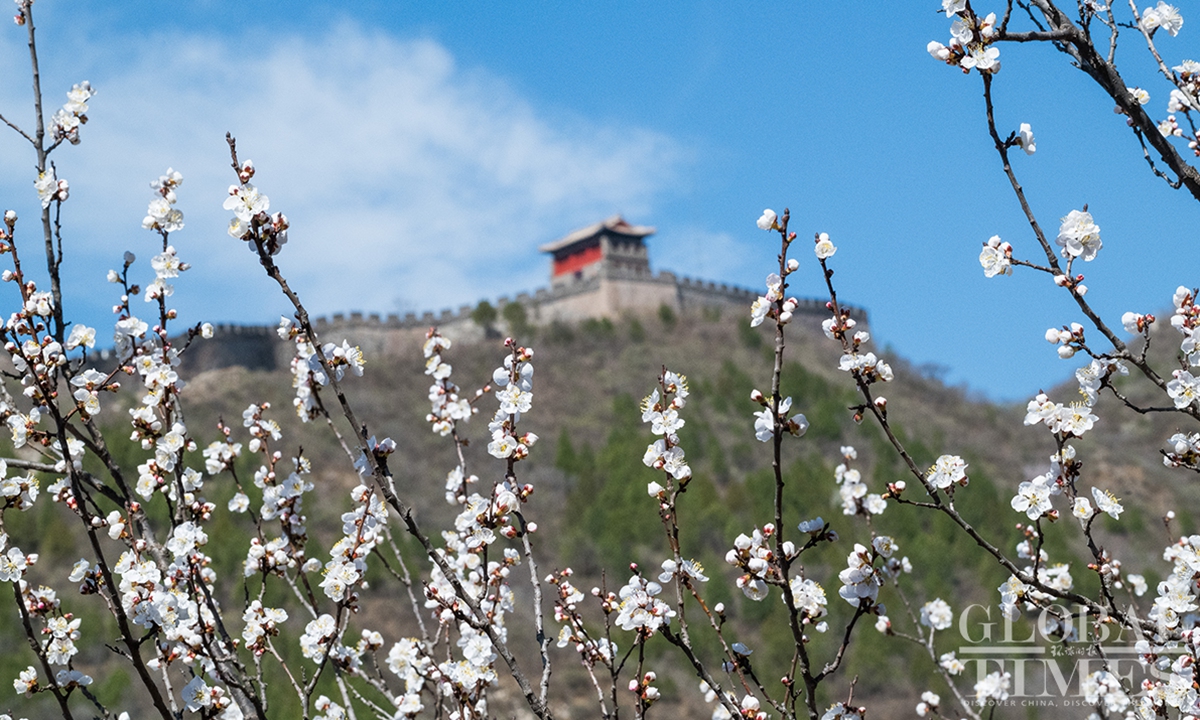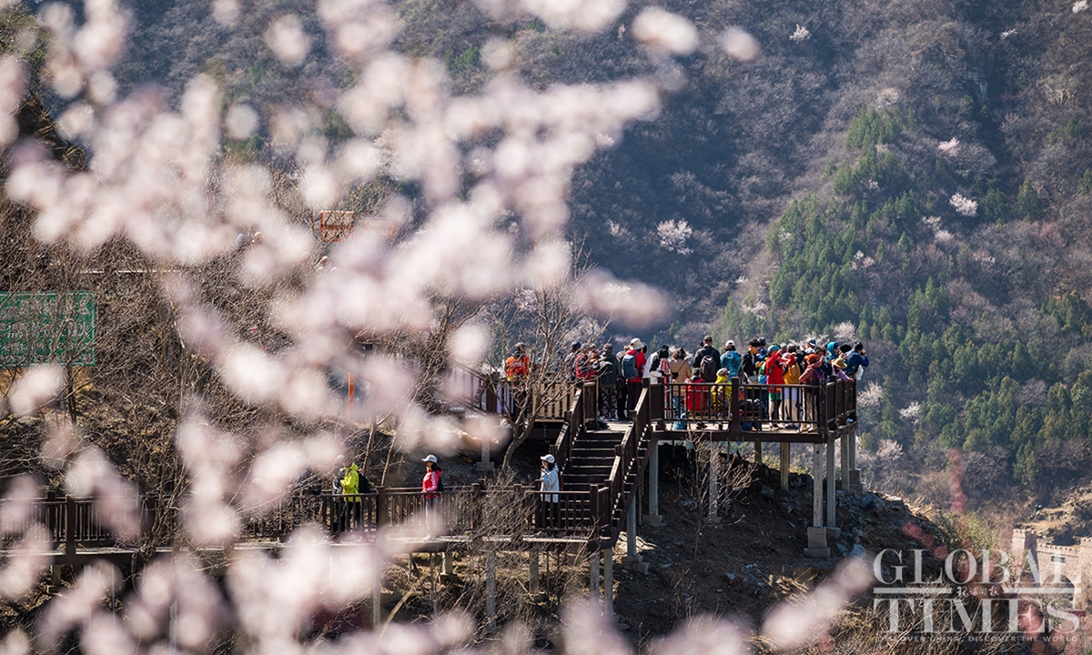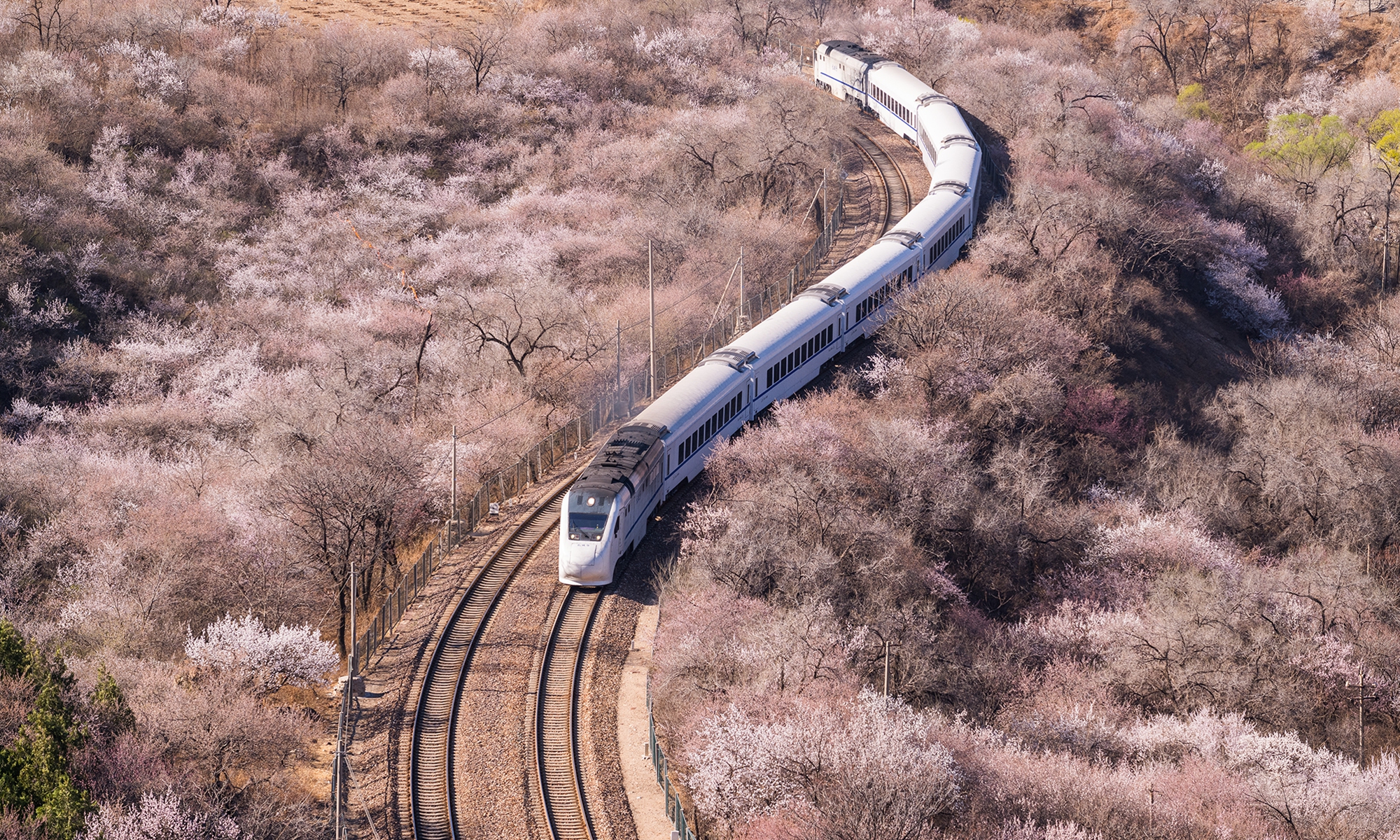 The Beijing Suburban Railway Line S2 is currently enveloped in a breathtaking array of mountain peach blossoms nestled at the foot of the Juyongguan Great Wall.