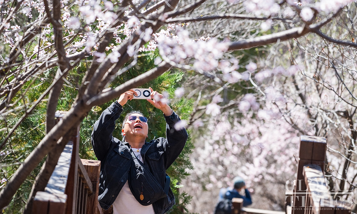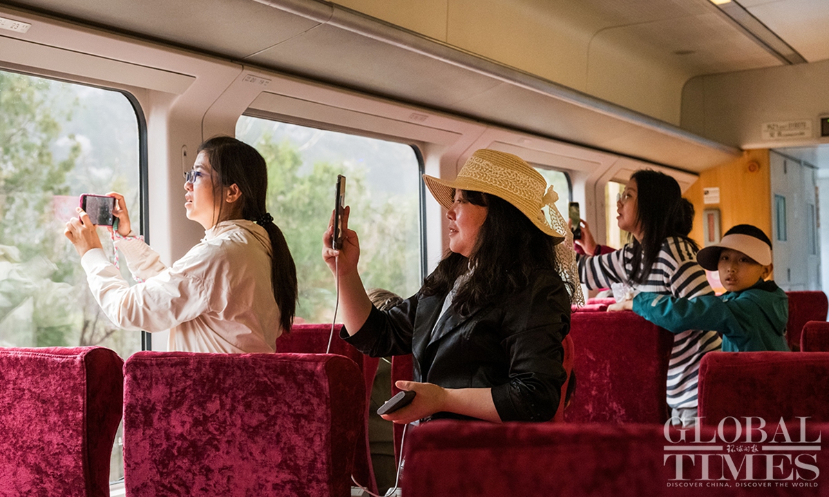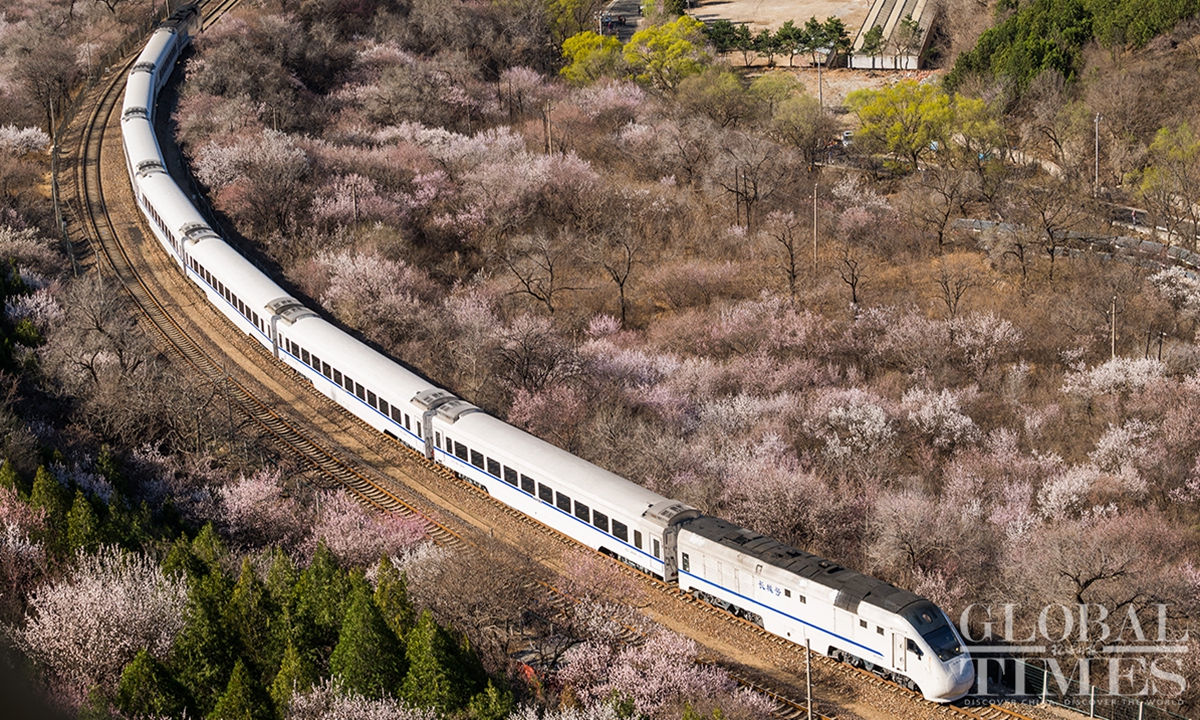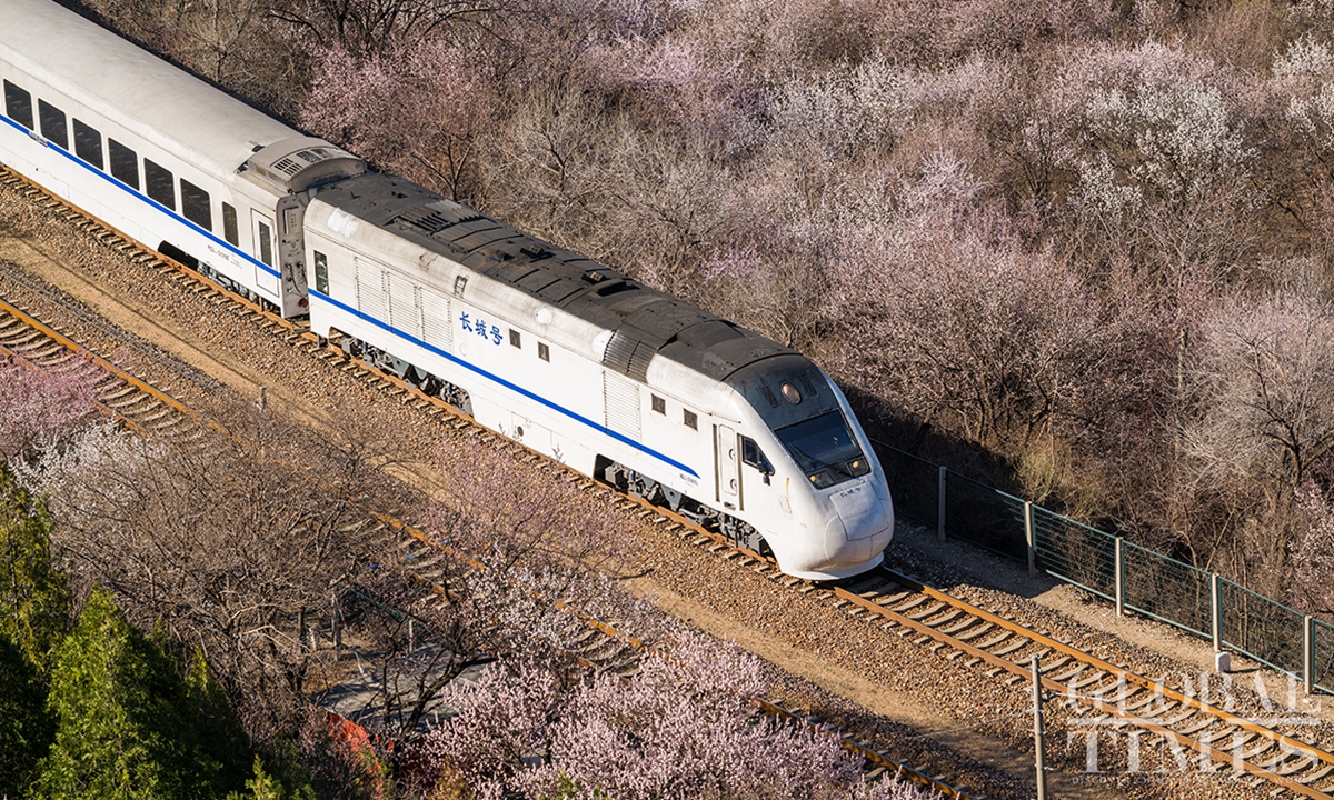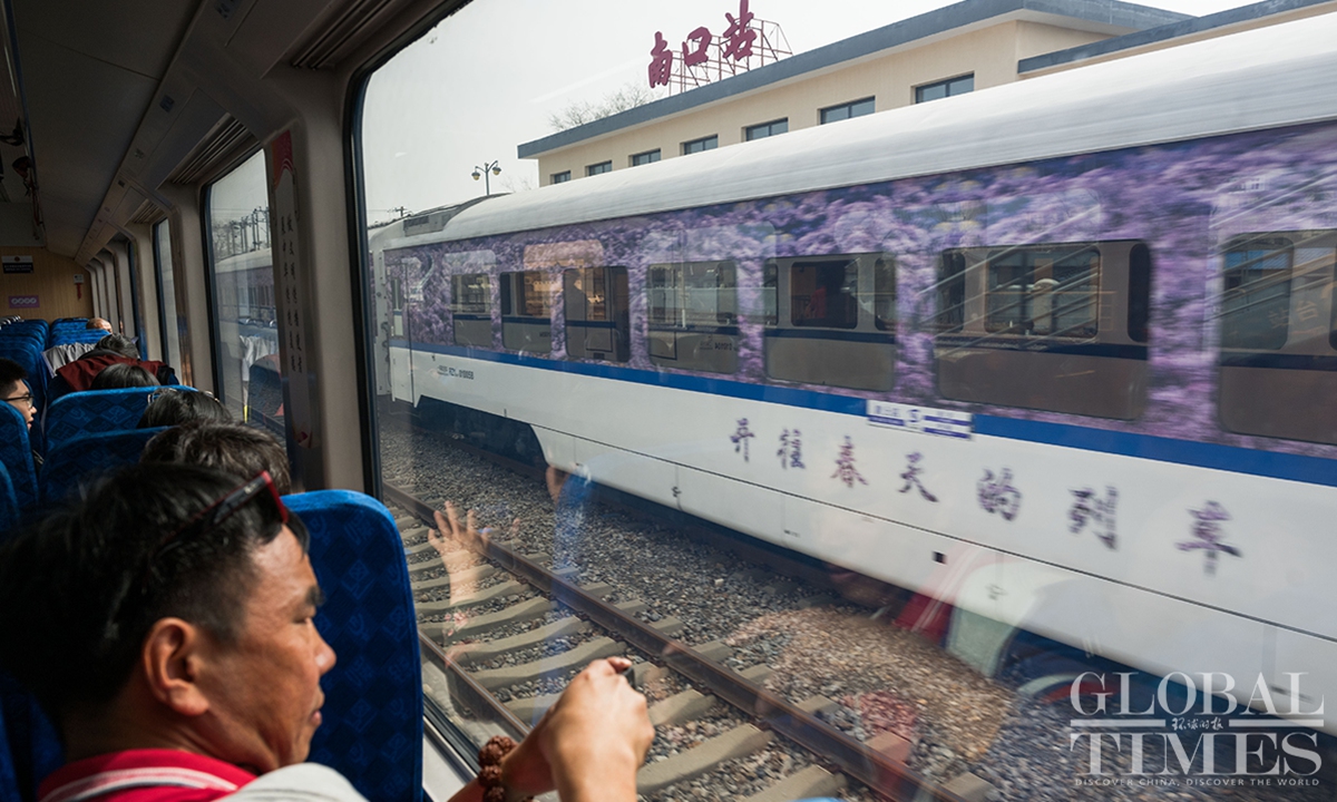 This mesmerizing floral display has transformed the train ride into a springtime highlight, drawing visitors who are eager to immerse themselves in the seasonal splendor of the flowers in full bloom. (Photo: Chen Tao/GT)