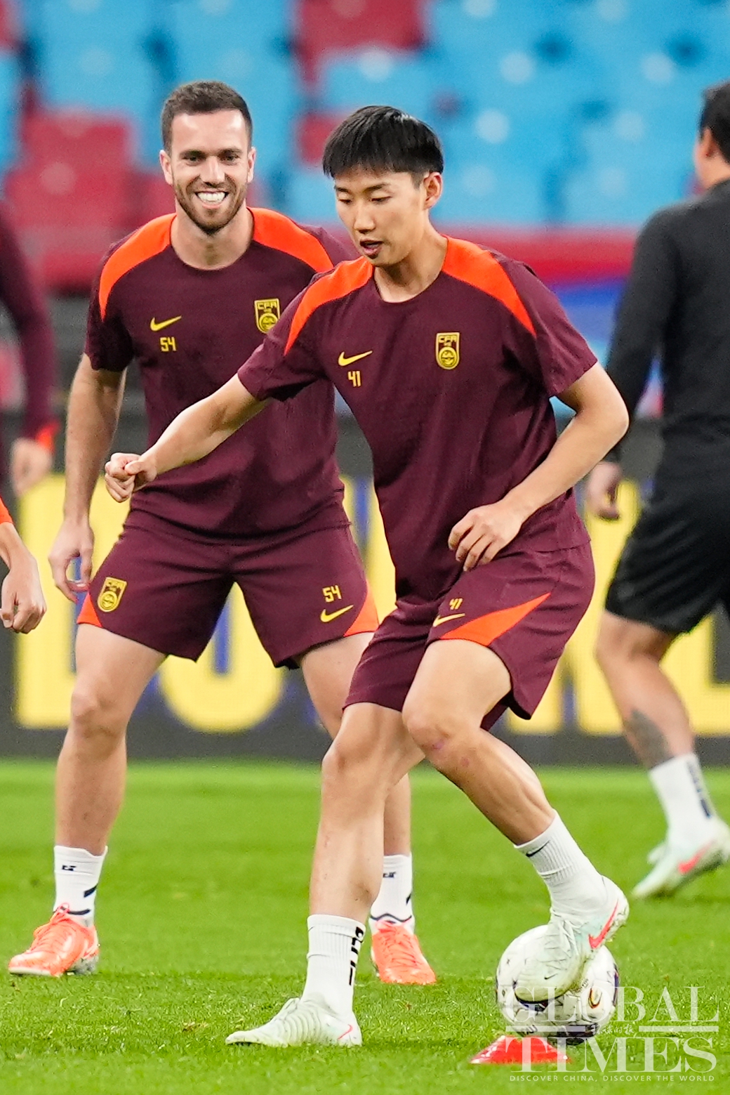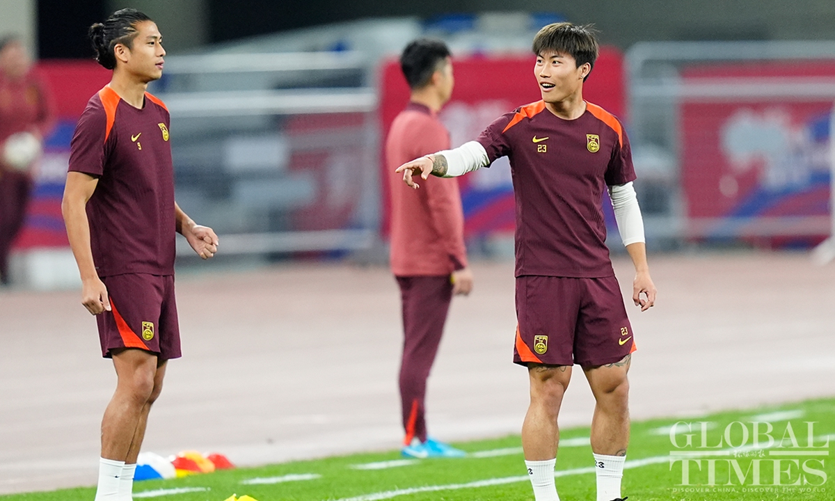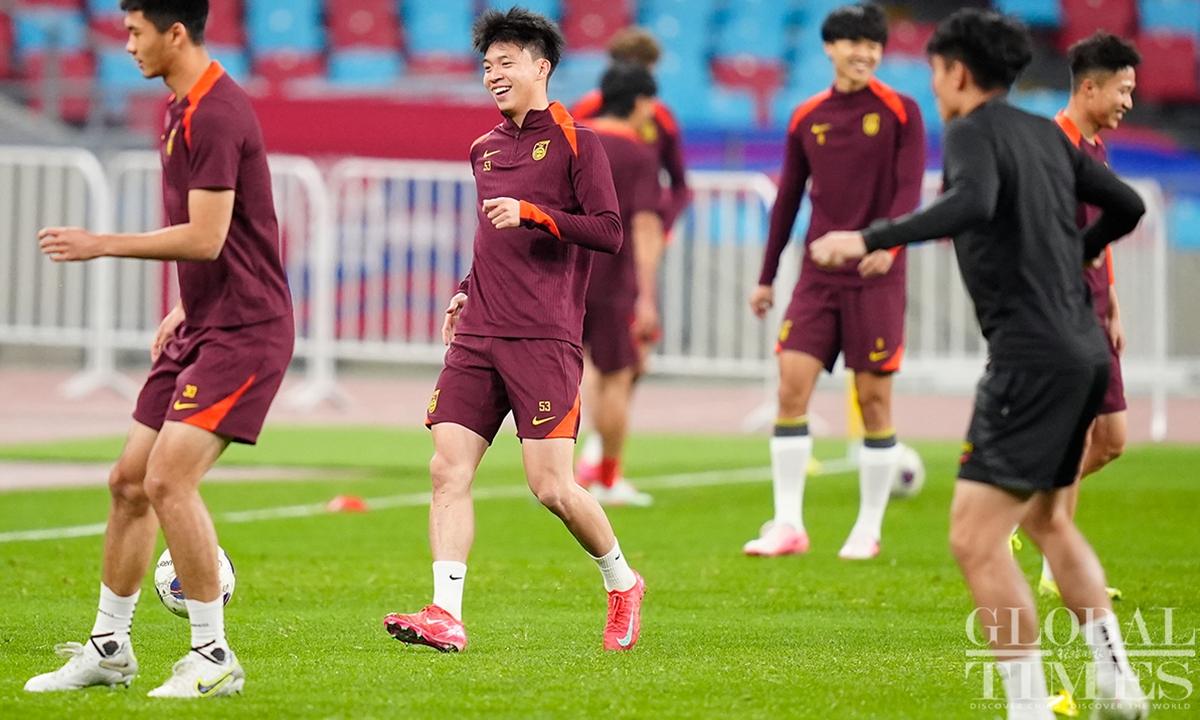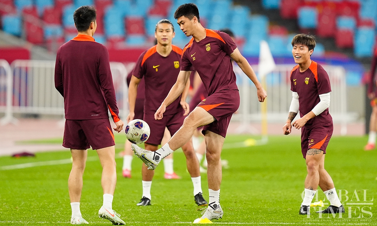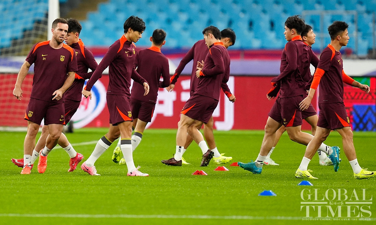 The Chinese national football team holds a training session in Hangzhou, East China’s Zhejiang Province on March 24, 2025, as it gears up for the crucial World Cup Asian qualifier against Australia scheduled for March 25. According to multiple media reports, over 67,000 tickets for the highly anticipated match have already been sold out.(Photo: Cui Meng/GT)