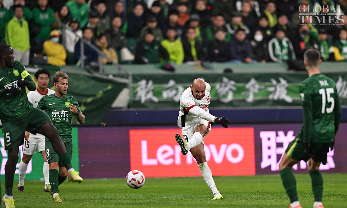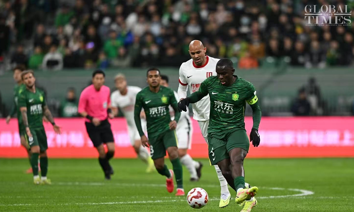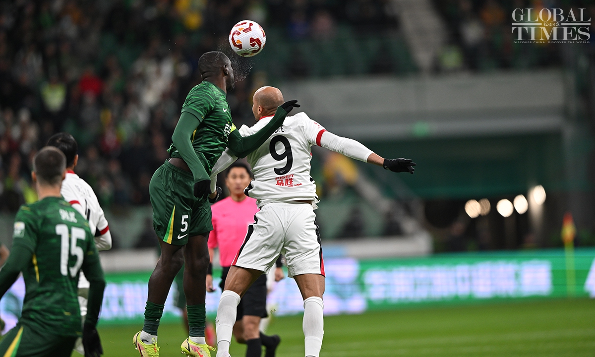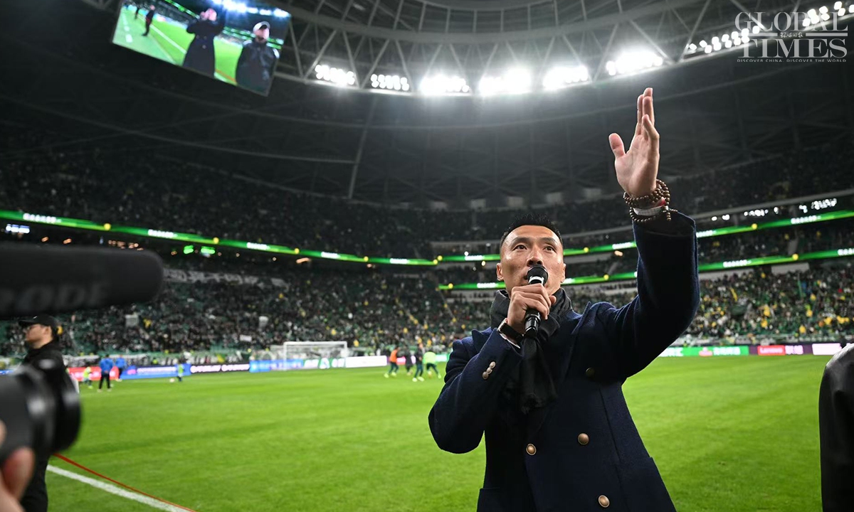 In a highly anticipated Chinese Super League match on Saturday, 10-man Beijing Guoan weathered a late storm from Chengdu Rongcheng to hold their opponents to a 1-1 draw at Workers' Stadium in Beijing. The match was Guoan’s first home game of the season, with a total of 52,982 spectators in attendance. Former Guoan captain Yu Dabao was honored with a retirement ceremony on the sidelines of the match. (Photos: Cui Meng/GT)