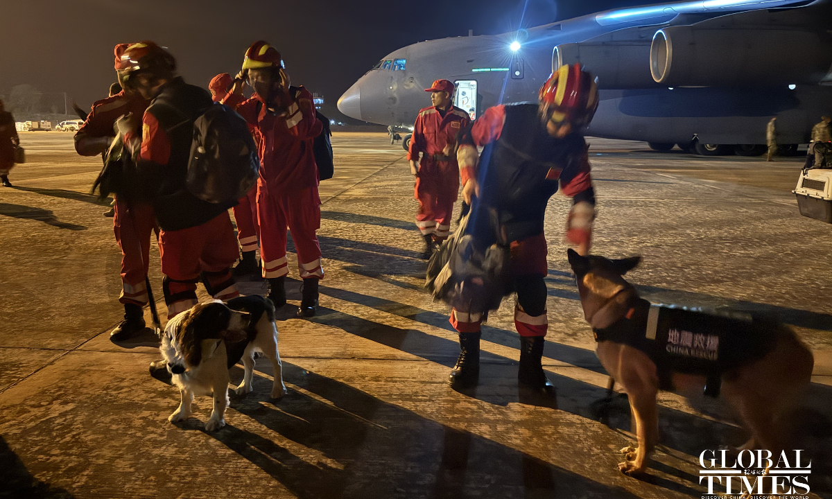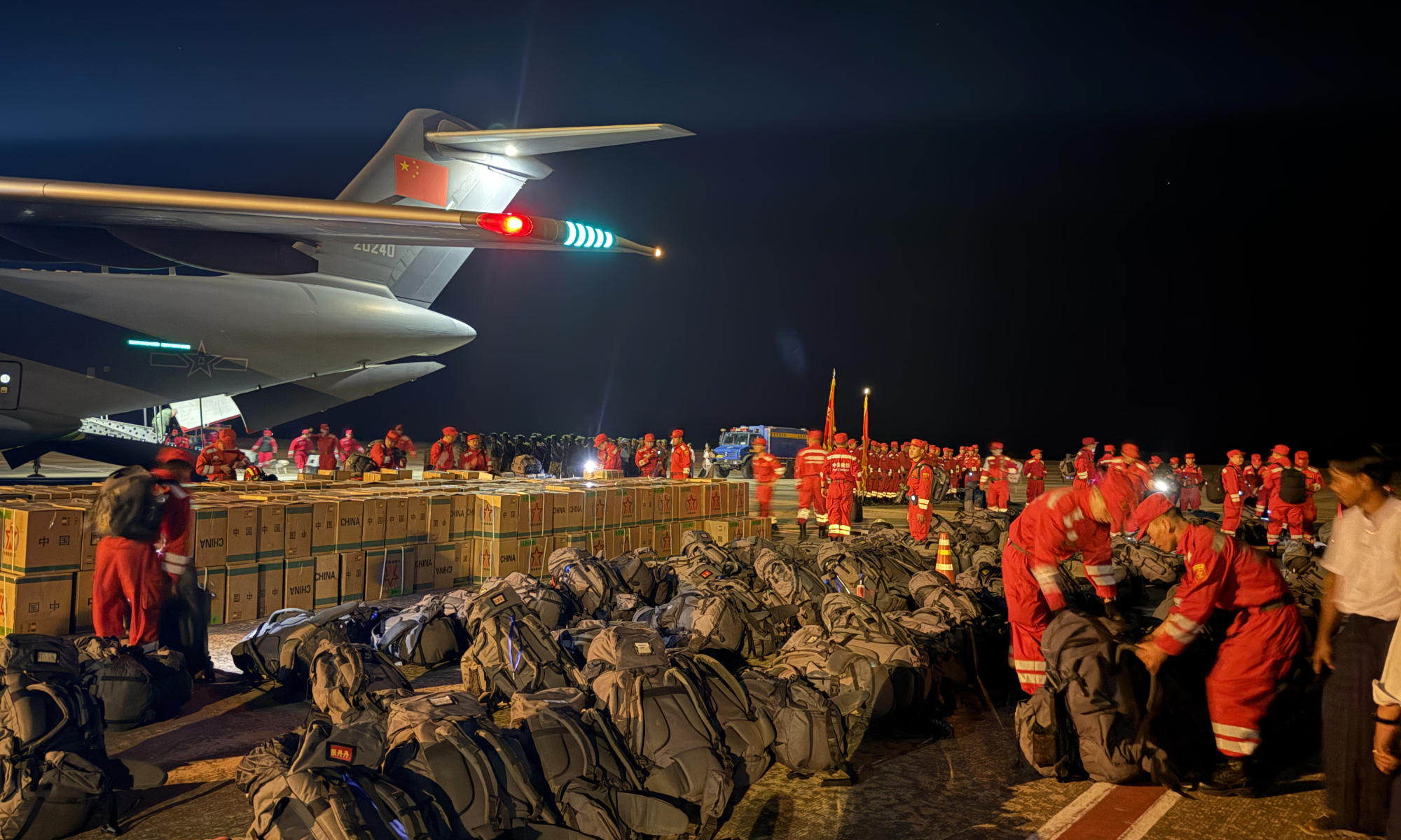 At 11 PM local time on March 30, 118 members of the China International Search and Rescue Team (CISAR), accompanied by six rescue dogs, two rescue vehicles, and 634 sets of rescue equipment and medical supplies, arrived in Nay Pyi Taw from Beijing on two Y-20 transport aircraft of the Chinese People's Liberation Army (PLA) Air Force to conduct emergency rescue operations.