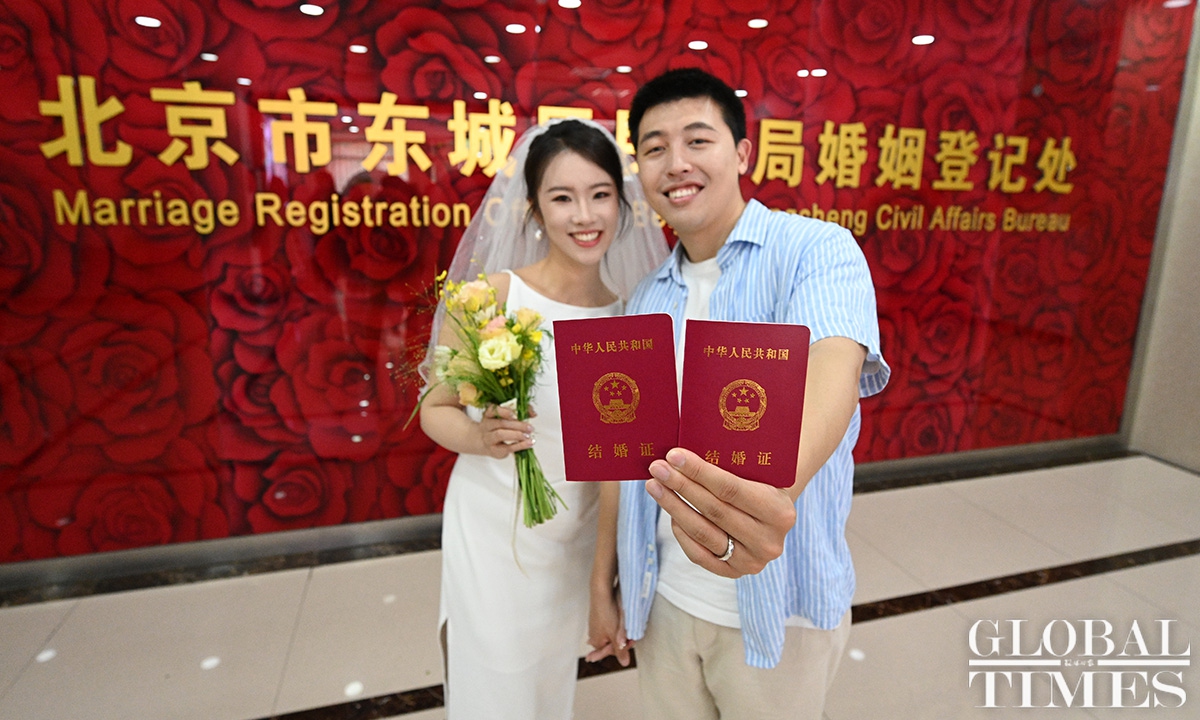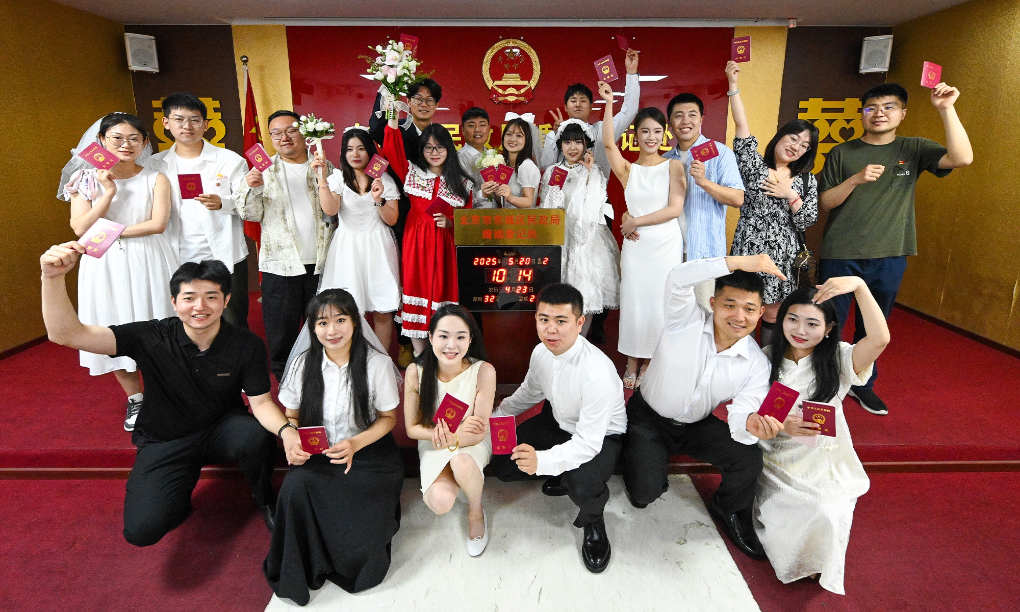Couples in Beijing obtain their marriage certificates on May 20
