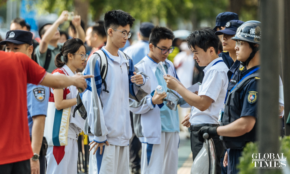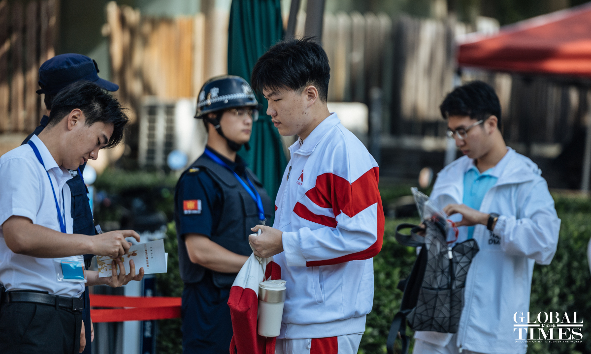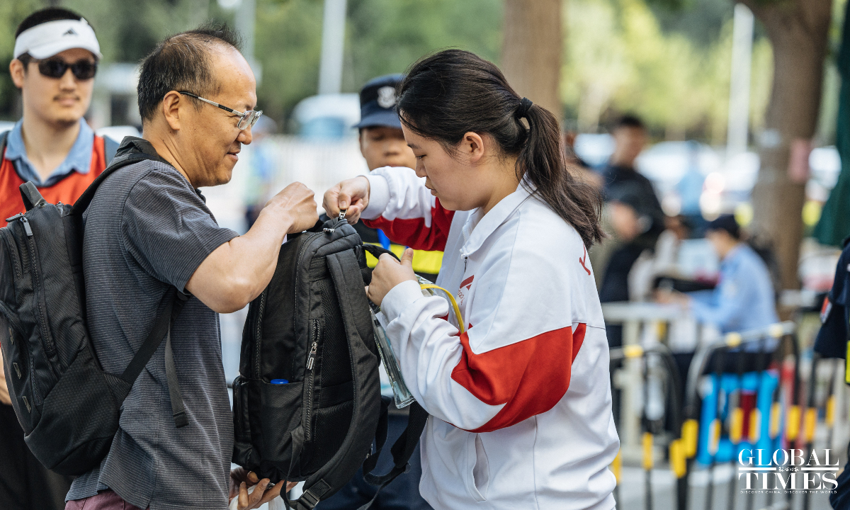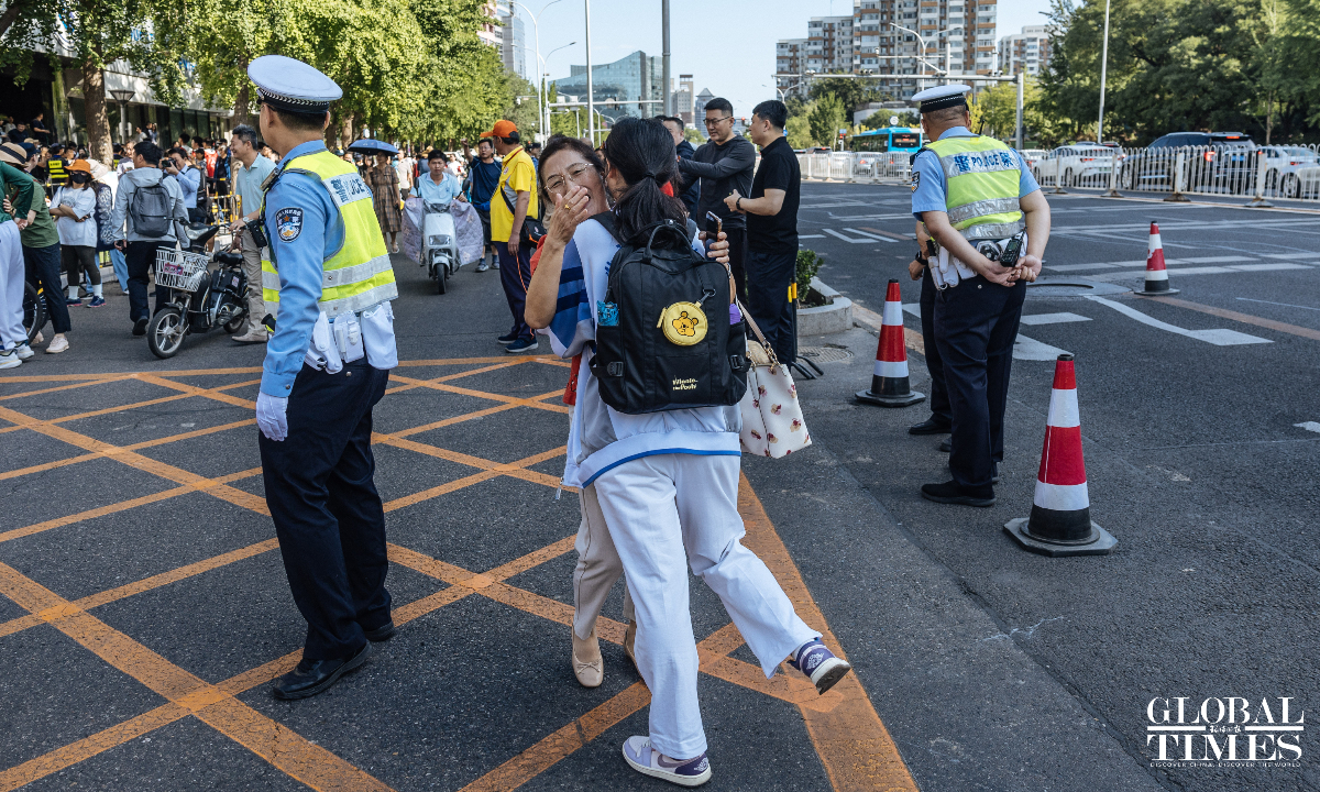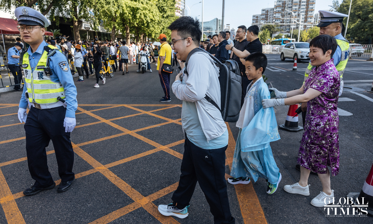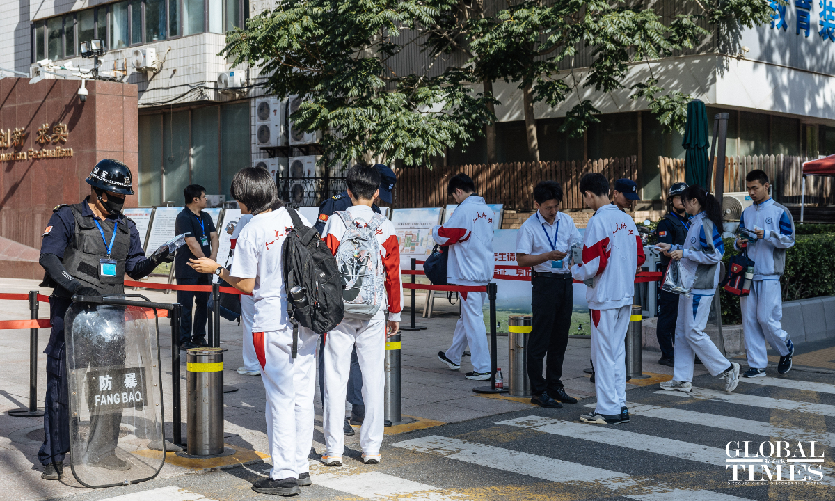 Outside the examination site of the High School Affiliated to Renmin University of China, candidates entered in an orderly manner. A designated candidate passage and an intelligent security gate were set up at the school gate. Traffic police were on-site to guide nearby traffic and ensure the safety and smooth progress of the examination. (Photos: Li Hao/GT)