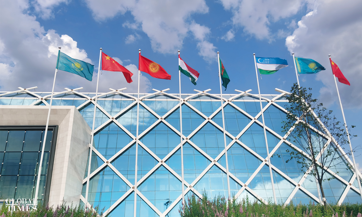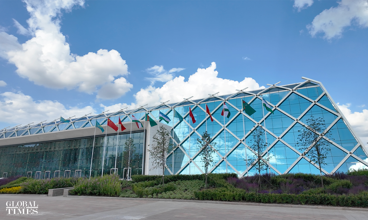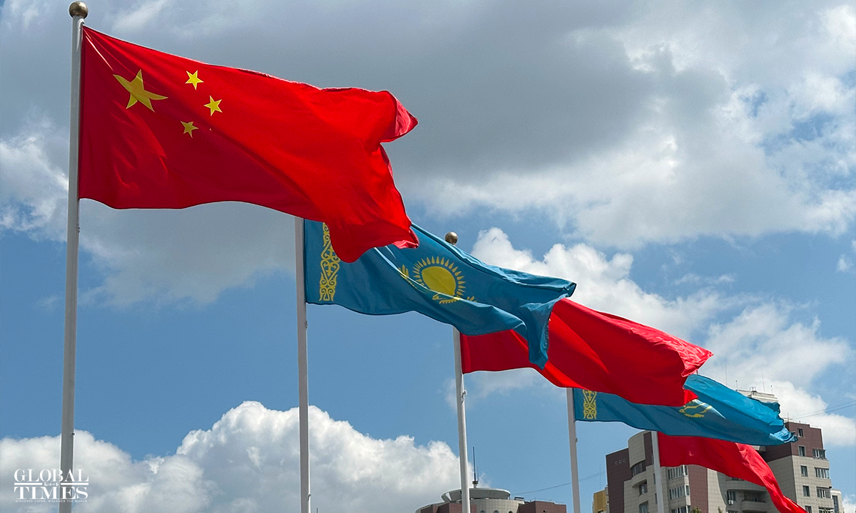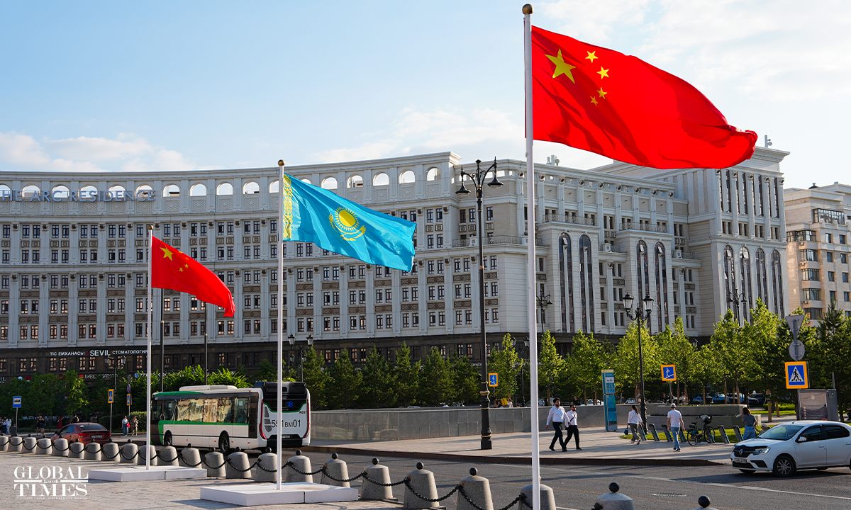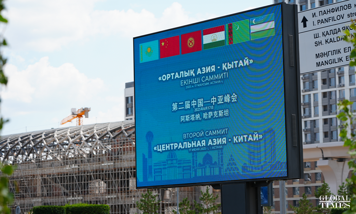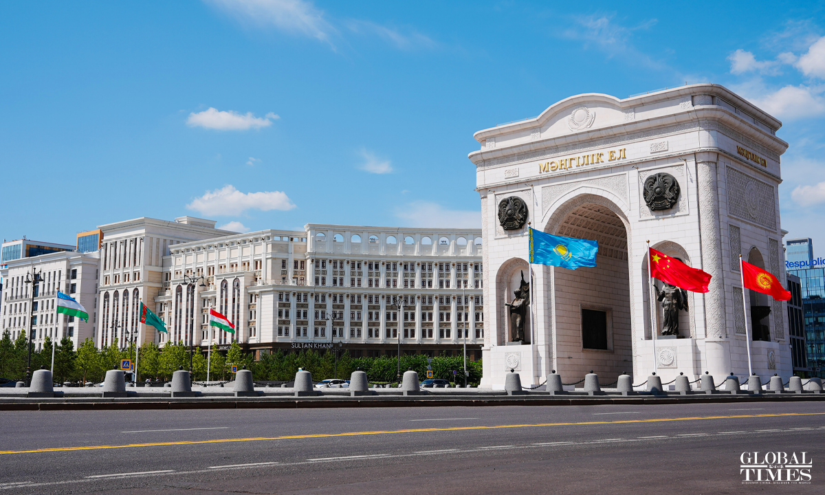 On June 17 local time, the second China-Central Asia Summit took place in Astana, the capital of Kazakhstan. Outdoor screens across the city featured summit posters with Chinese characters, while the national flags of China and the five Central Asian countries were seen flying at the Palace of Independence, the summit venue, and other key landmarks in Astana. Photo: Xue Ke, Hu Yuwei/GT