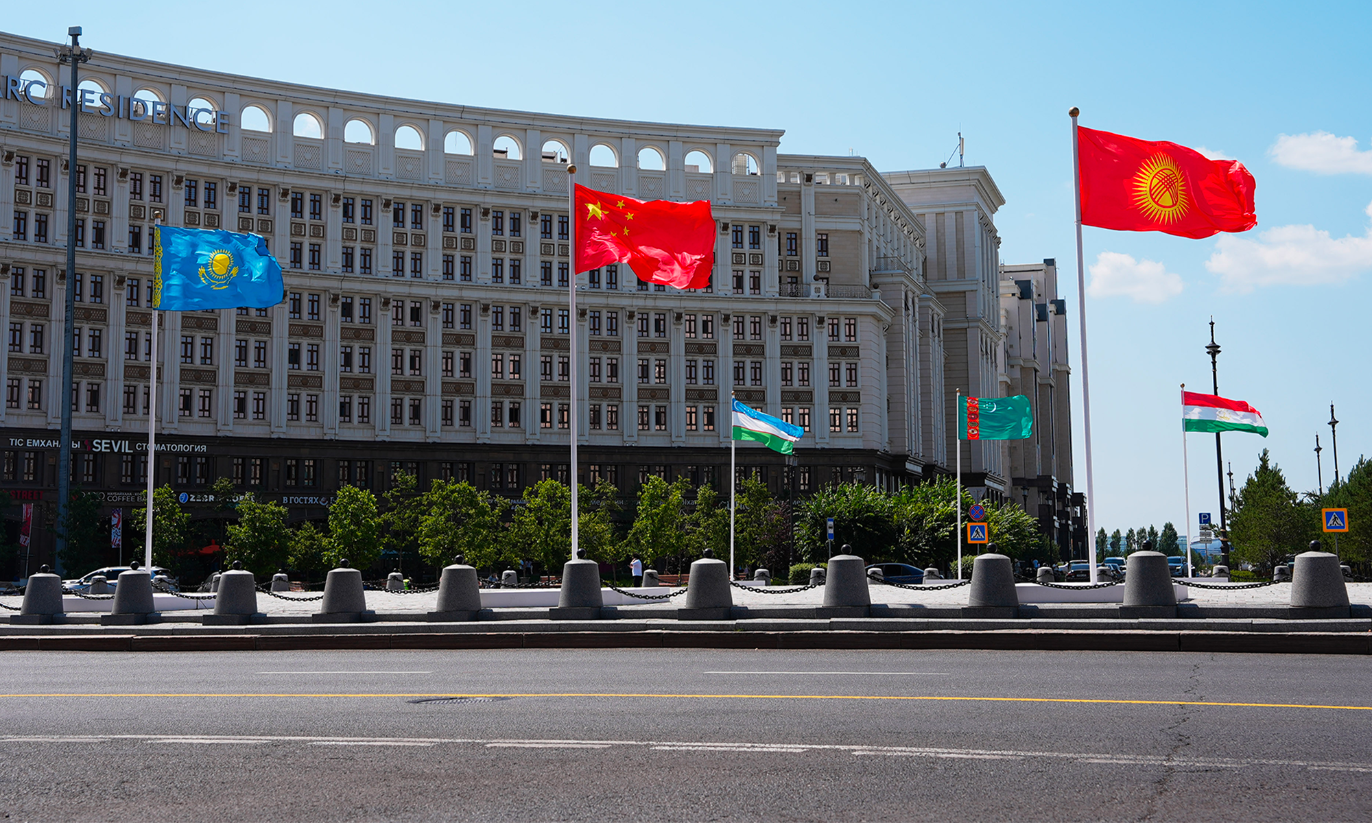 National flags of China and five Central Asian countries displayed at key landmarks as the 2nd China-Central Asia Summit held in Astana