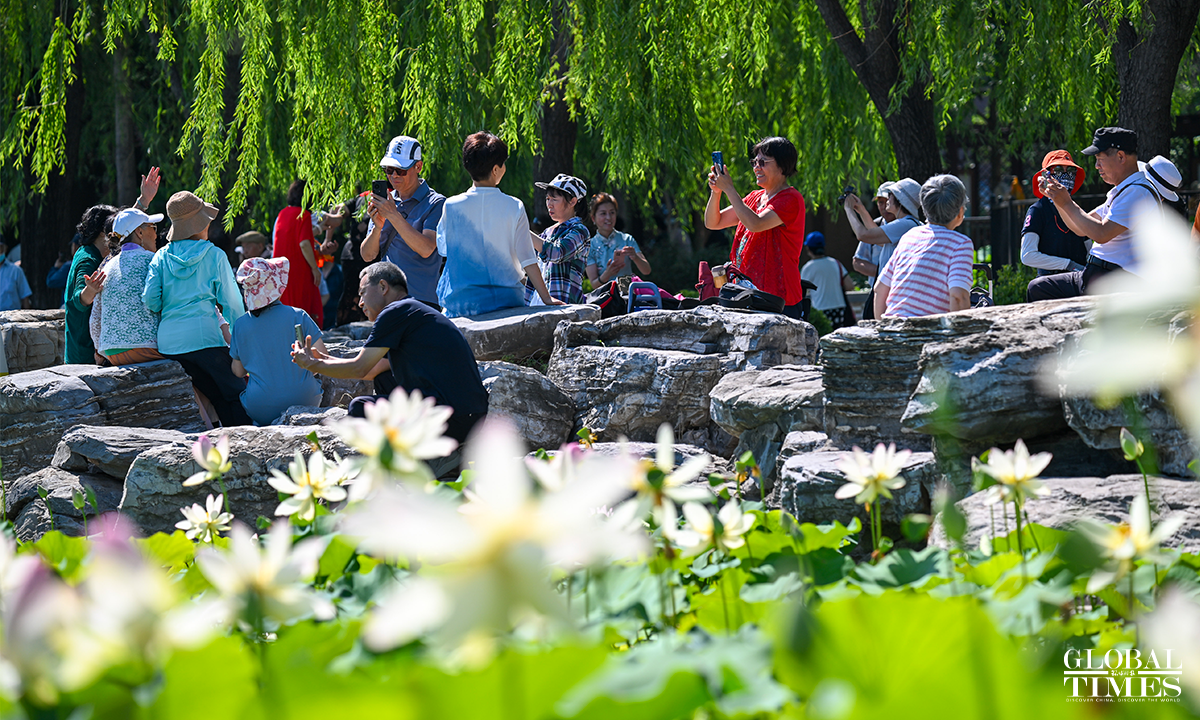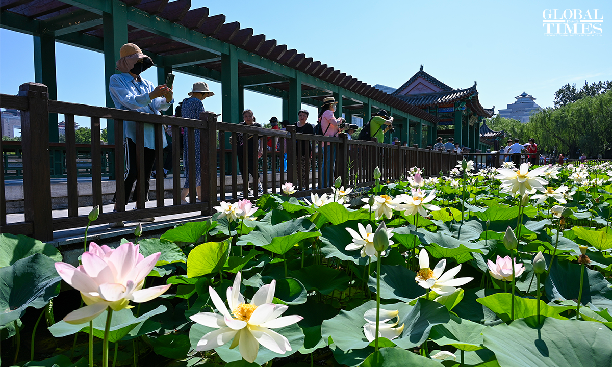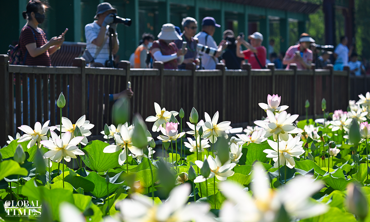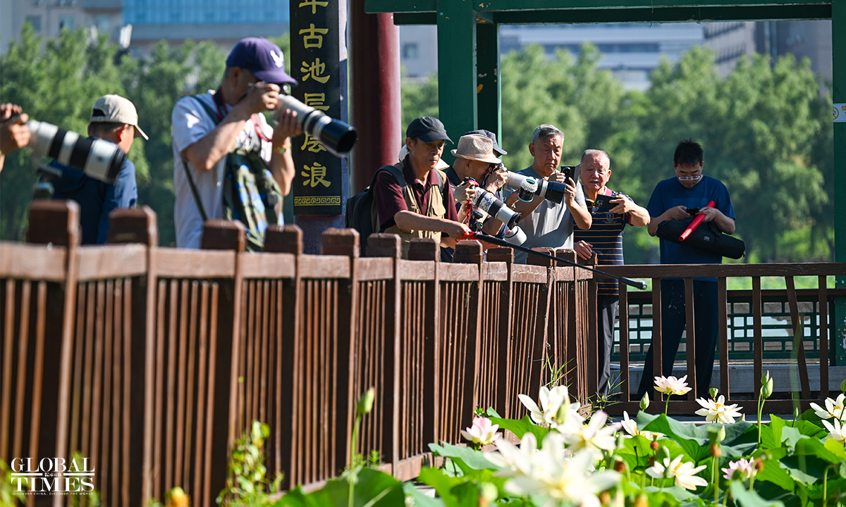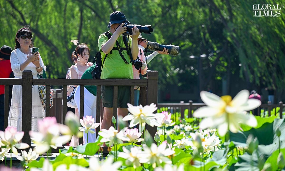 As temperatures rise, lotus flowers have begun to bloom across major parks in Beijing, including Lianhuachi Park, Zizhuyuan Park, and the Old Summer Palace (Yuanmingyuan). On June 20, the blossoming lotuses attracted large number of residents and tourists who came to admire the scenery, take photos, and enjoy the beauty of summer. Photos: Chen Tao/GT