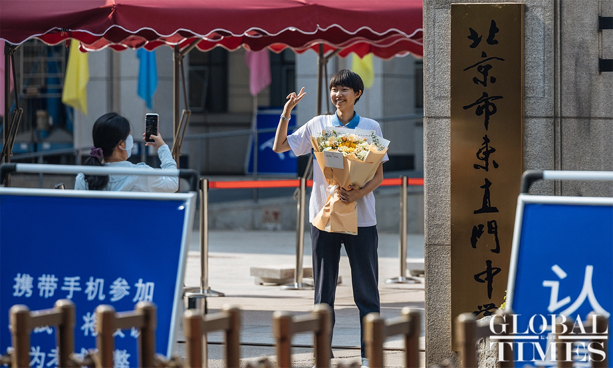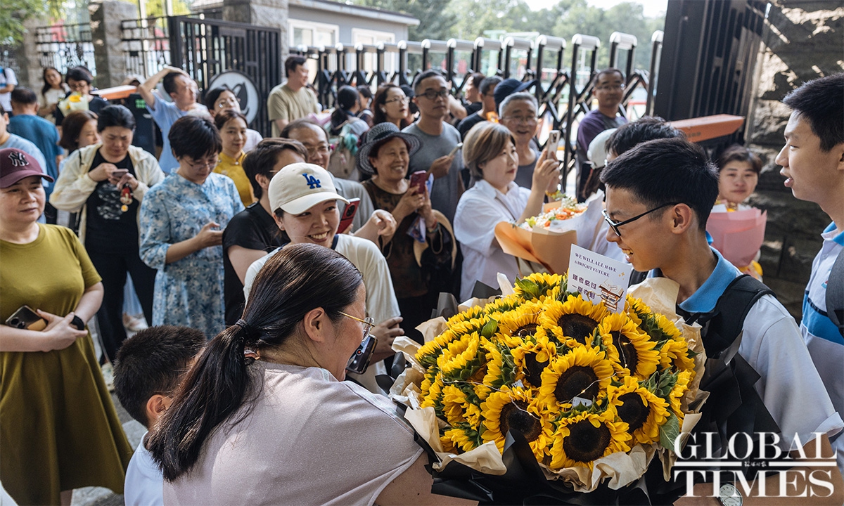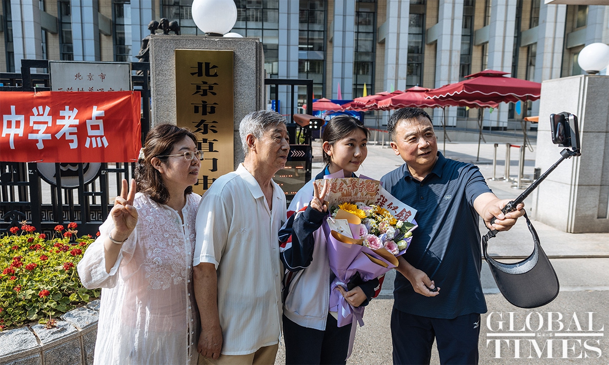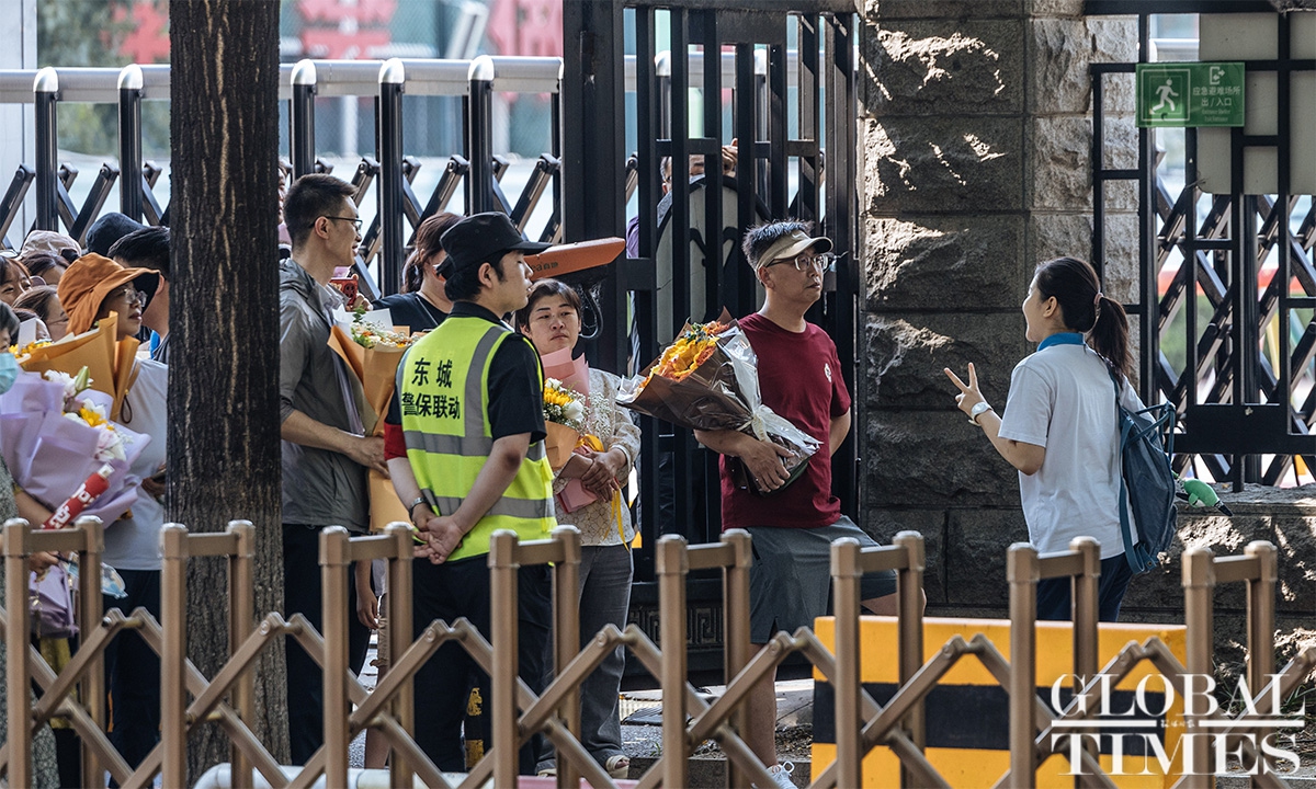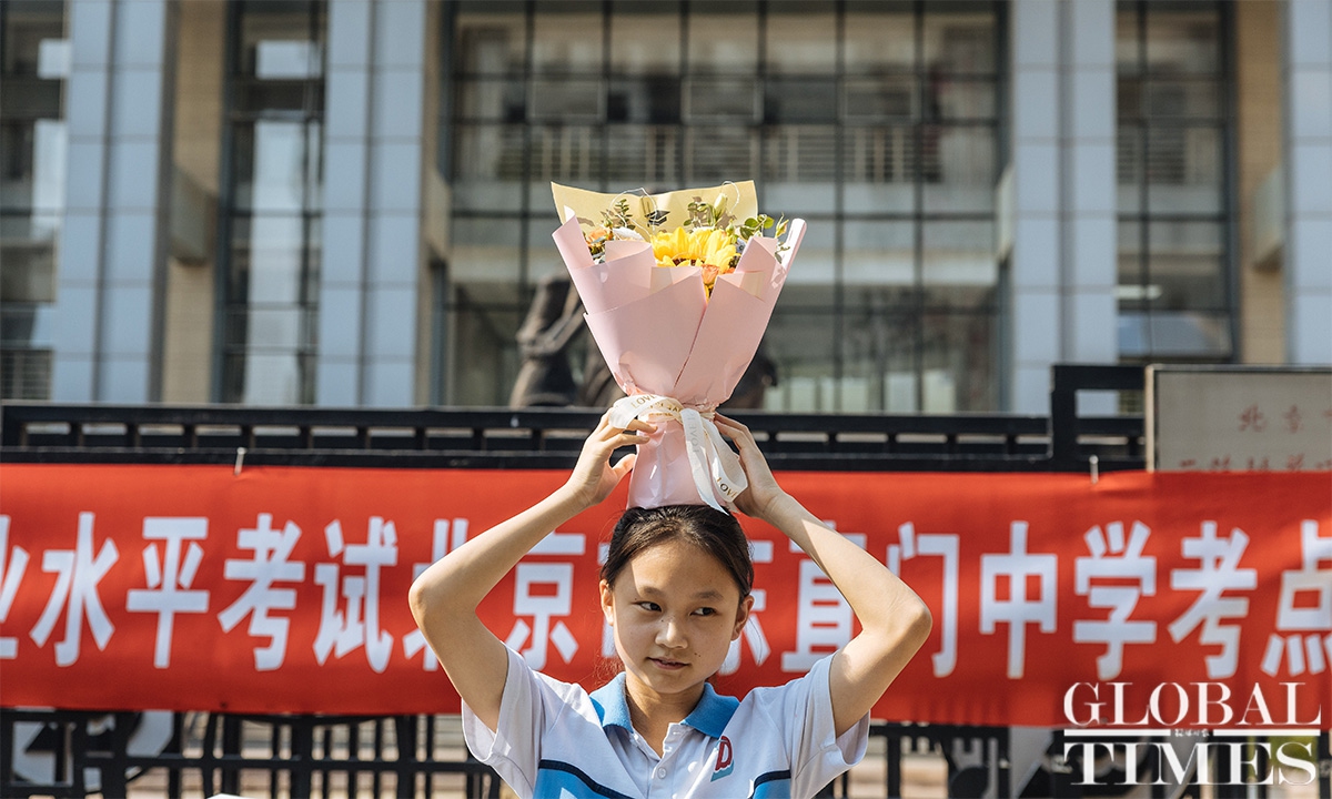 On June 25, the last day of the senior high school entrance exam in Beijing, parents waiting for their children held flowers to offer their blessings and took photos together at the examination site.