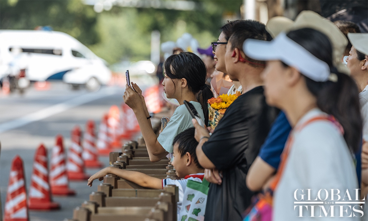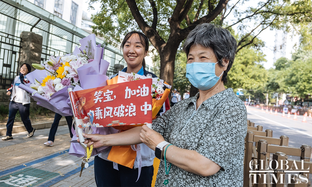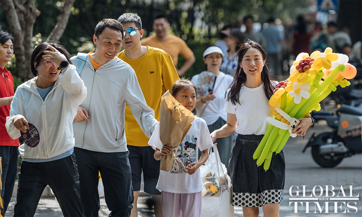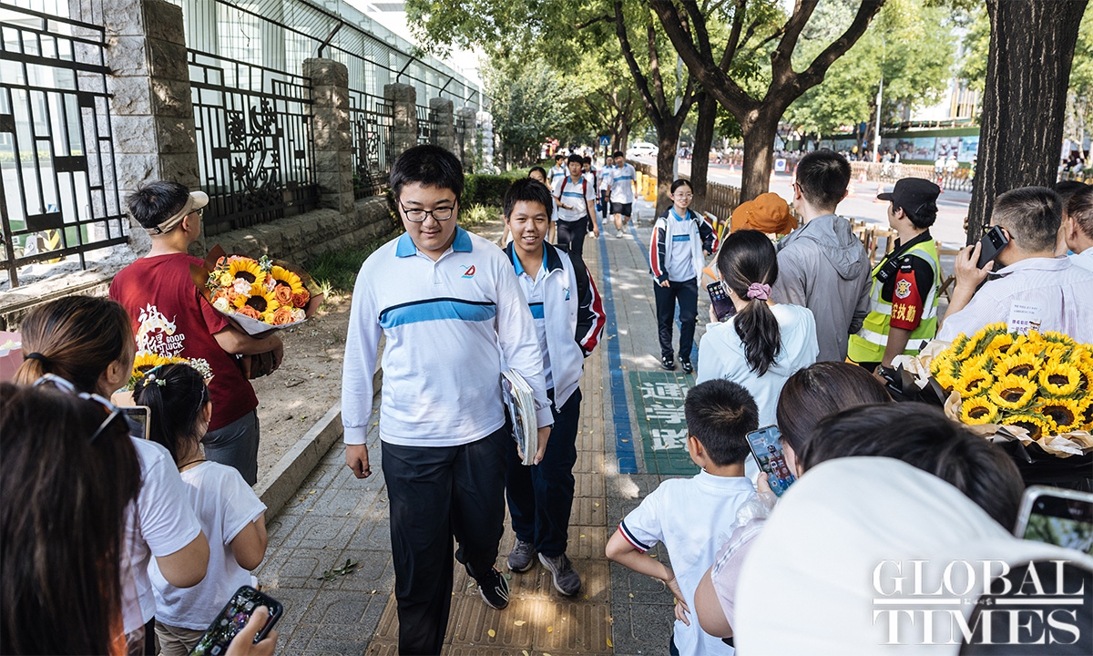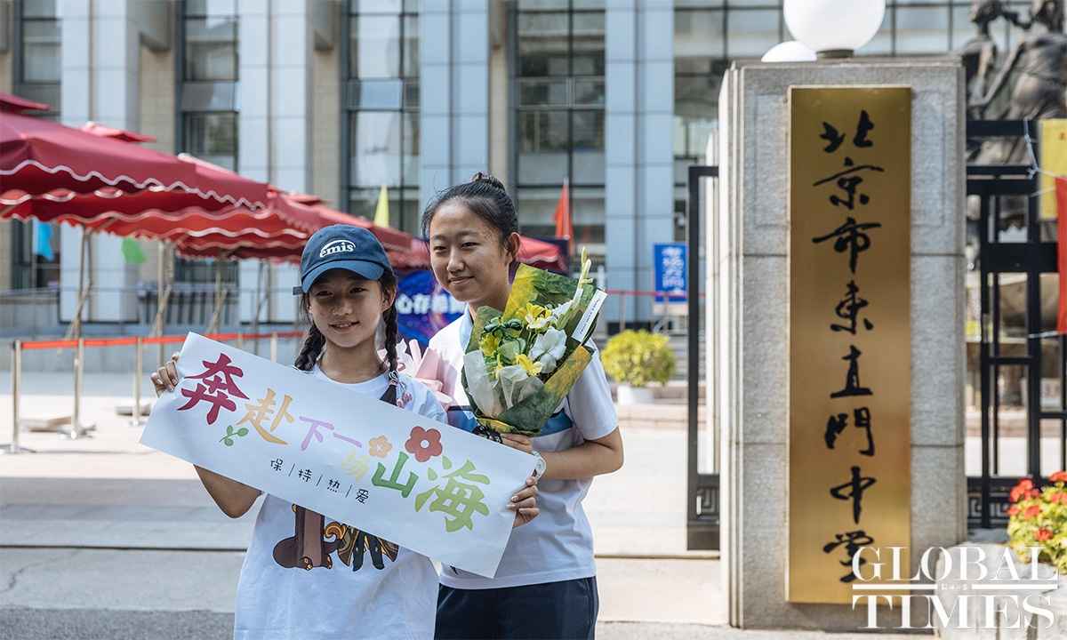 On June 25, the last day of the senior high school entrance exam in Beijing, parents waiting for their children held flowers to offer their blessings and took photos together at the examination site.