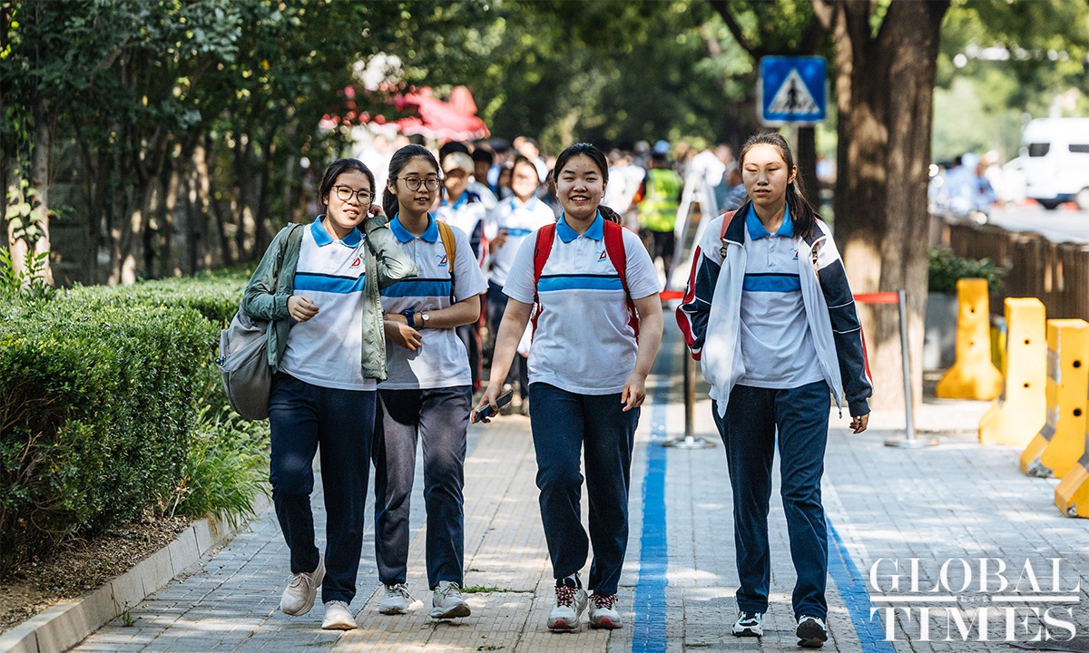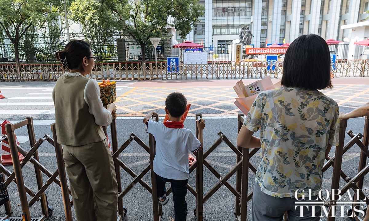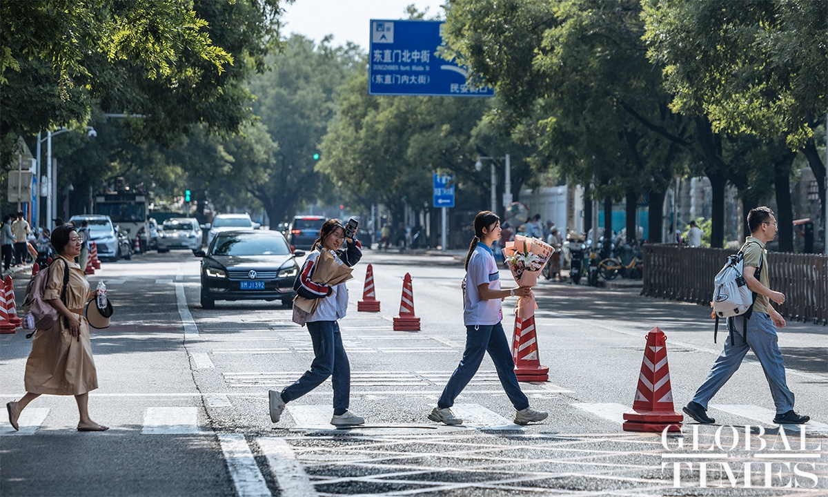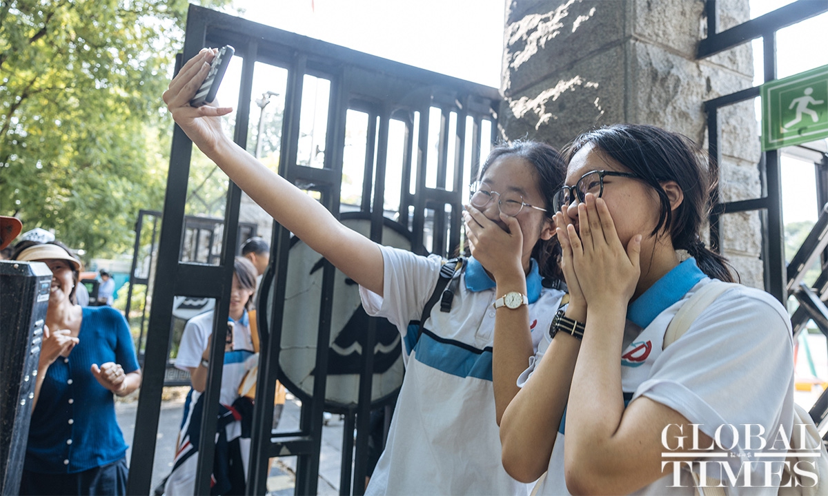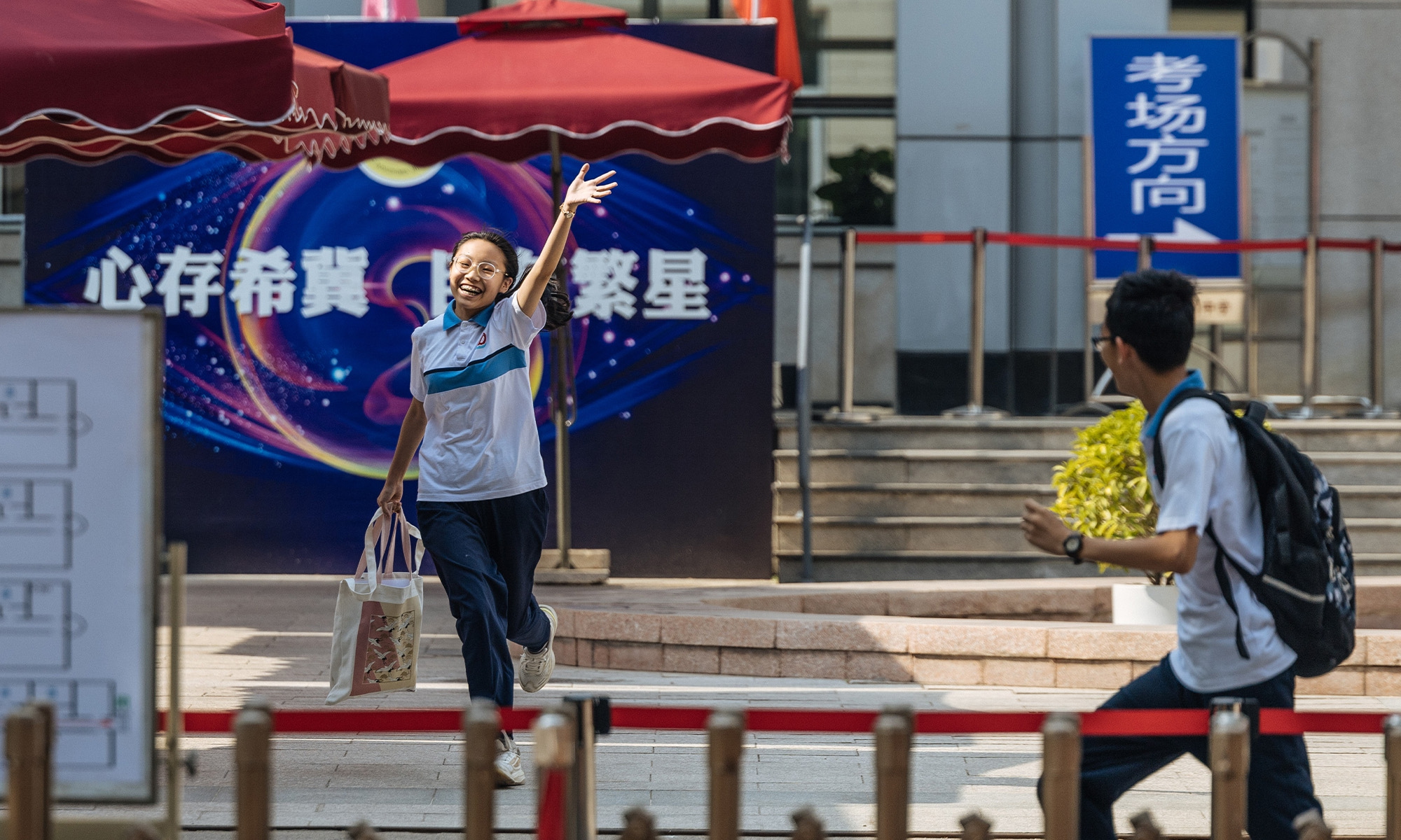 On June 25, the last day of the senior high school entrance exam in Beijing, parents waiting for their children held flowers to offer their blessings and took photos together at the examination site.