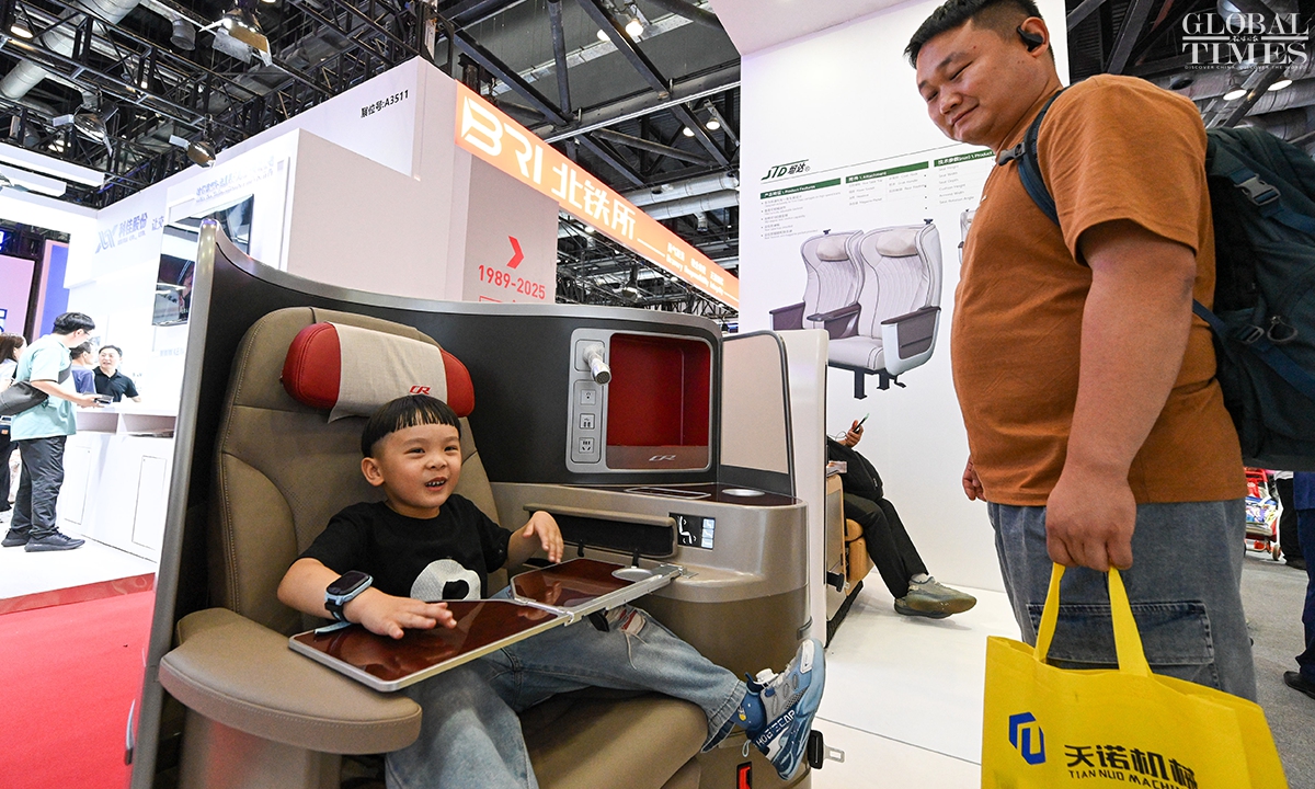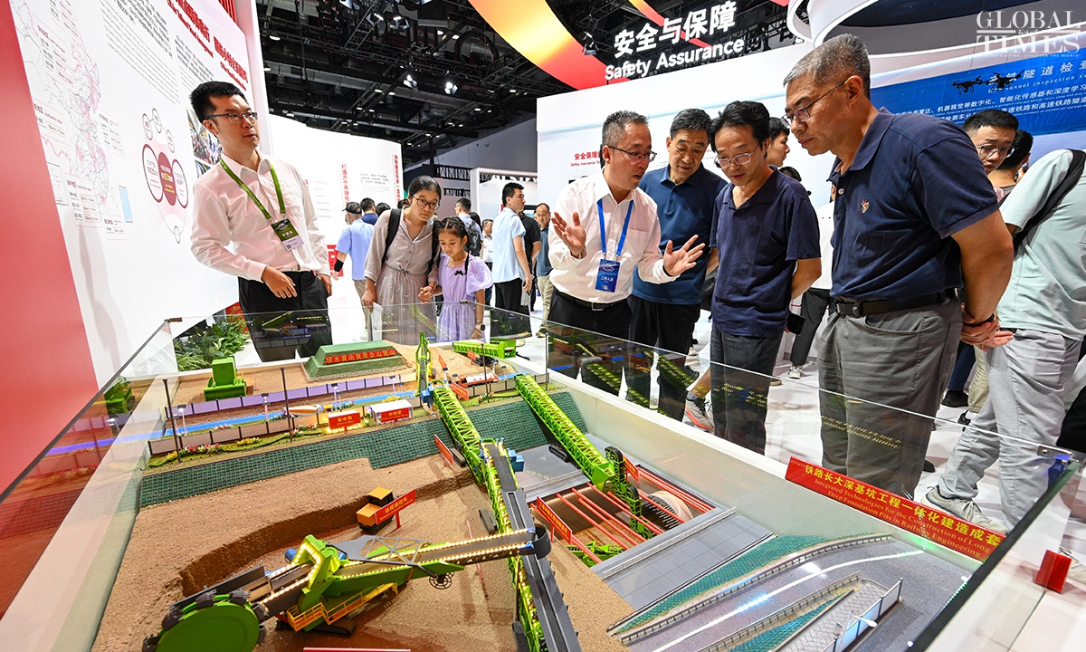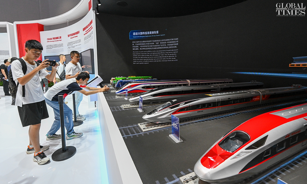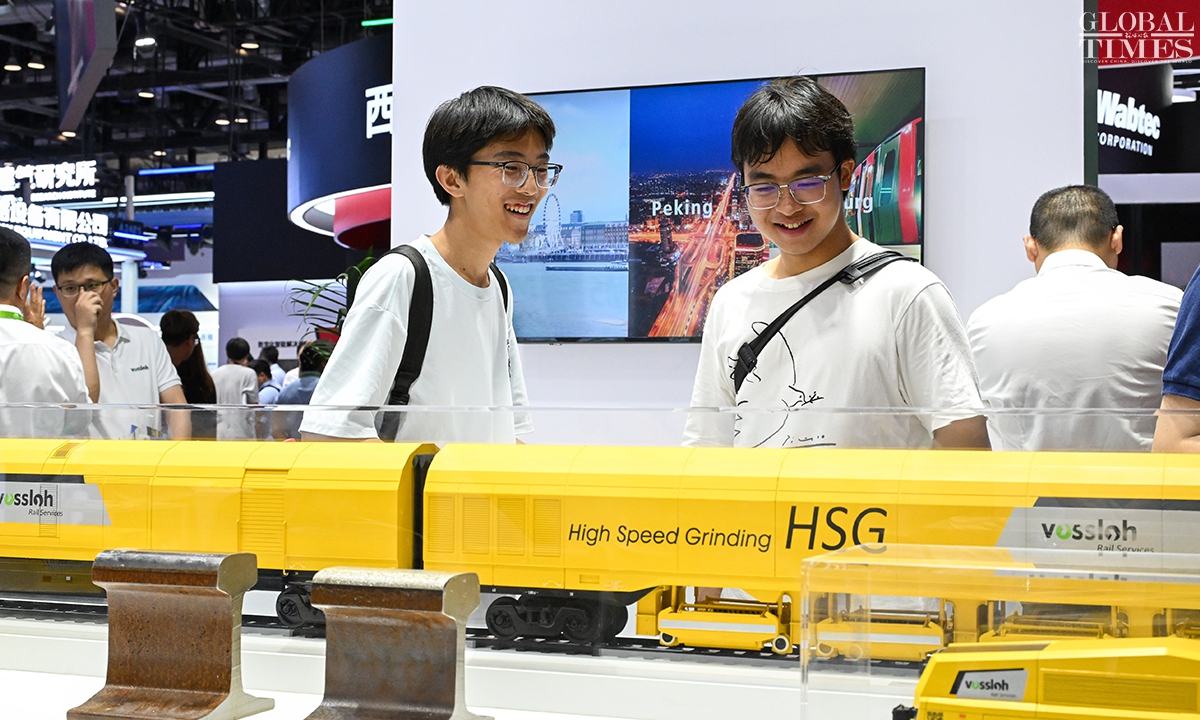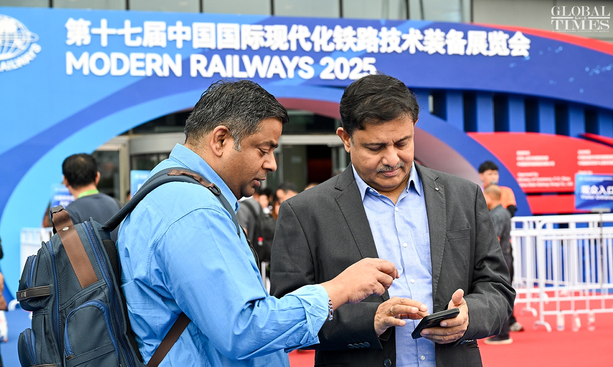 MODERN RAILWAYS 2025, an expo showcasing the latest railway technology and equipment, kicked off in Beijing on Tuesday. The exhibition is divided into two zones — indoor and outdoor — and covers a total area of 40,000 square meters. The indoor exhibition zone at the Beijing National Convention Center encompasses 16 themed exhibition sections, exhibiting latest technologies and products in all railway specialties. The outdoor exhibition zone, situated at the National Railway Testing Center, features a real vehicle display line stretching 5,000 meters. It mainly showcases real vehicles such as EMUs (intelligent EMUs), locomotives, high-speed comprehensive inspection trains and large-scale track maintenance machinery. (Photos: Chen Tao/GT)