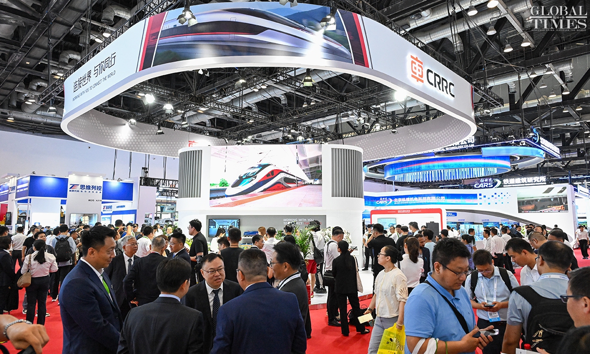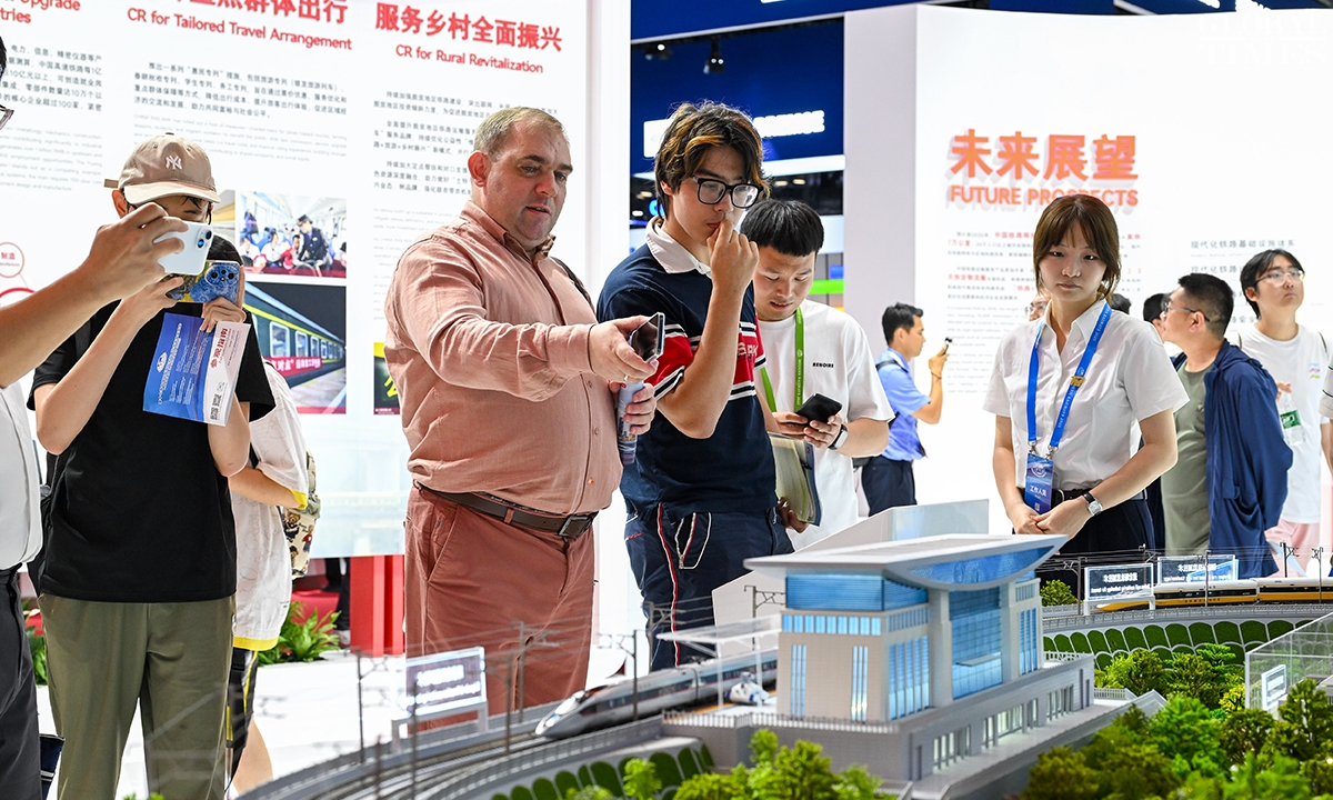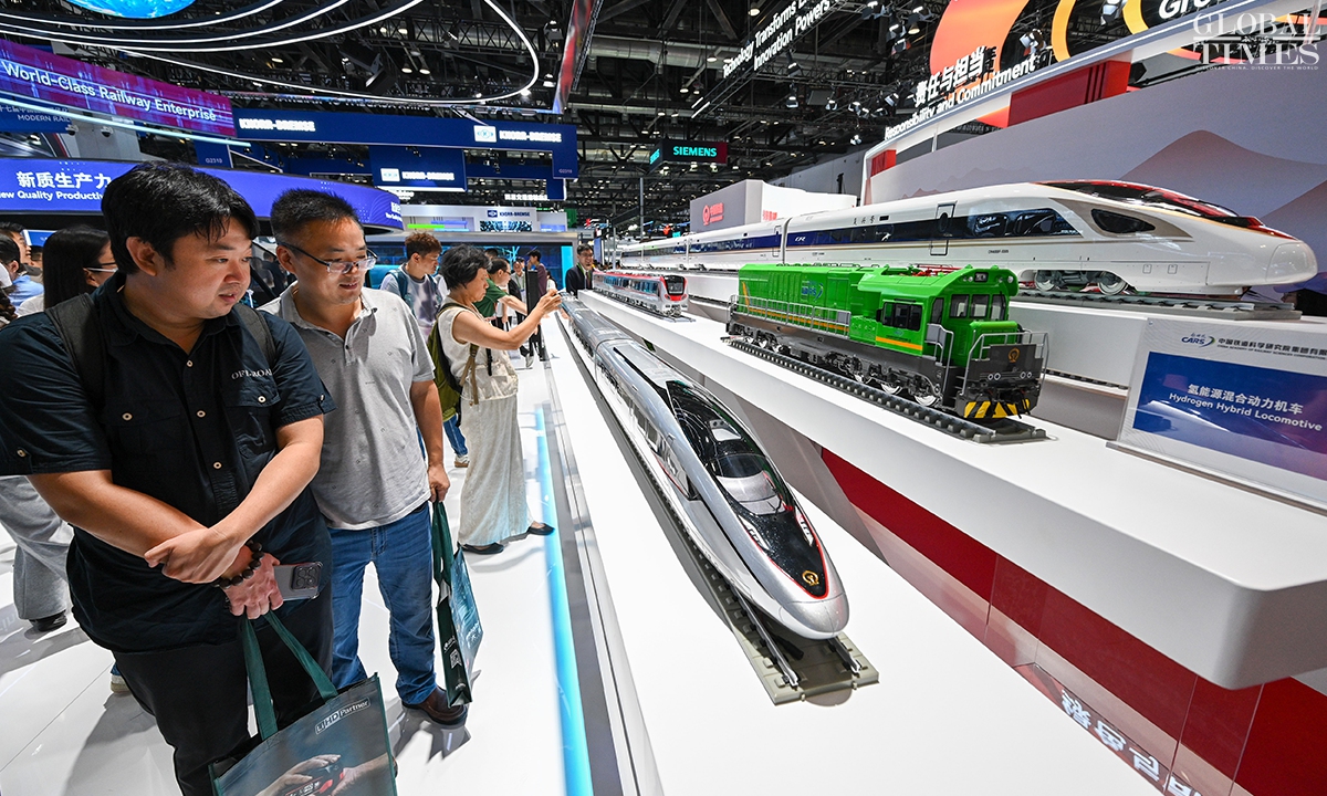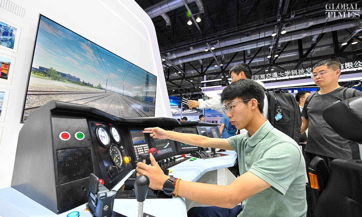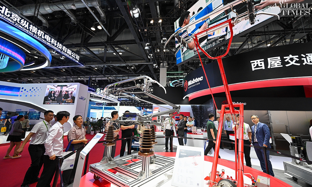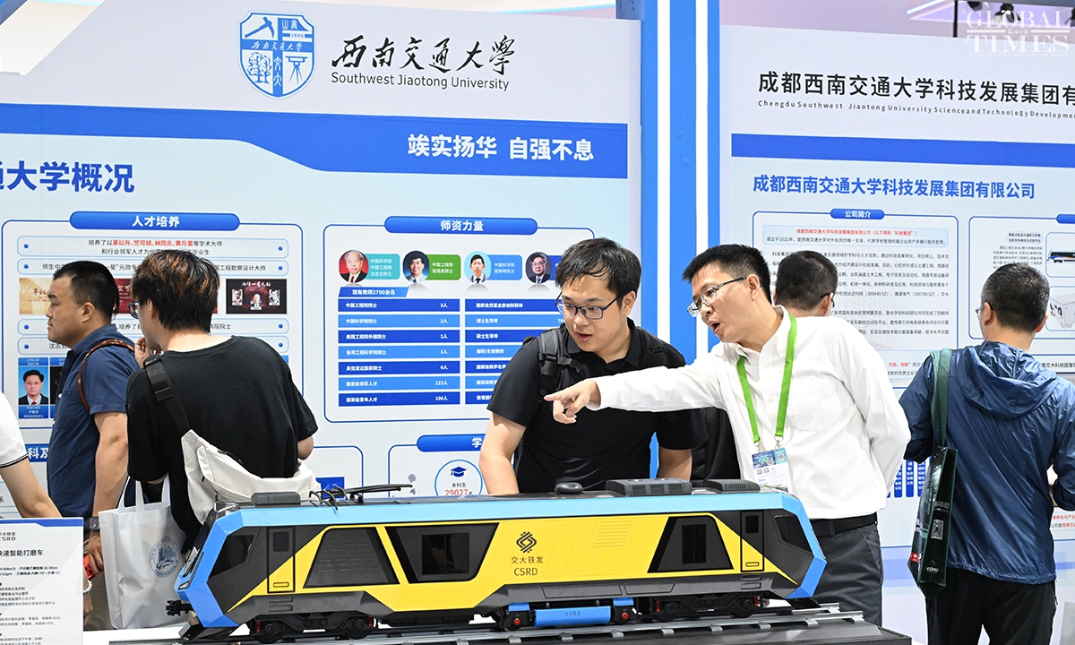 MODERN RAILWAYS 2025, an expo showcasing the latest railway technology and equipment, kicked off in Beijing on Tuesday. The exhibition is divided into two zones — indoor and outdoor — and covers a total area of 40,000 square meters. The indoor exhibition zone at the Beijing National Convention Center encompasses 16 themed exhibition sections, exhibiting latest technologies and products in all railway specialties. The outdoor exhibition zone, situated at the National Railway Testing Center, features a real vehicle display line stretching 5,000 meters. It mainly showcases real vehicles such as EMUs (intelligent EMUs), locomotives, high-speed comprehensive inspection trains and large-scale track maintenance machinery. (Photos: Chen Tao/GT)