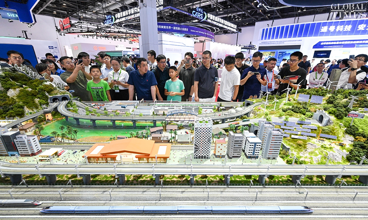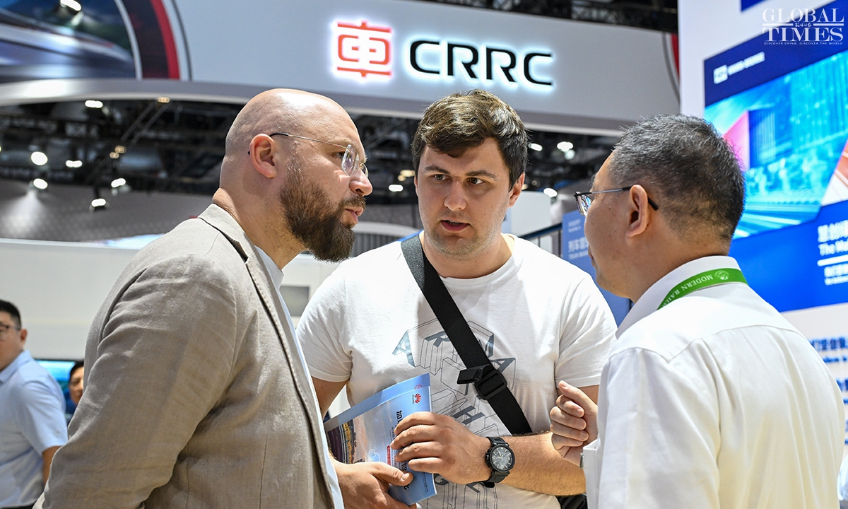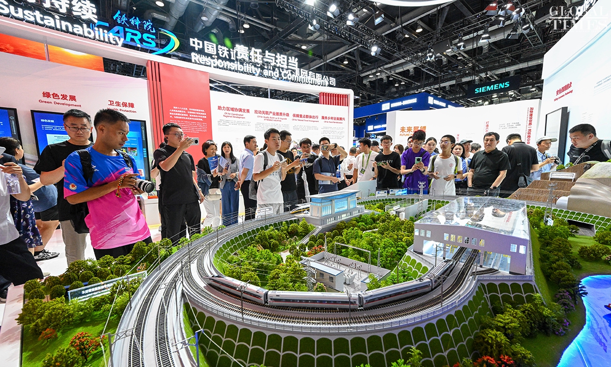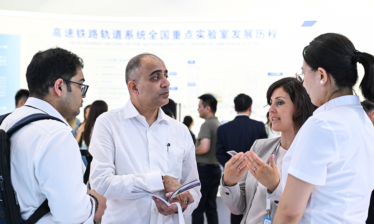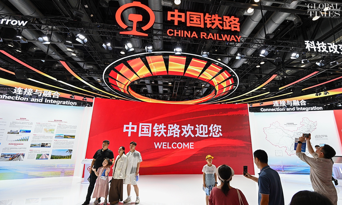 MODERN RAILWAYS 2025, an expo showcasing the latest railway technology and equipment, kicked off in Beijing on Tuesday. The exhibition is divided into two zones — indoor and outdoor — and covers a total area of 40,000 square meters. The indoor exhibition zone at the Beijing National Convention Center encompasses 16 themed exhibition sections, exhibiting latest technologies and products in all railway specialties. The outdoor exhibition zone, situated at the National Railway Testing Center, features a real vehicle display line stretching 5,000 meters. It mainly showcases real vehicles such as EMUs (intelligent EMUs), locomotives, high-speed comprehensive inspection trains and large-scale track maintenance machinery. (Photos: Chen Tao/GT)