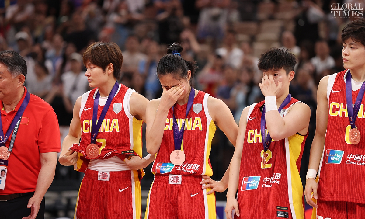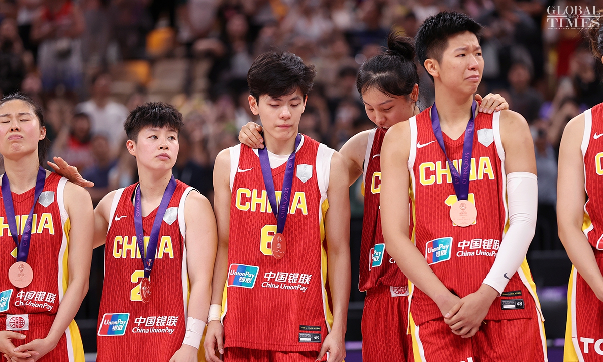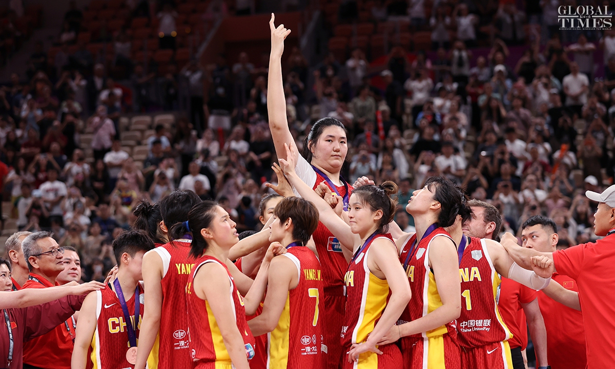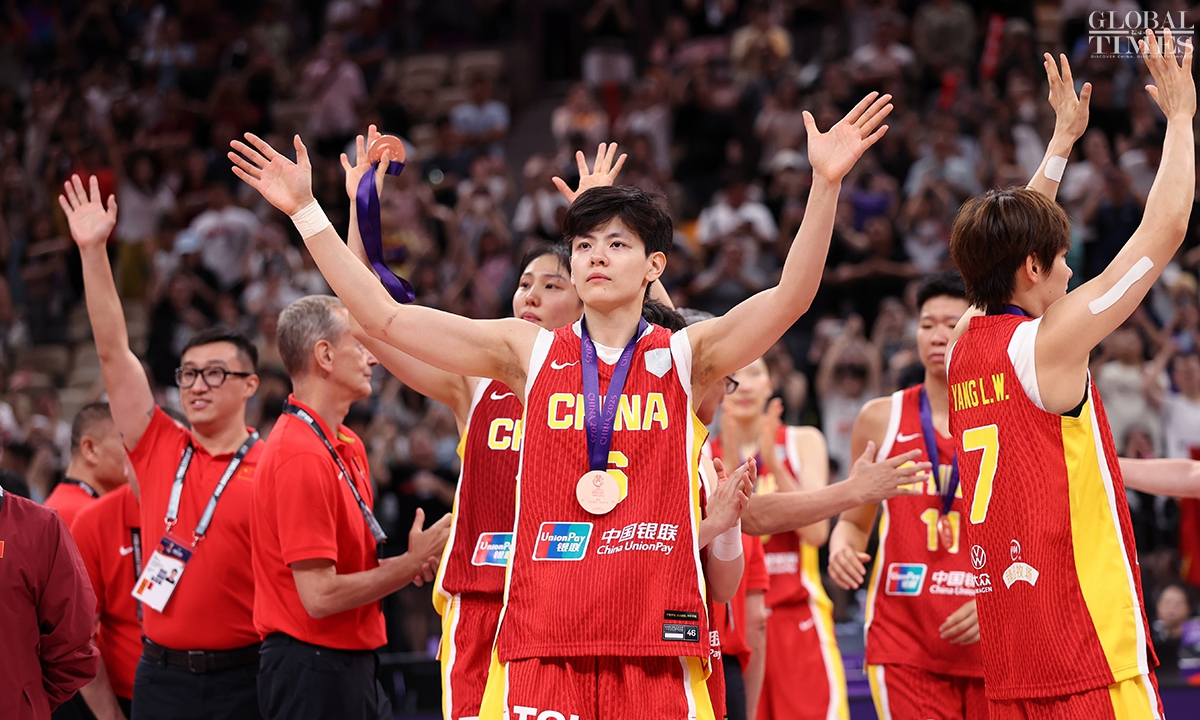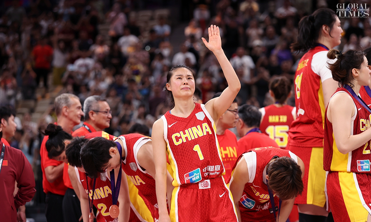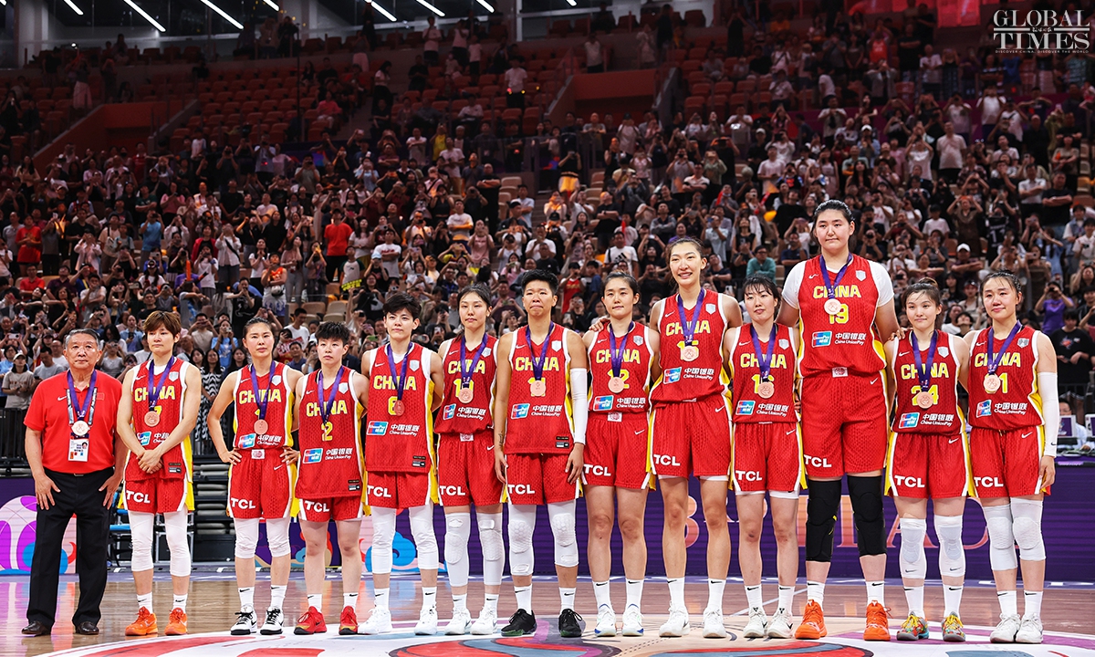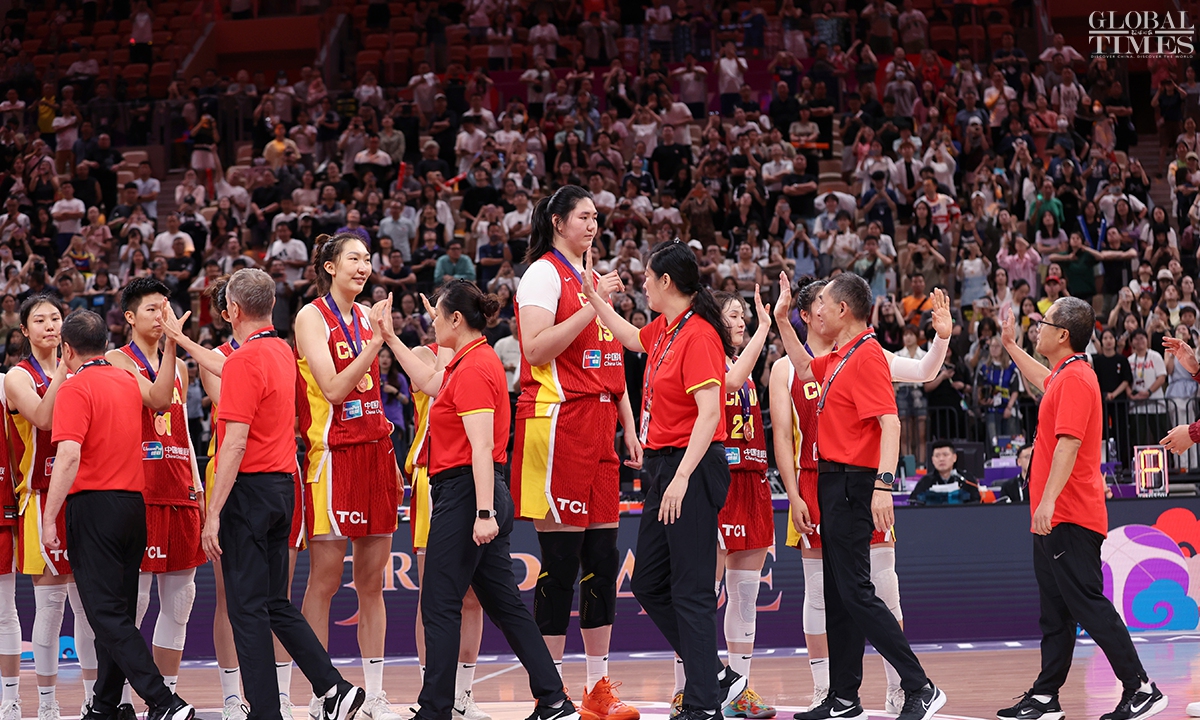 The Chinese women’s national basketball team finished their FIBA Asia Cup campaign in the third place after defeating South Korea 101-66 on Sunday in Shenzhen, South China’s Guangdong Province. The team players were awarded the bronze medal afterwards. Photos: Cui Meng/GT