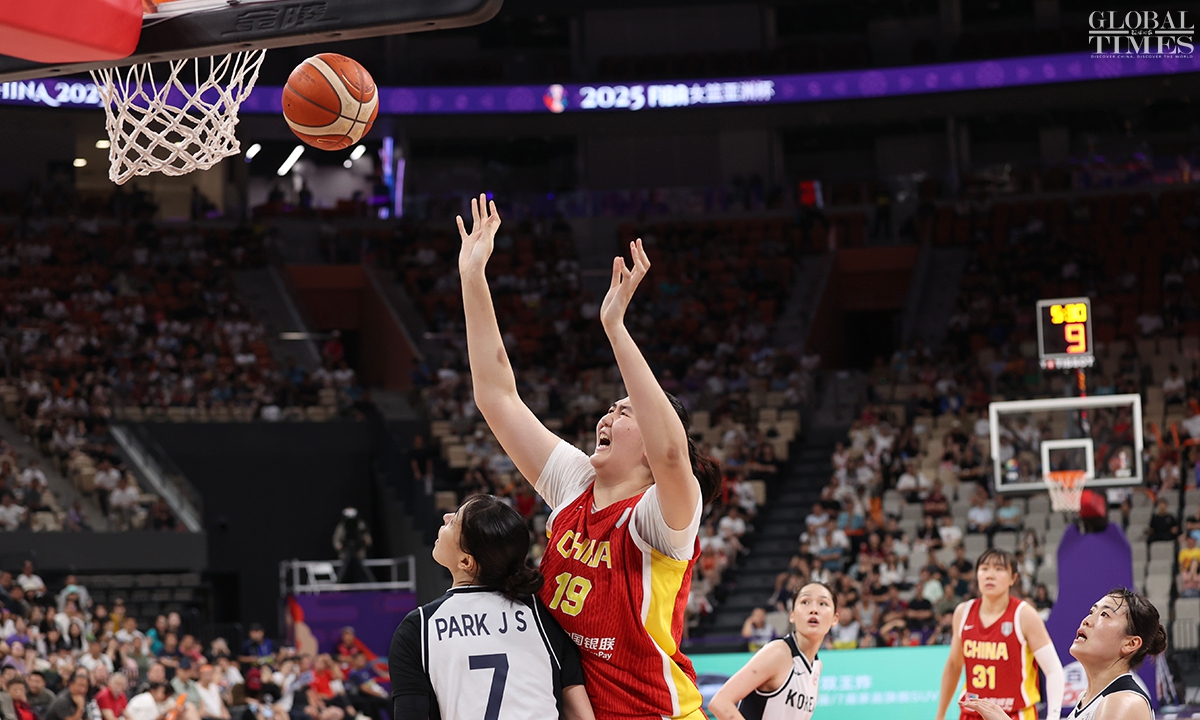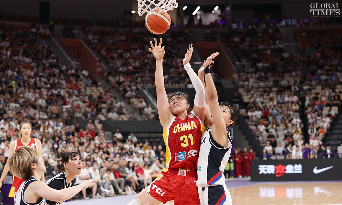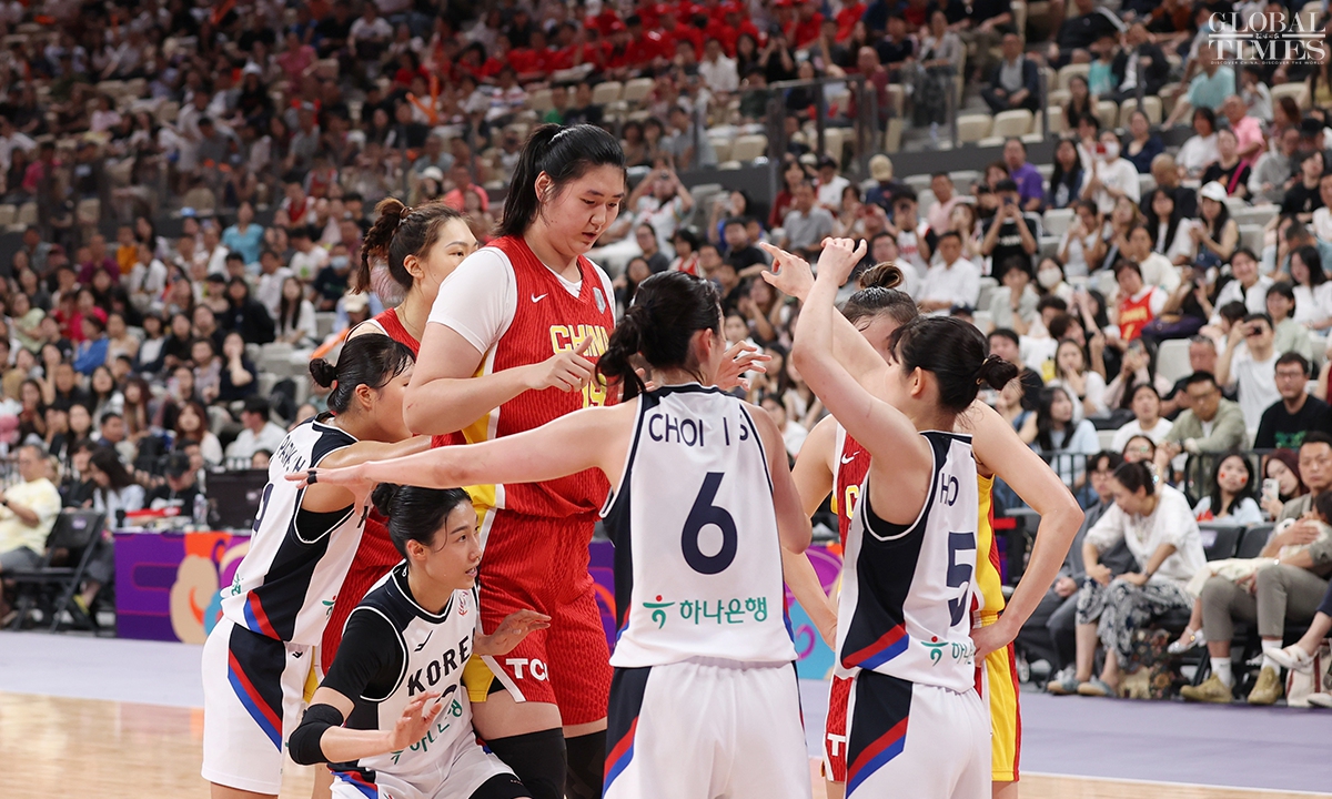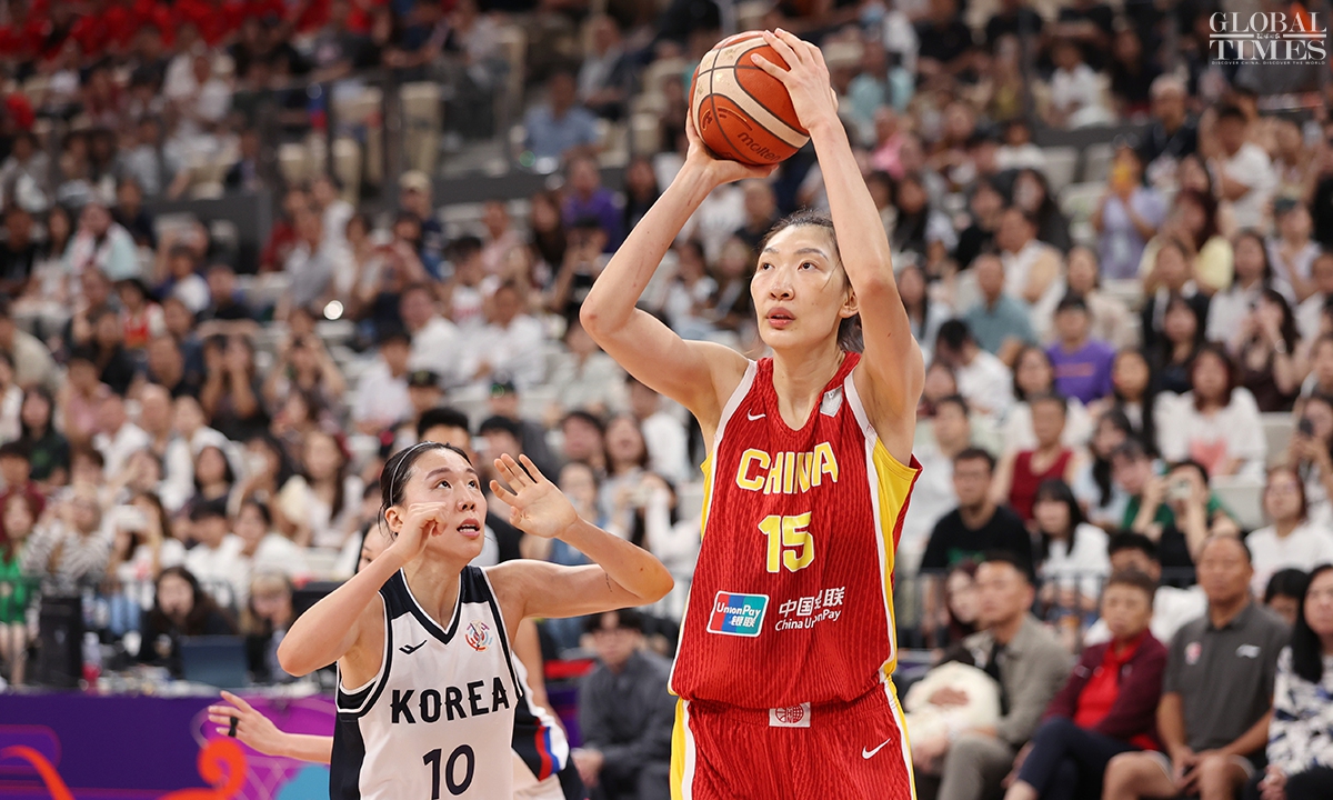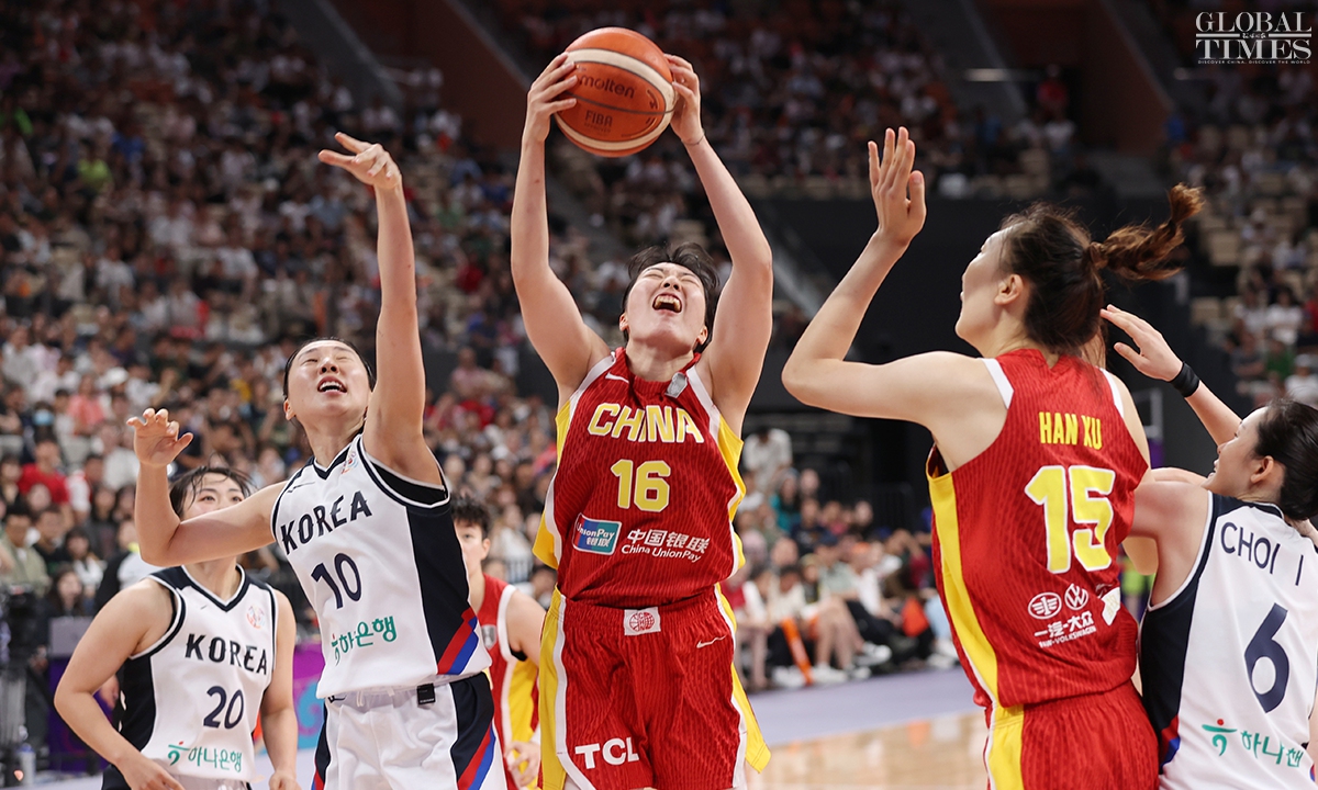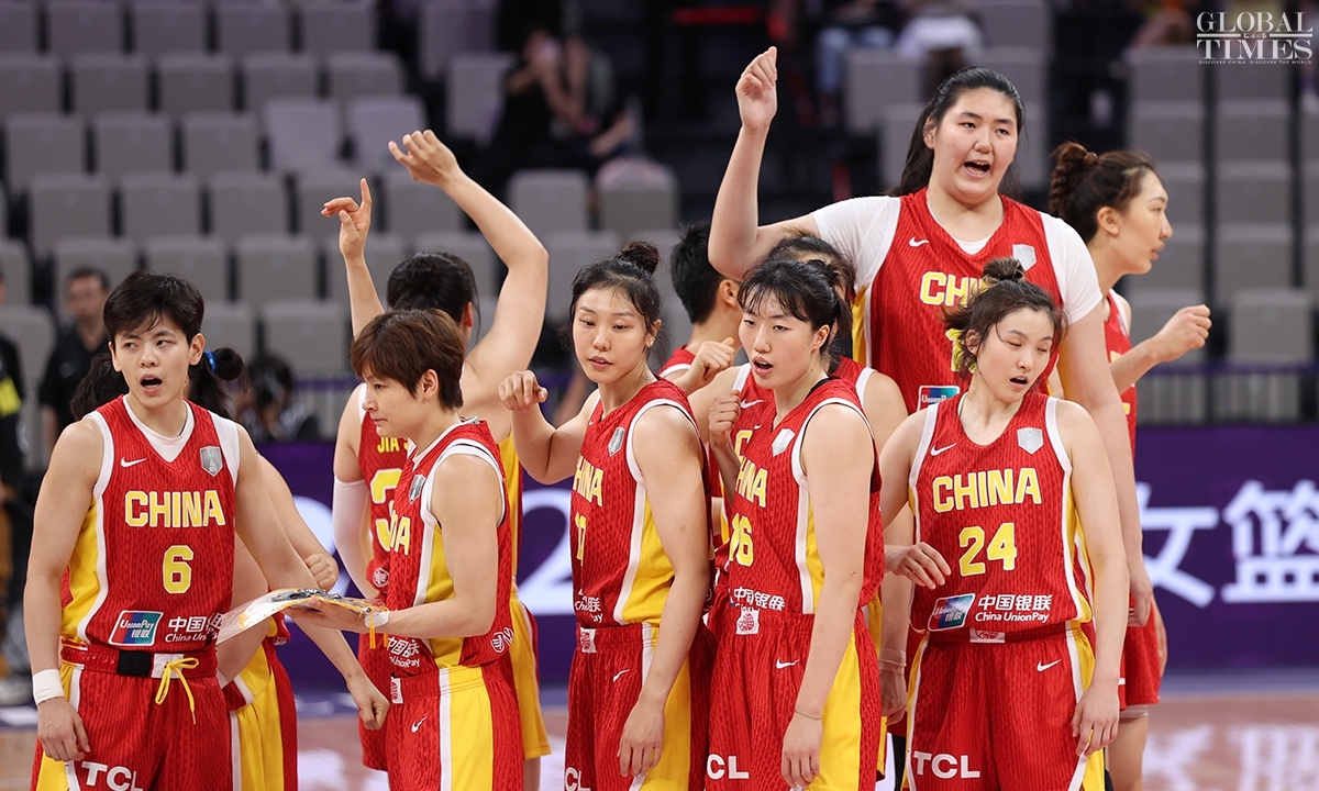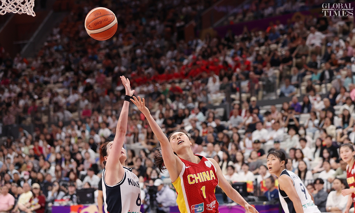 The Chinese women’s national basketball team finished their FIBA Asia Cup campaign in the third place after defeating South Korea 101-66 on Sunday in Shenzhen, South China’s Guangdong Province. The team players were awarded the bronze medal afterwards. Photos: Cui Meng/GT