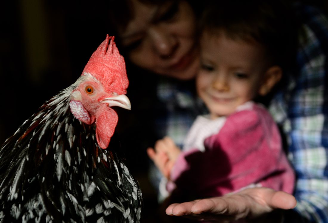 A child interacts with a rooster at the Yekaterinburg Zoo as part of the animal therapy program designed to help children with special needs integrate into society on February 16, 2017. Photo: Donat Sorokin/TASS/CFP figcaption >