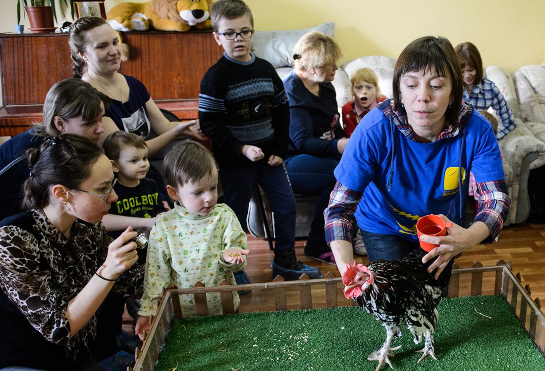 Children interact with a rooster at the Yekaterinburg Zoo as part of the animal therapy program designed to help children with special needs integrate into society on February 16, 2017. Photo: Donat Sorokin/TASS/CFP figcaption >