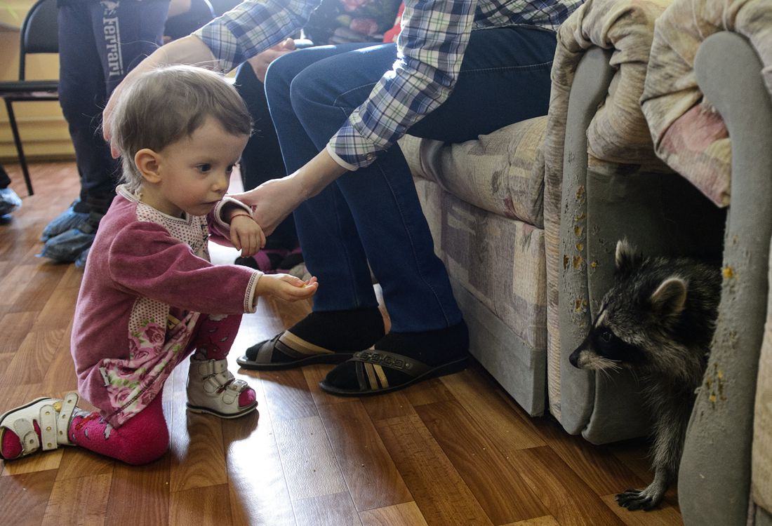 A child interacts with a raccoon at the Yekaterinburg Zoo as part of the animal therapy program designed to help children with special needs integrate into society on February 16, 2017. Photo: Donat Sorokin/TASS/CFP figcaption >