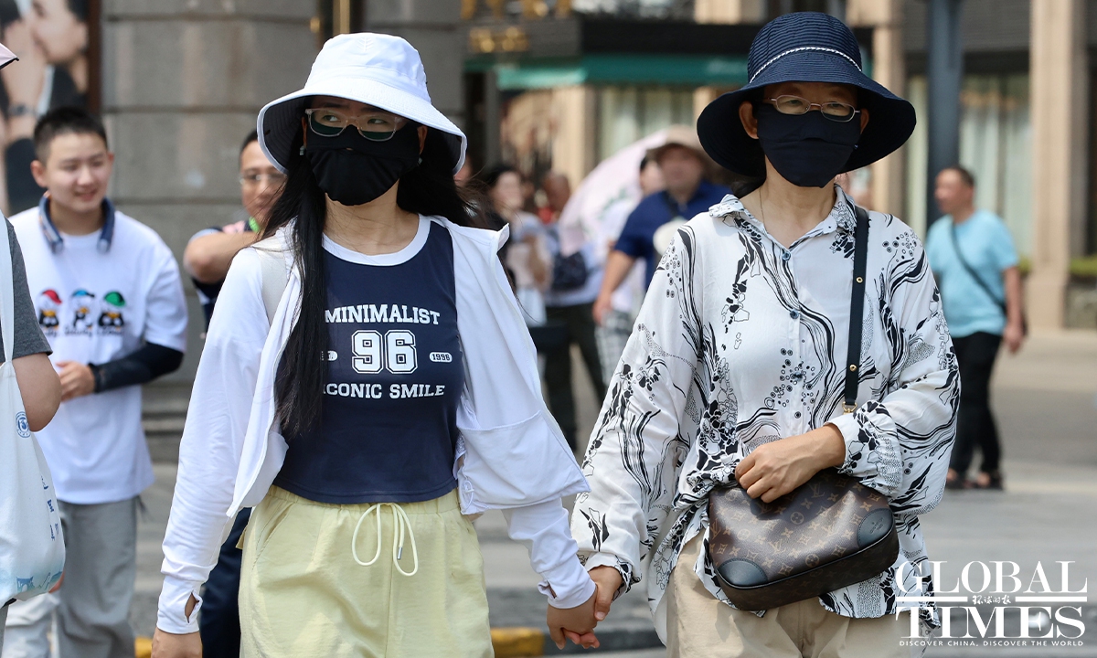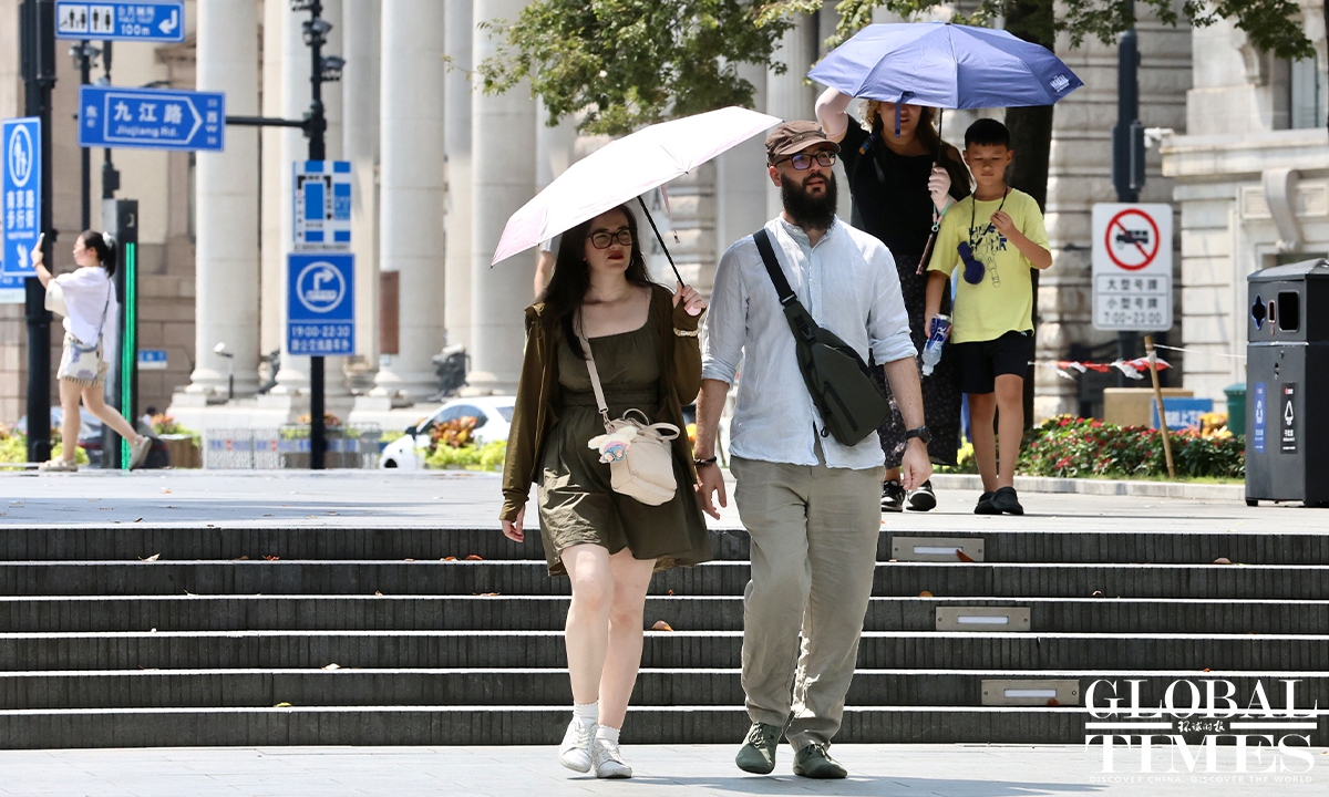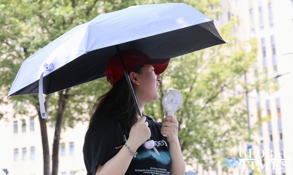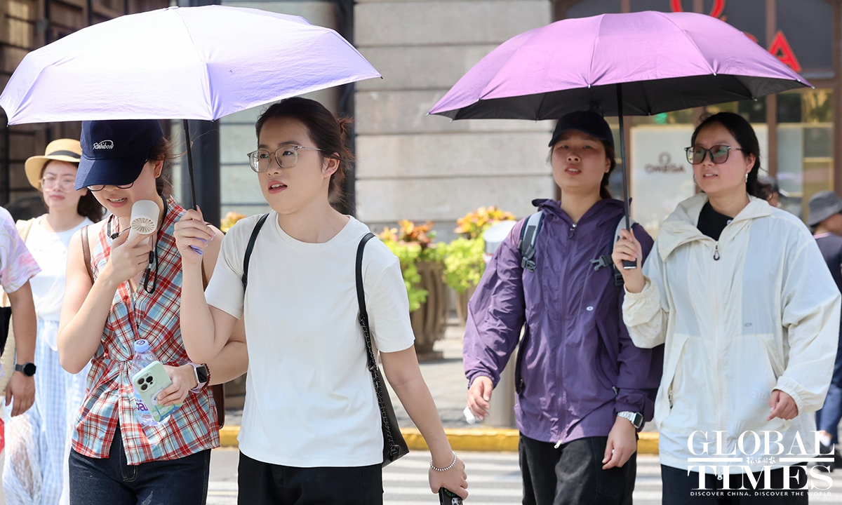 Residents in Shanghai endured a scorching day on Sunday as the municipal meteorological bureau issued a yellow high-temperature alert in the morning. At around 1 pm, the temperatures in Xujiahui station exceeded 35 C, according to the Shanghai Meteorological Service. According to Shanghai Fabu, the official WeChat account of the Shanghai municipal government, the city has recorded 27 high-temperature days in August as of Sunday, setting a new record for the highest number of heatwave days in August. Photos: Chen Xia/GT