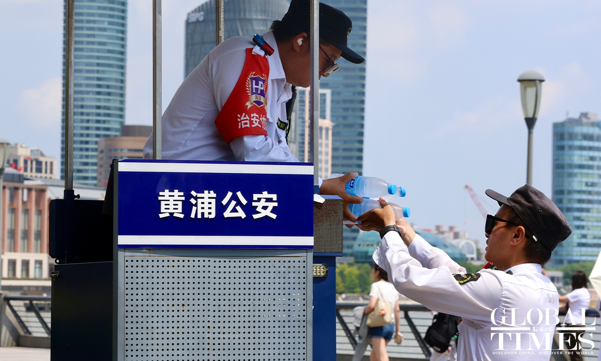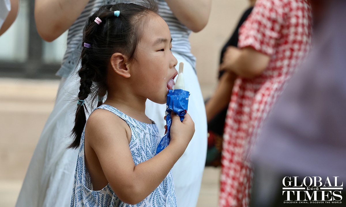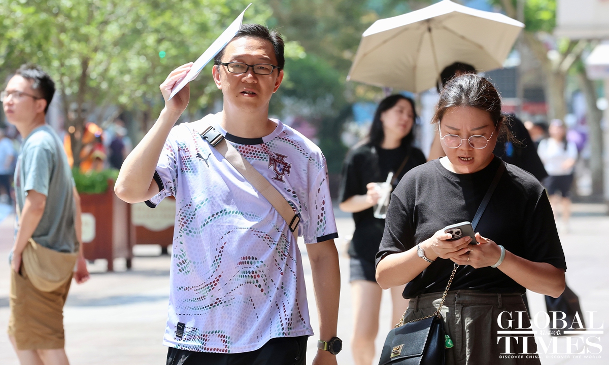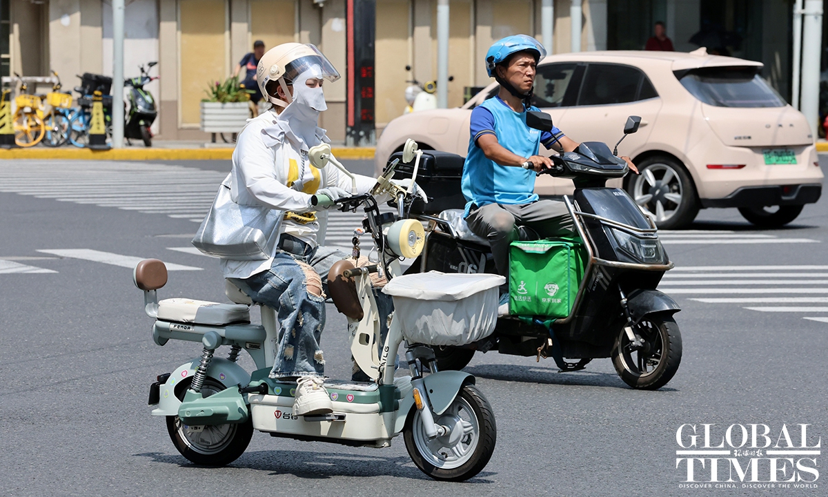 Residents in Shanghai endured a scorching day on Sunday as the municipal meteorological bureau issued a yellow high-temperature alert in the morning. At around 1 pm, the temperatures in Xujiahui station exceeded 35 C, according to the Shanghai Meteorological Service. According to Shanghai Fabu, the official WeChat account of the Shanghai municipal government, the city has recorded 27 high-temperature days in August as of Sunday, setting a new record for the highest number of heatwave days in August. Photos: Chen Xia/GT