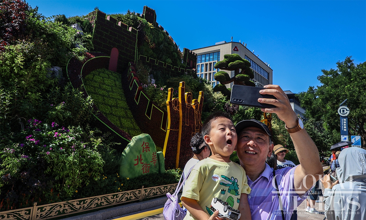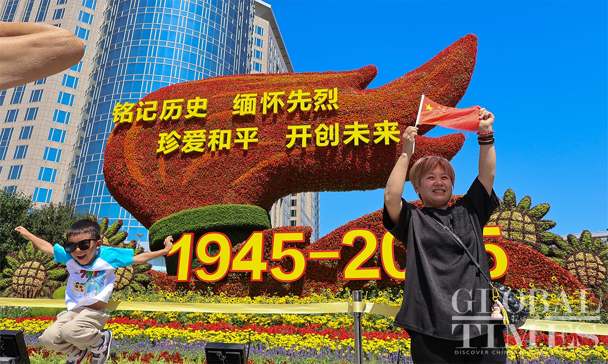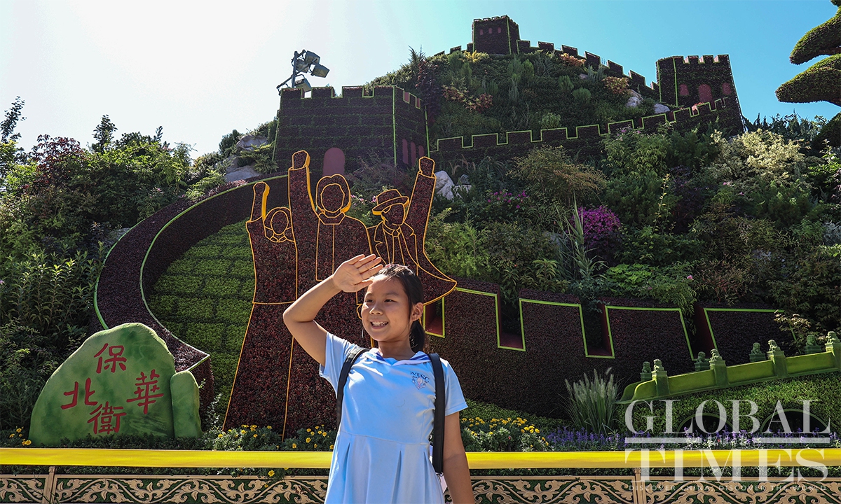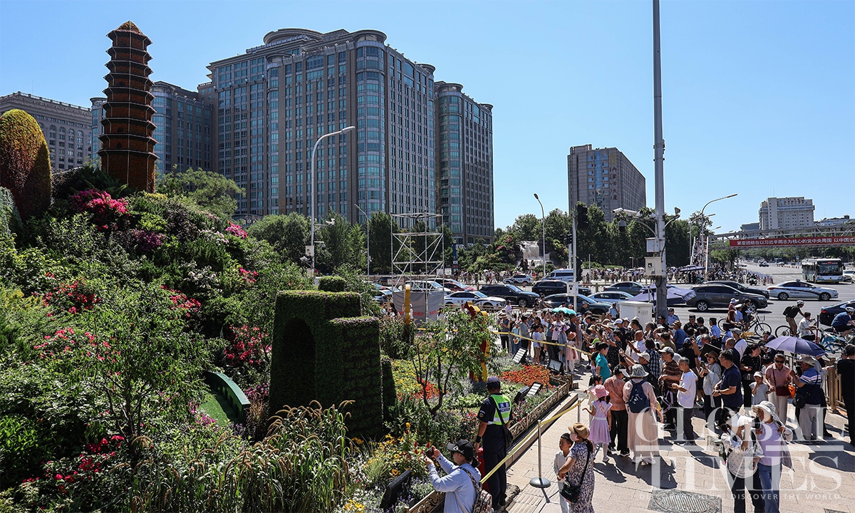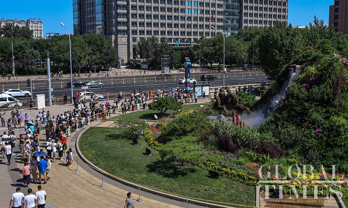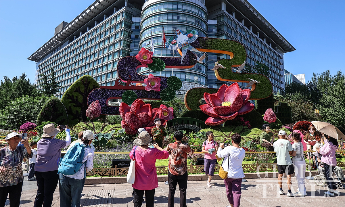The themed floral displays along Chang'an Avenue commemorating the 80th anniversary of the victory in the Chinese People's War of Resistance Against Japanese Aggression and the World Anti-Fascist War have attracted large numbers of visitors, with both residents and tourists eagerly taking photos. At the southeast corner of the Dongdan area in Beijing, one of the installations features the classic song "Yellow River Cantata," which plays every hour, creating a powerful synergy between music and landscape. (Photo: Li Hao/GT)