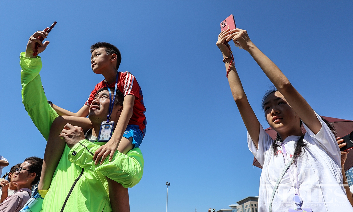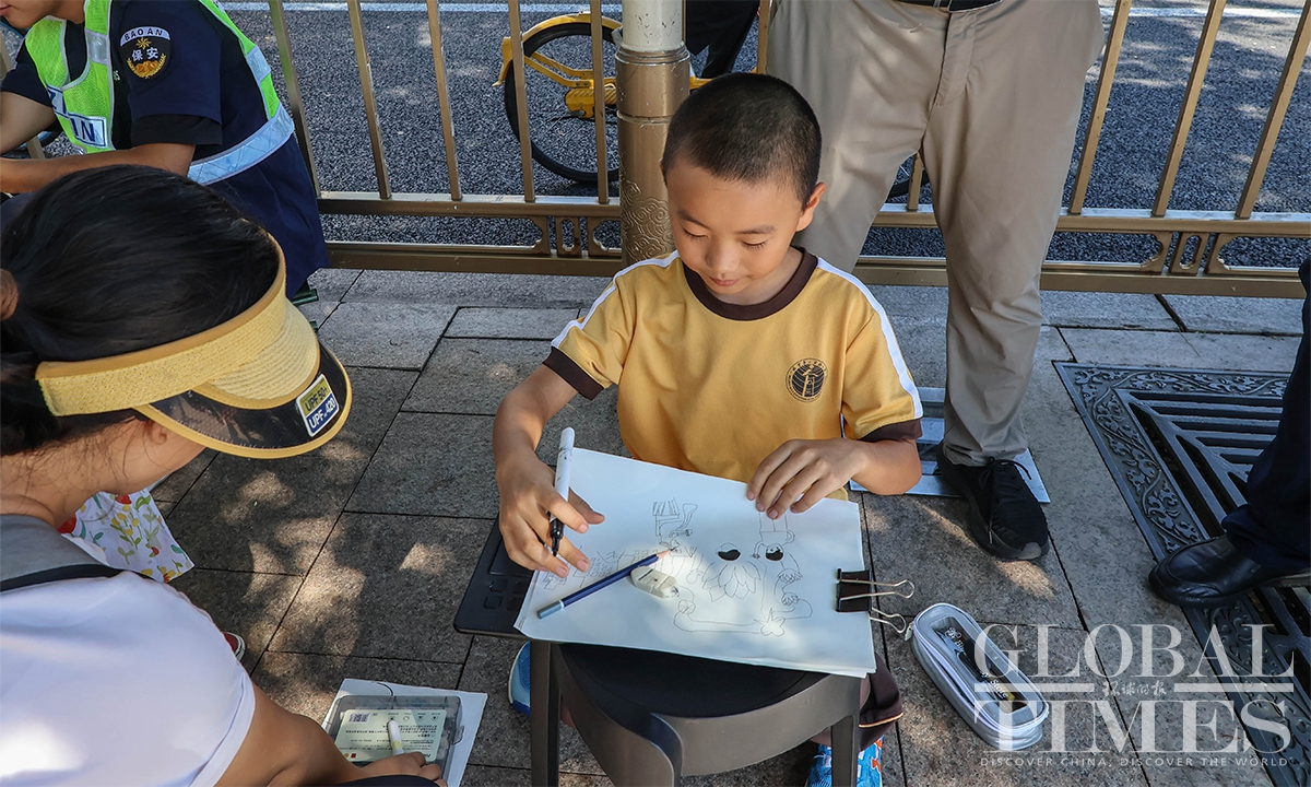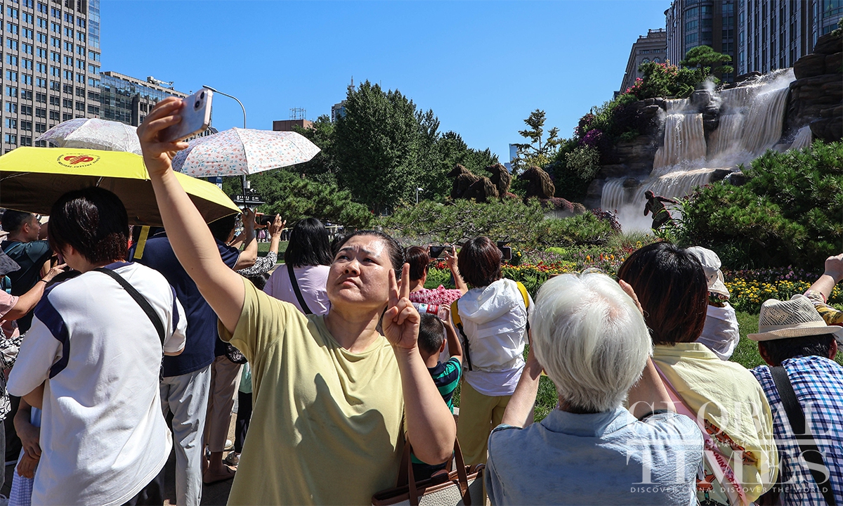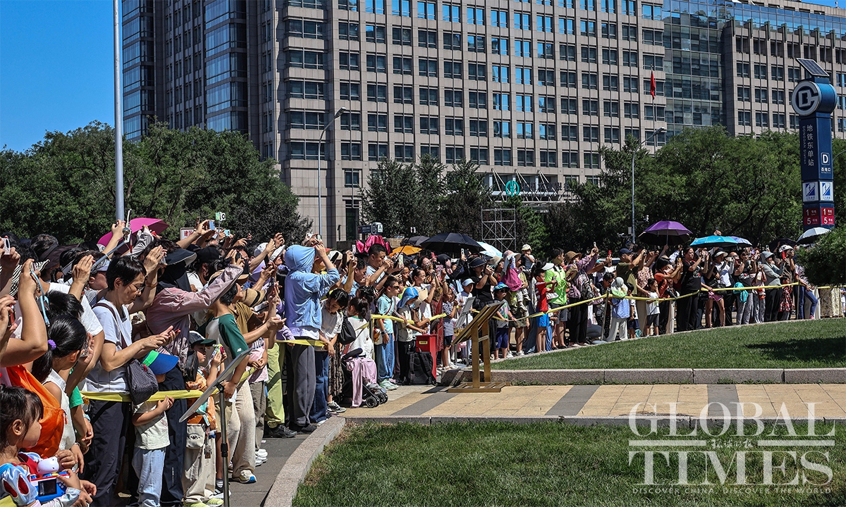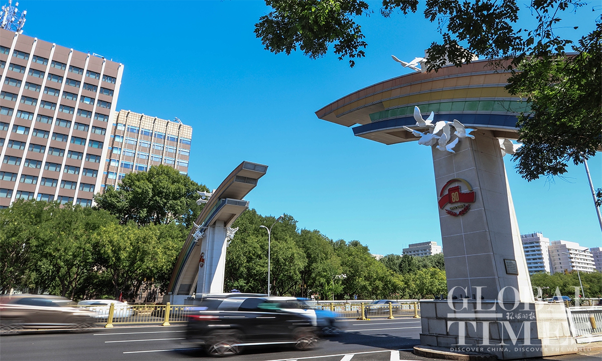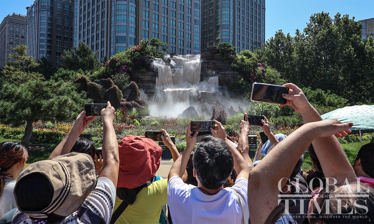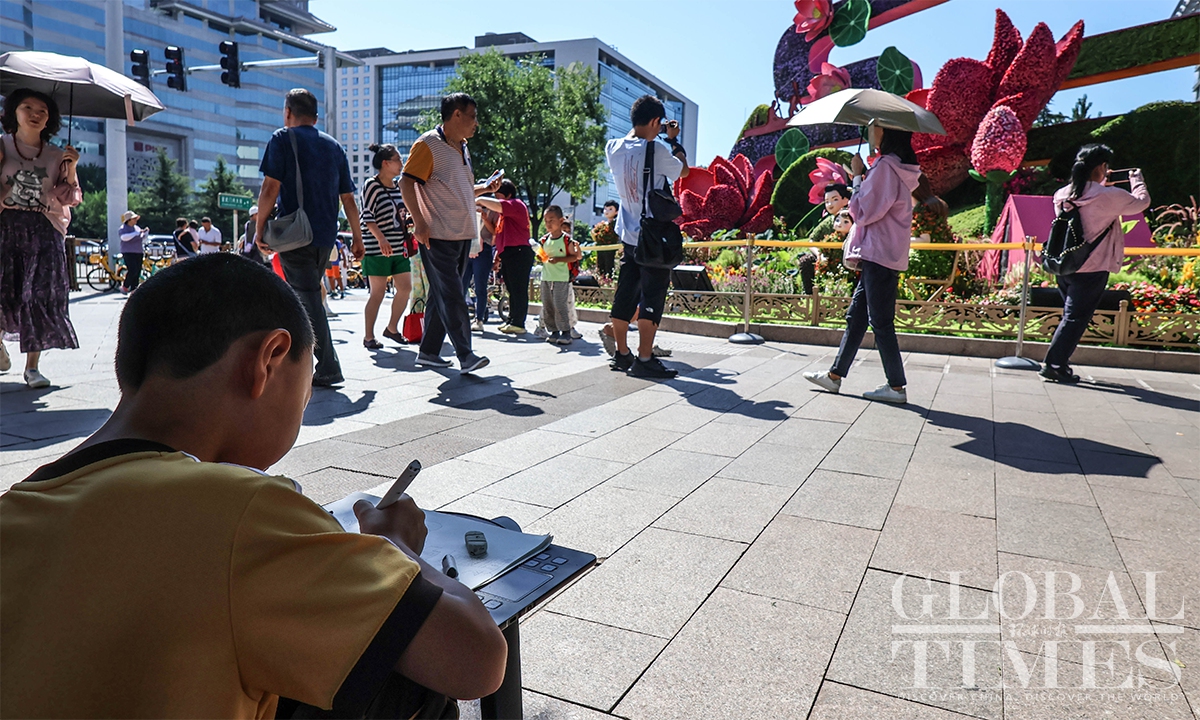 The themed floral displays along Chang'an Avenue commemorating the 80th anniversary of the victory in the Chinese People's War of Resistance Against Japanese Aggression and the World Anti-Fascist War have attracted large numbers of visitors, with both residents and tourists eagerly taking photos. At the southeast corner of the Dongdan area in Beijing, one of the installations features the classic song "Yellow River Cantata," which plays every hour, creating a powerful synergy between music and landscape. (Photo: Li Hao/GT)