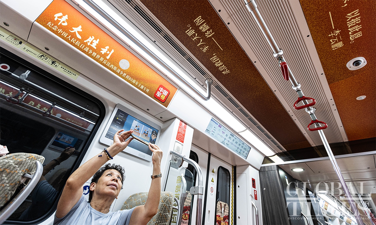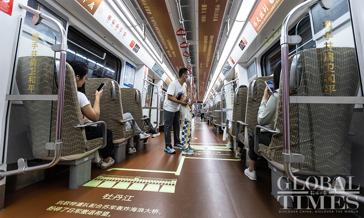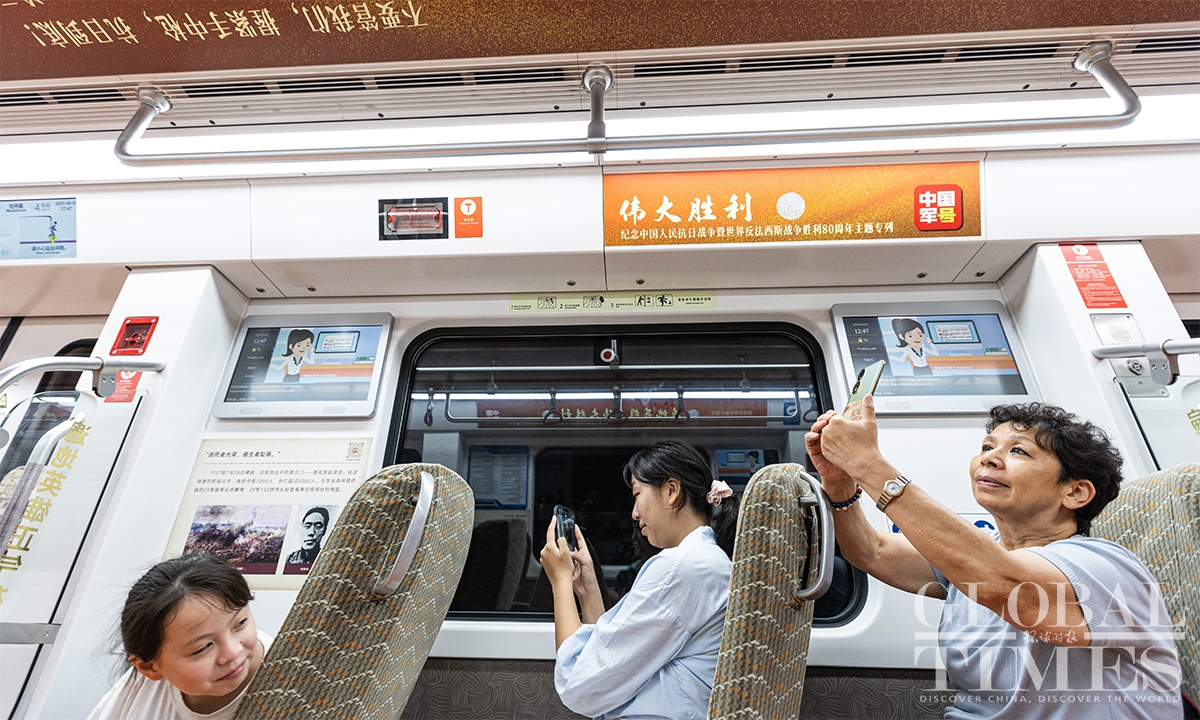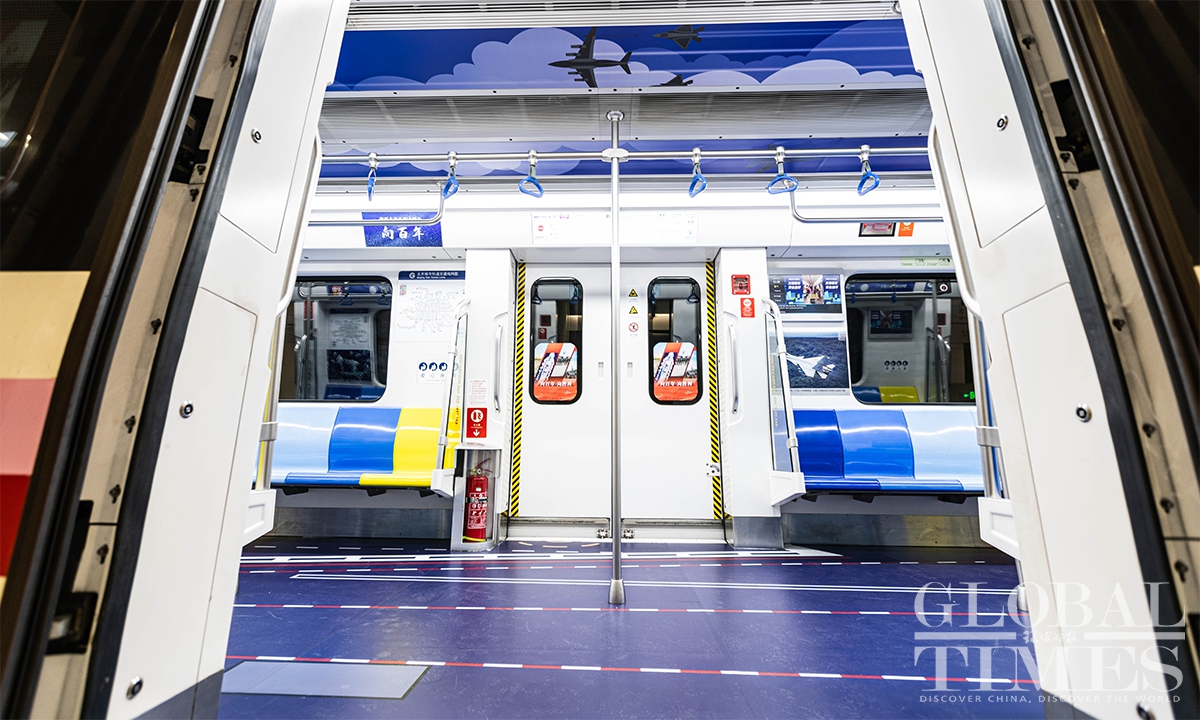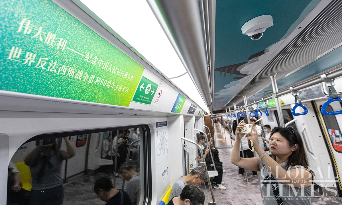 To commemorate the 80th anniversary of the victory in the Chinese People's War of Resistance Against Japanese Aggression and the World Anti-Fascist War, special subways themed on the "great victory" were officially put into operation on Beijing Subway Line 19 starting from August 31, 2025. Each carriage incorporates historical elements of the War of Resistance and the contemporary spirit of the Chinese military, allowing passengers to immerse themselves in history and the glory of the era during their commutes. (Photo: Li Hao/GT)
