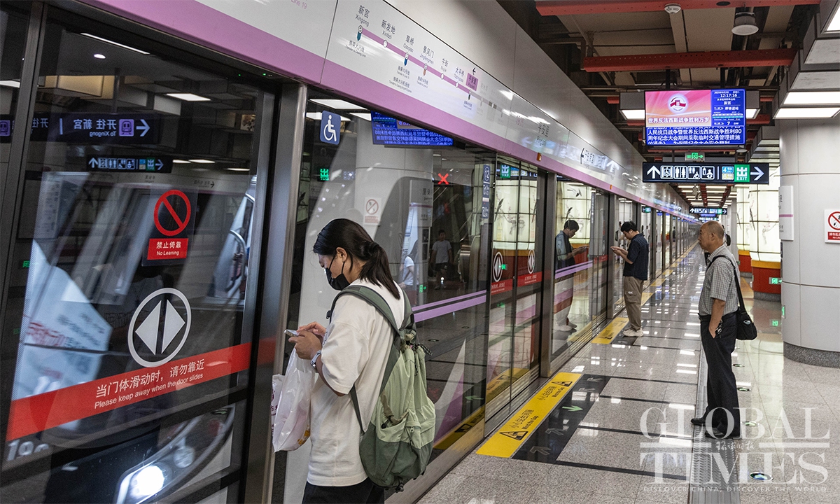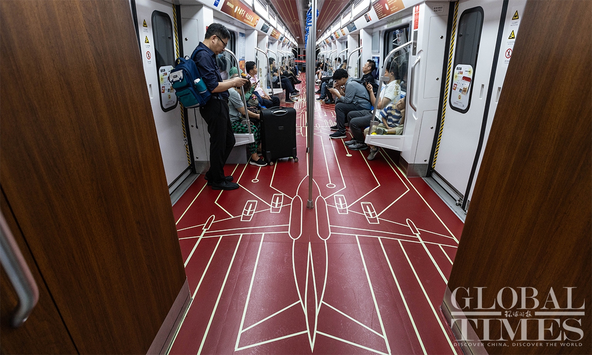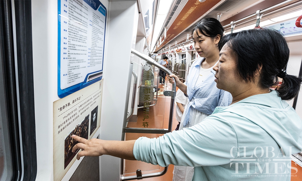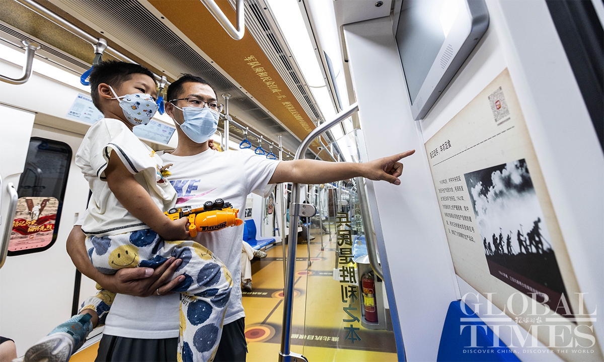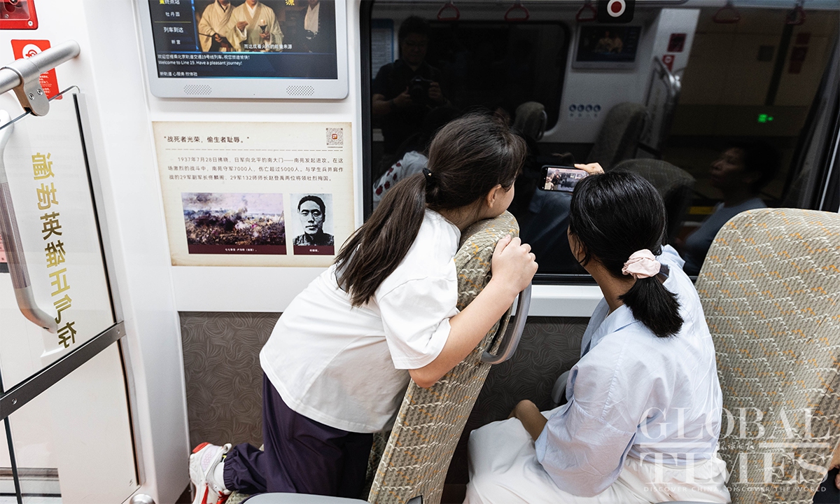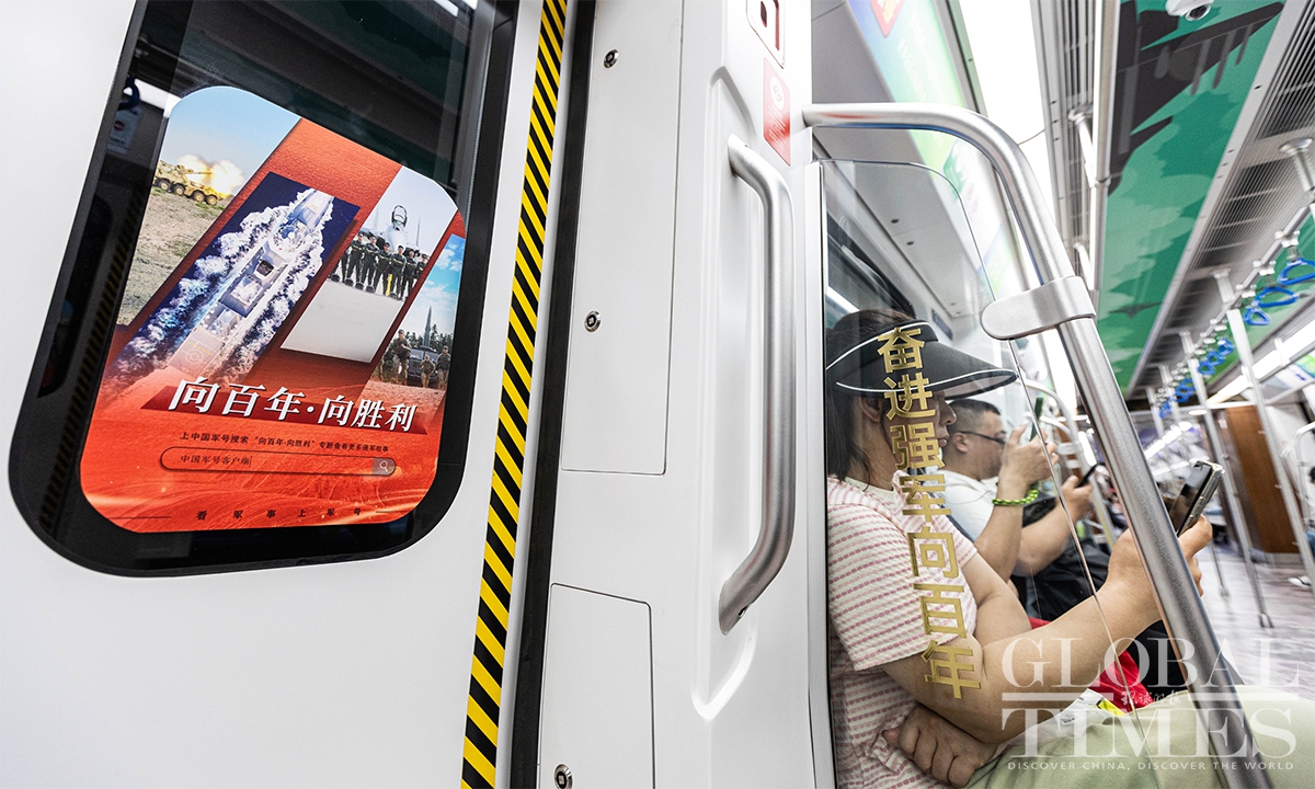 To commemorate the 80th anniversary of the victory in the Chinese People's War of Resistance Against Japanese Aggression and the World Anti-Fascist War, special subways themed on the "great victory" were officially put into operation on Beijing Subway Line 19 starting from August 31, 2025. Each carriage incorporates historical elements of the War of Resistance and the contemporary spirit of the Chinese military, allowing passengers to immerse themselves in history and the glory of the era during their commutes. (Photo: Li Hao/GT)