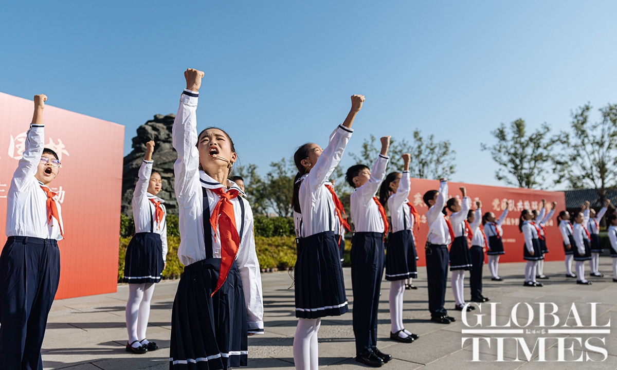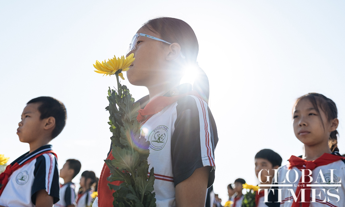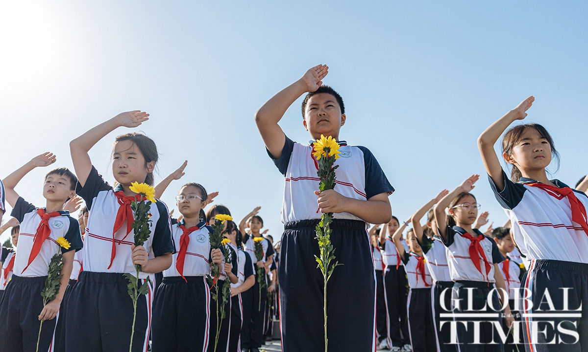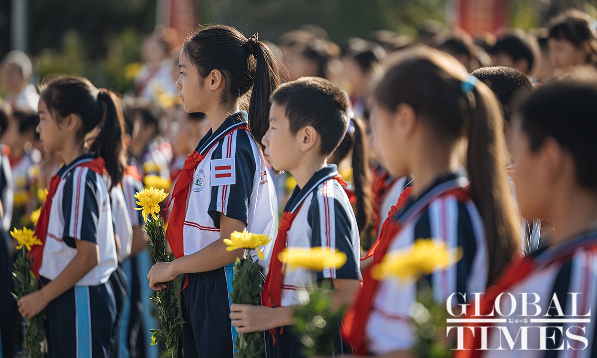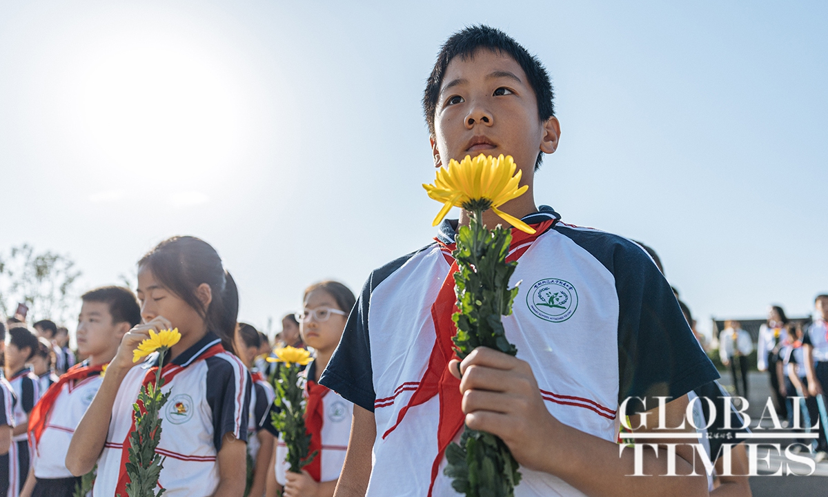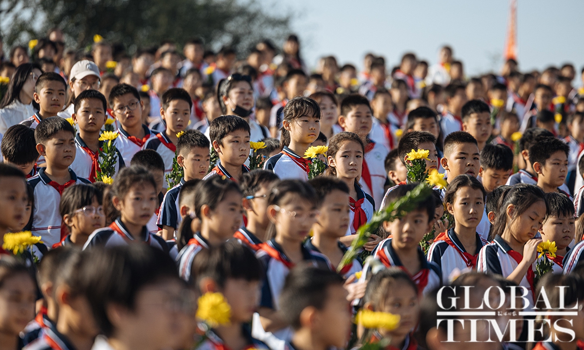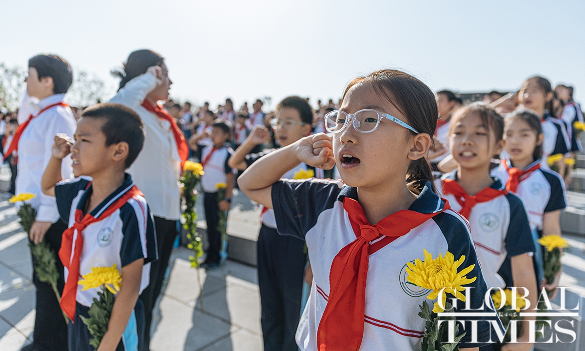 Nearly 1,000 primary school teachers and students gathered solemnly at the Awakening Lion Square of the Museum of the War of the Chinese People's Resistance Against Japanese Aggression on September 30 during China's 12th Martyrs' Day. They participated in thematic educational activities that guided teachers and students to honor revolutionary martyrs, carry forward the red gene, and strengthen their ideals and convictions through immersive ceremonial education and profound ideological lessons. Photos: Li Hao/GT